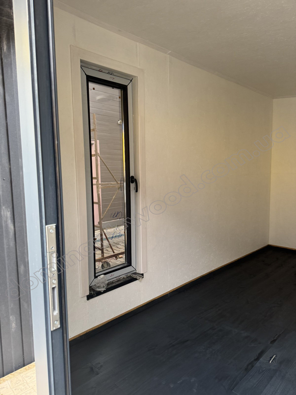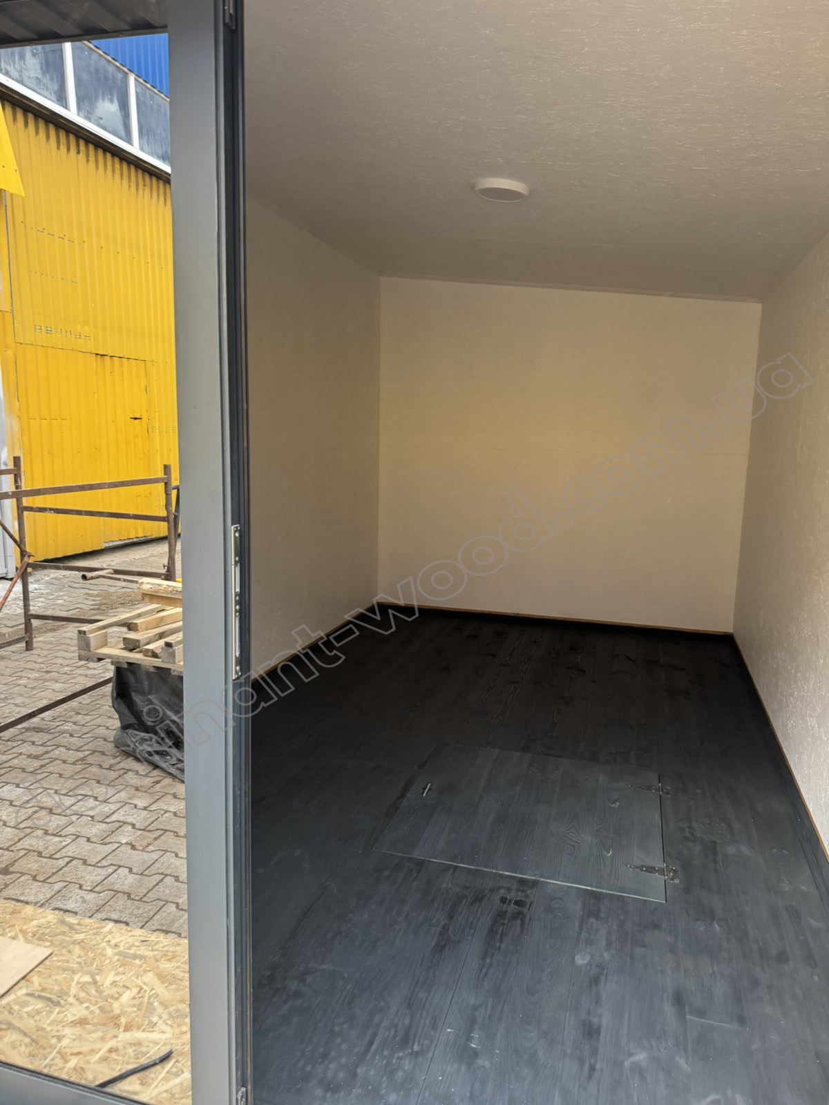 Индивидуальное проектирование всегда занимает немного больше времени и внимания, так как каждая деталь создается с нуля. Зато результат полностью оправдывает эти усилия - в итоге у вас есть пространство, созданное именно под ваши потребности, а не «как у всех». Итак, по запросам заказчика мы сделали размеры модуля, которые идеально вписались в его участок: 2,8×4,8 м, а общая площадь получилась 10,5 м². Внутри одно сплошное помещение без перегородок, обычная кладовая, где все под рукой и ничего не мешает. Высота потолка - 2,8 м. Очень интересно, что сама крыша сделана под наклоном, чтобы на ней не задерживался снег, и не собиралась дождевая вода, которая может испортить конструкцию. Но этот угол наклона спрятан среди квадратных очертаний домика, благодаря чему он выглядит очень мило, как настоящий прямоугольный сундучок.