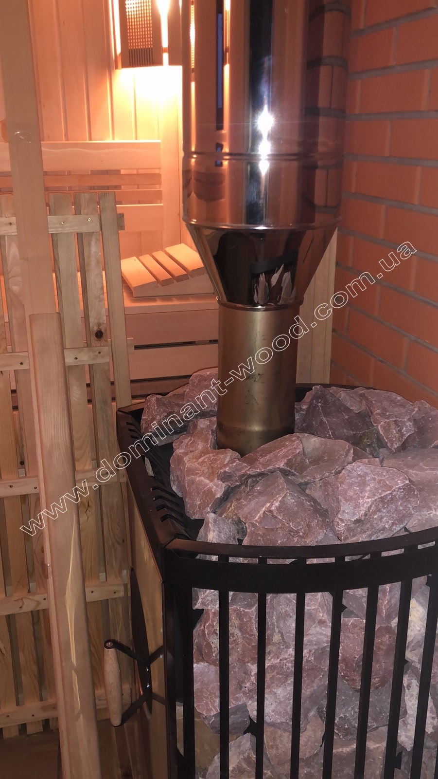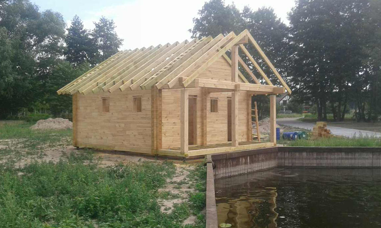Проект «Купата» отличается компактными размерами 7,1 на 6,2 м, общая площадь бани вместе с террасой у входа составляет 44,1 м2. Это позволяет поставить такое сооружение даже на небольшом дворе в условиях плотной городской застройки. Еще гармоничнее баня будет смотреться на лоне природы или на берегу водоема. Как раз одна из реализаций проекта была на берегу одного из притоков Днепра, как видно на фото реализации проекта.
