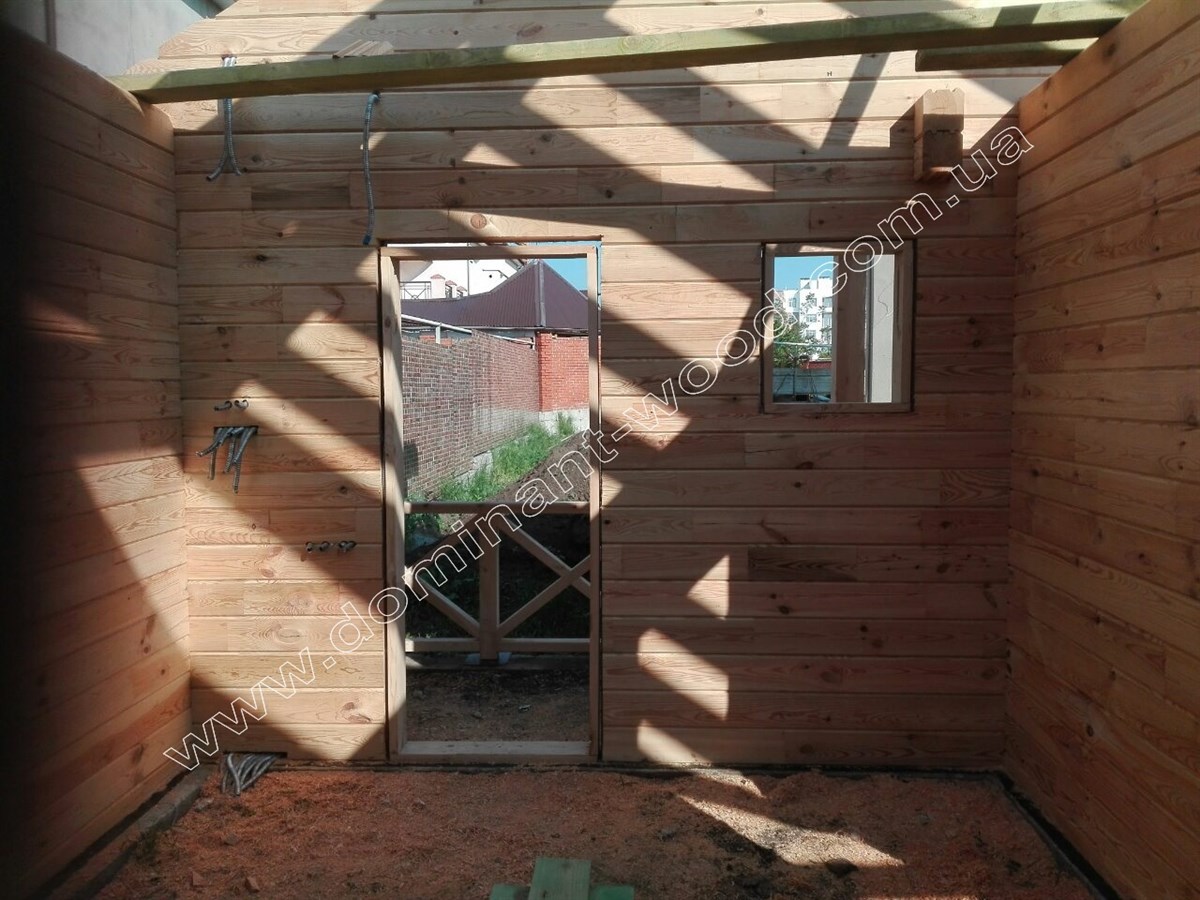 Проект бани «Купата» выполнен из просушенного соснового бруса. Каждое бревно стенового комплекта имеет размер 200х150 мм. Такая толщина сосновых стен имеет хорошую теплоизоляцию, ведь по показателям коэффициента теплопроводности 200 мм сосны эквивалентно 890 мм кирпича. Это свидетельствует о том, что баня будет быстро нагреваться и долго удерживать тепло. Кроме этого, сухой брус не в такой степени подвержен процессам усадки, характерным для оцилиндрованного бревна, и является одним из лучших материалов в эксплуатации. Соответственно, и самым дорогим, но высокая стоимость комплекта строения из профилированного бруса компенсируется минимальной необходимостью отделки. Стены из строганых на четырехстороннем станке брусьев нужно только покрасить снаружи с добавлением цвета для защиты от атмосферных явлений, а внутри достаточно нанести бесцветный воск.