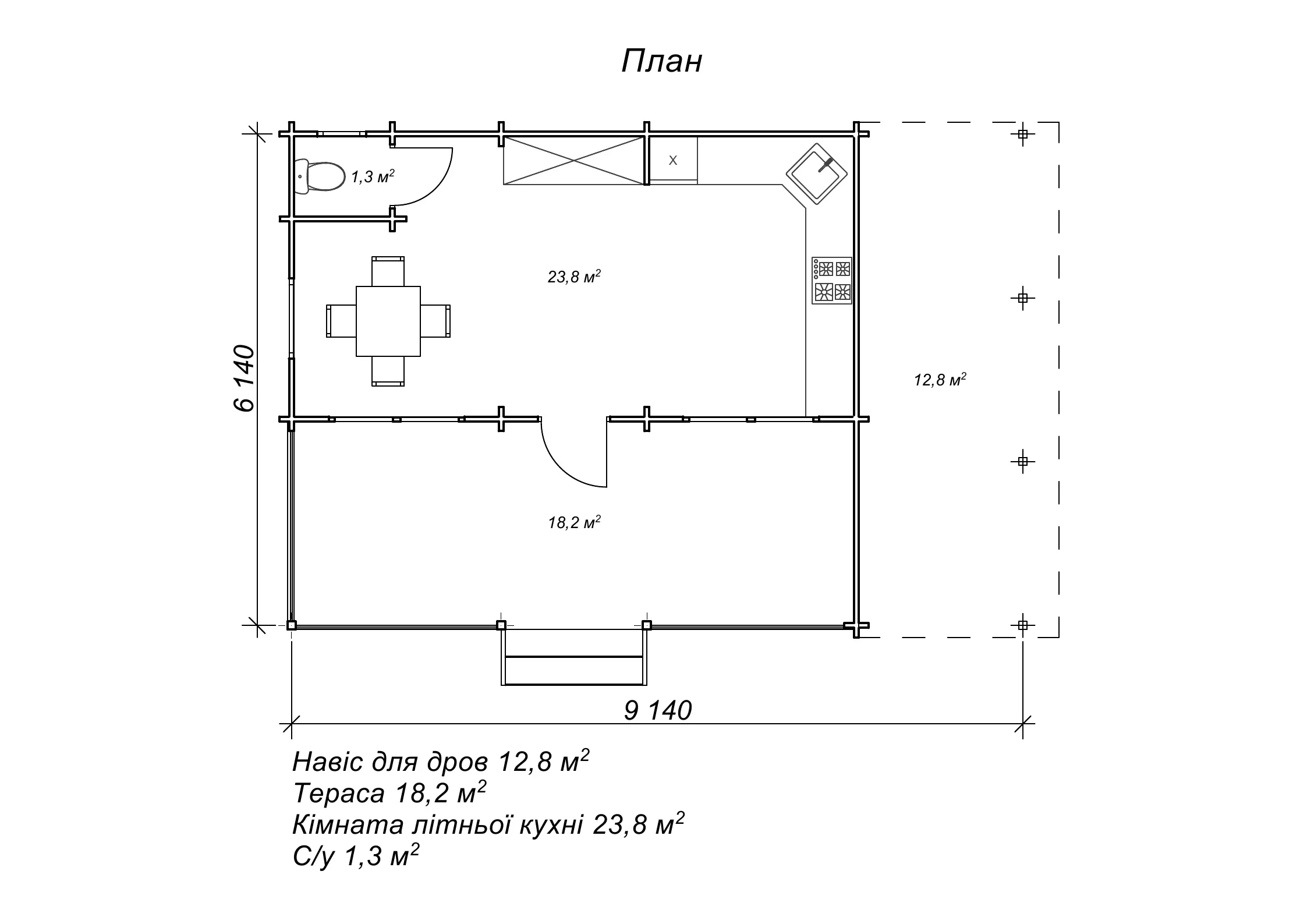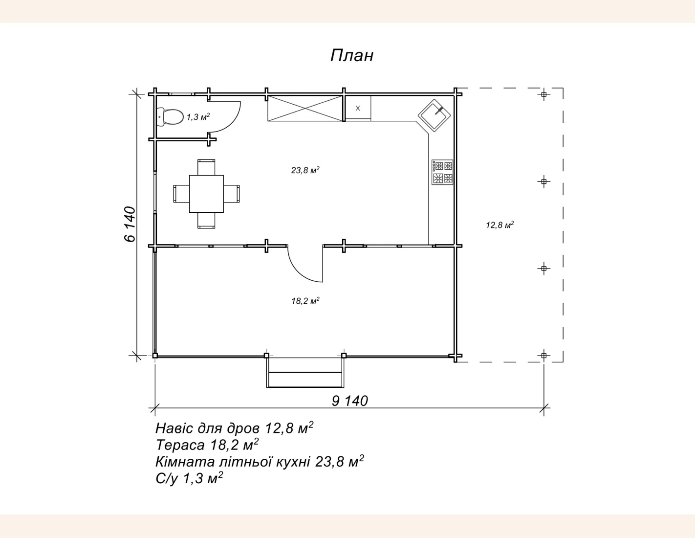 Планировка летней кухни с террасой охватывает площадь 56,1 м2. Размеры сооружения составляют 6 на 9 метра, что делает его удобным для расположения на любом участке. План состоит из просторной комнаты площадью 23,8 м2 и открытой зоны под навесом площадью 18,2 м2. Также возле постройки предусмотрено наличие навеса-дровника, занимающего 12,8 м2. Внутри комнаты можно удобно организовать летнюю кухню или зону отдыха, а на террасу выносить обеденные столы с лавочками для приятных обедов на свежем воздухе. Обратите внимание на наличие санузла в проекте «Ривай». Такая комфортная планировка обязательно понравится владельцам баз отдыха, которые могут сдавать в аренду уютную комнату с террасой для проведения праздничных вечеринок и отдыха на природе. «Ривай» выполняется под заказ после заключения договора подряда, который можно просмотреть в разделе «Документы» на нашем веб-сайте. Мы также предоставляем сертификаты для обработки деревянных конструкций огнебиозащитой и другие документы, касающиеся наших изделий и услуг. По всем вопросам по проекту «Ривай», пожалуйста, свяжитесь с отделом обслуживания клиентов по указанным в контактах номерам телефона.