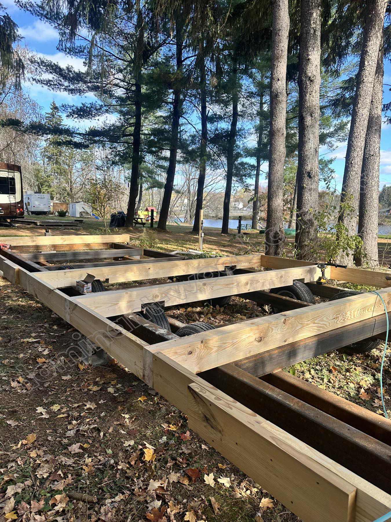 В результаті обговорення бажаних клієнтами конструкцій для бази відпочинку, ми розробили для них індивідуальні проєкти дуплексів трикутної форми з брусу 60*150 мм. Враховуючи, що весь конструктив A-frame котеджу знаходиться під дахом, такого тоненького брусу сповна хватить при умові належного утеплення. Параметри забудови дуплексу склали 3,5 м на 12,2 м. Площа - 43,3 м2. Ці видовжені, трикутні будівлі виглядають досить незвично і схожі на продовгуватий вагончик з входами, розташованими з протилежних боків. Всередині лише кімната і санвузол. Що ще потрібно для усамітнення десь на природі, поблизу мальовничого Онтаріо? Це не просто компактне житло - це комфортна міні-архітектура, що робить природу головним інтер’єром!