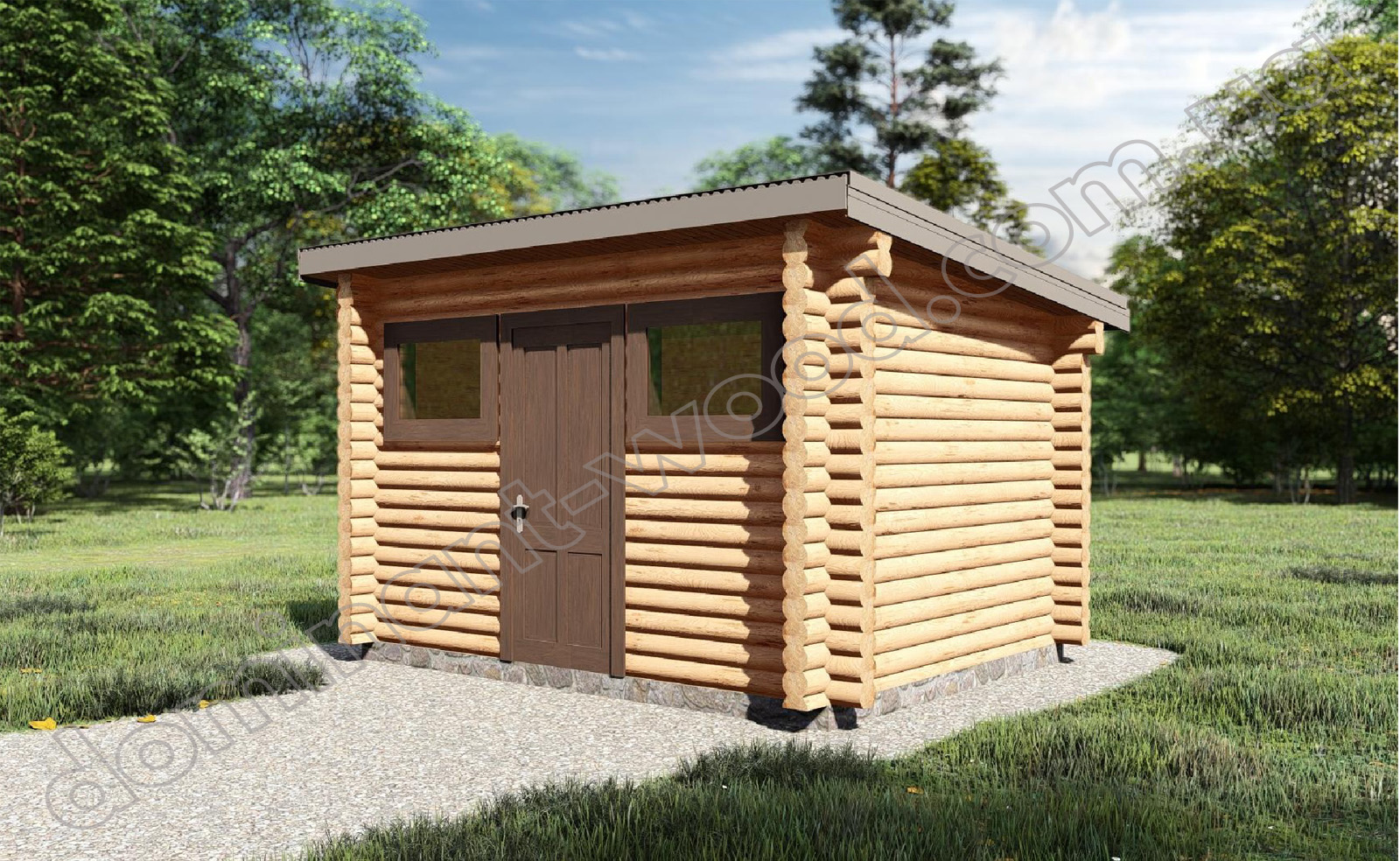 Мініатюрний, колодчастий будиночок є дуже доречним на будь-якій ділянці - житловій чи дачній, адже він одночасно вирішує побутові задачі й гармонійно доповнює простір. Цілком можливо, саме такої господарської споруди вам і не вистачає, щоб упорядкувати ділянку та зняти зайве навантаження з основного будинку? З першої розмови замовник чітко розумів, чого хоче від свого технічного будиночка. Йому був потрібен компактний, акуратний сарайчик просто на подвір’ї - такий, що не захаращує простір і доповнює стиль інших споруд на ділянці. Отже, в результаті був узгоджений проєкт мініатюрного будиночку 3,8 на 2,8 м максимально простої і лаконічної архітектури з односхилим дахом. Два віконця симпатично розташовані, ніби величезні очі, по обидва боки від дверей. Привабливий садовий будиночок стане зручним місцем для потрібних в господарстві речей і чудово підкреслить стиль колодчастої баньки, розташованої поруч.