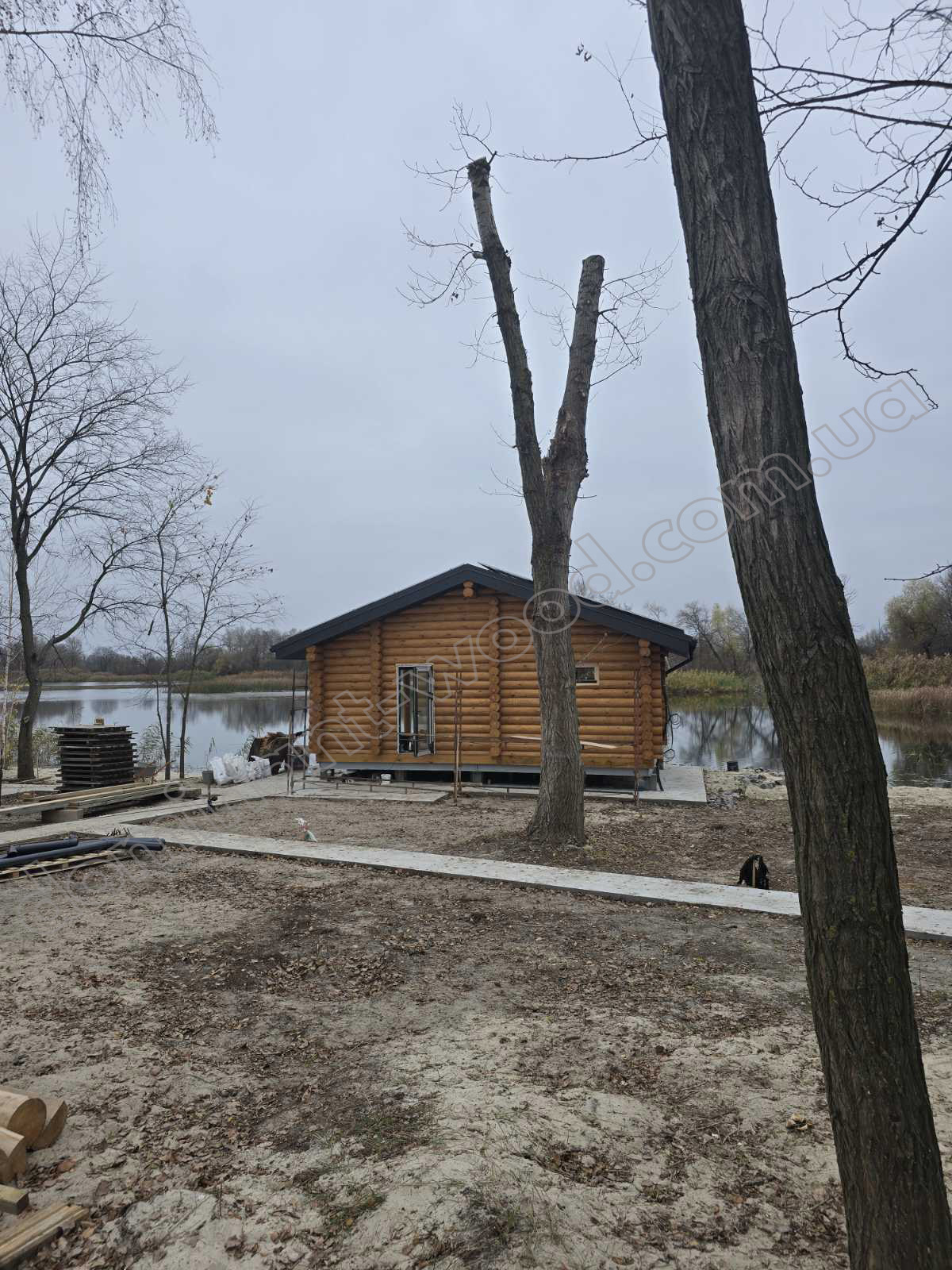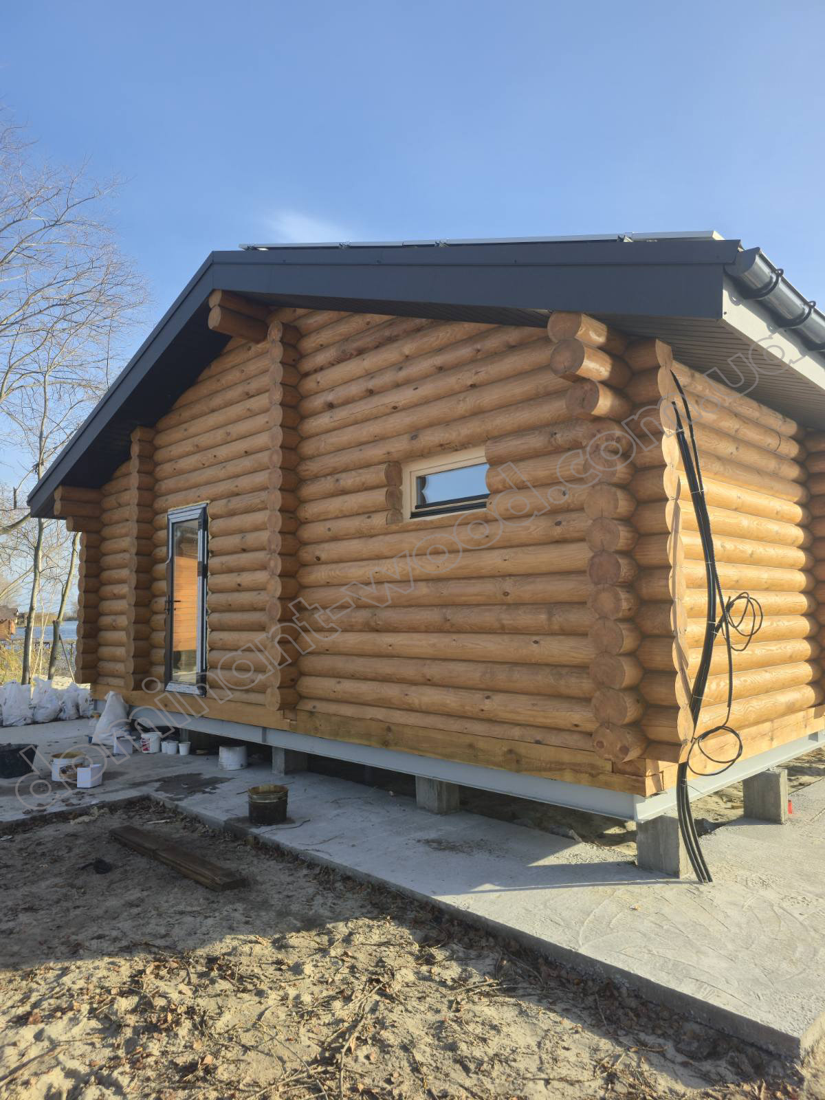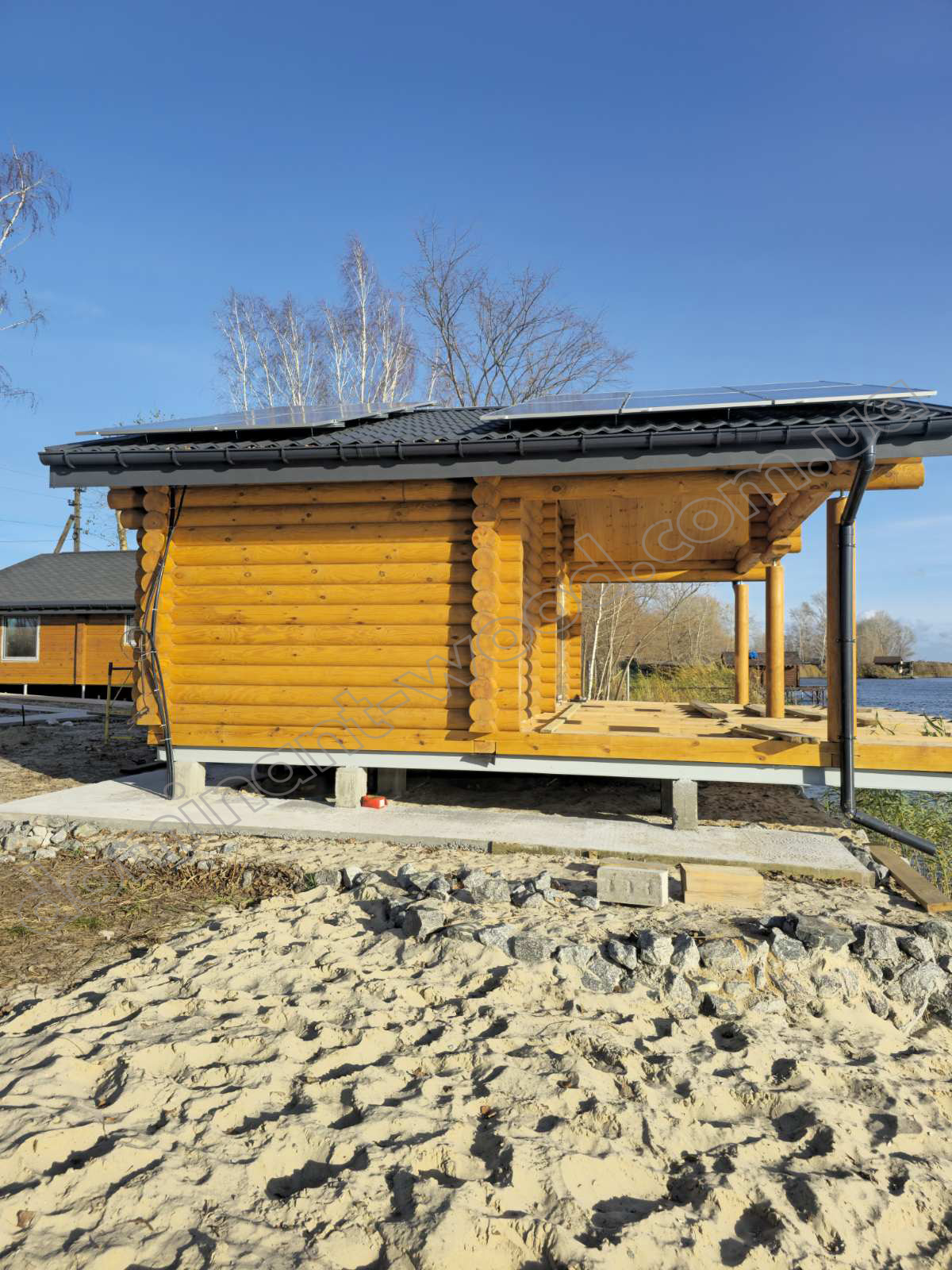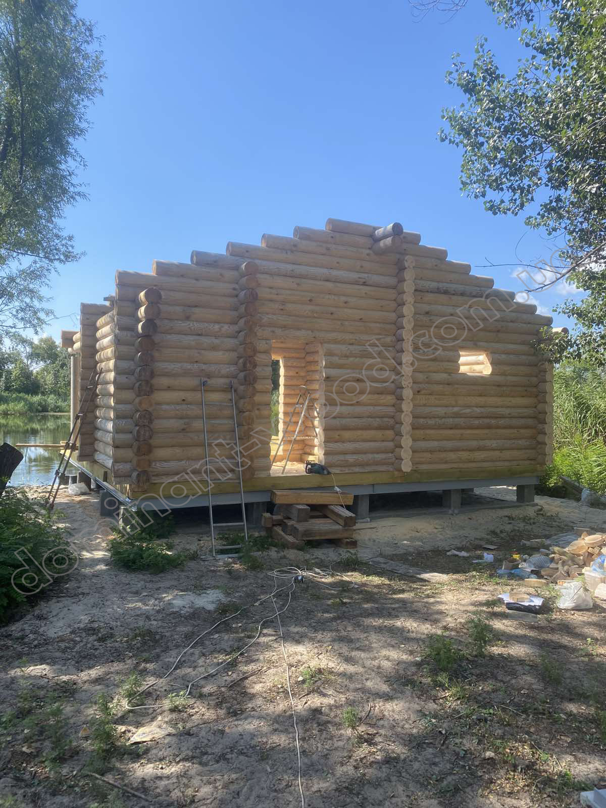 Якщо вже й будуватися на березі річки, то як же без теплої, колодчастої баньки? Тому, збудувавши житло, клієнт побажав отримати біля себе ще й лазню, в якій все було б передбачене все необхідне для комфортного релаксу: простора парилка площею 10 м² та тераса, де господар з друзями зможуть провести час після процедур, споглядаючи річкові краєвиди. Для будівництва клієнт обрав колоду діаметром 220 мм. Такий матеріал добре тримає тепло, дозволяє економити на опаленні й швидко прогріває приміщення, забезпечуючи стабільну температуру всередині. Враховуючи усі ці запити, ми залюбки розробили клієнту індивідуальний проєкт лазні, саме такої, яку він і бажав.