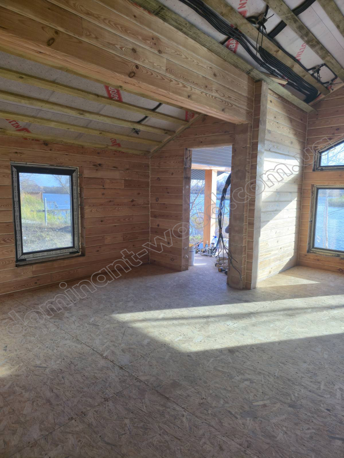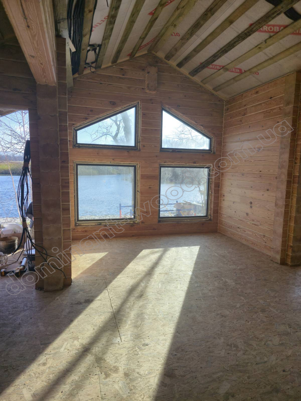 У котеджі «Айрінвін» передбачено все, що потрібно для зручного заміського життя. Всередині розміщені кухня-студія, дві спальні та санвузол. Кухня-студія має чітко окреслені функціональні зони: передпокій, невеликий м’який куточок, робочу поверхню й обідню частину. Окрема особливість цього проєкту - нестандартна висота стін. Бічна стіна має 1,8 м, а у найвищій точці, на конику покрівлі, висота сягає 3,4 м. Завдяки цьому будівля отримує цікаву геометрію і особливий характер. Такий формат точно оцінять ті, хто шукає унікальну архітектуру. По завершенню фінішного оздоблення котедж набув дуже приємного, теплого кольору, який вдало підкреслив натуральну текстуру деревини і зробив стіни сонячними, просто сяючими свіжістю і справжньою розкішшю природи.