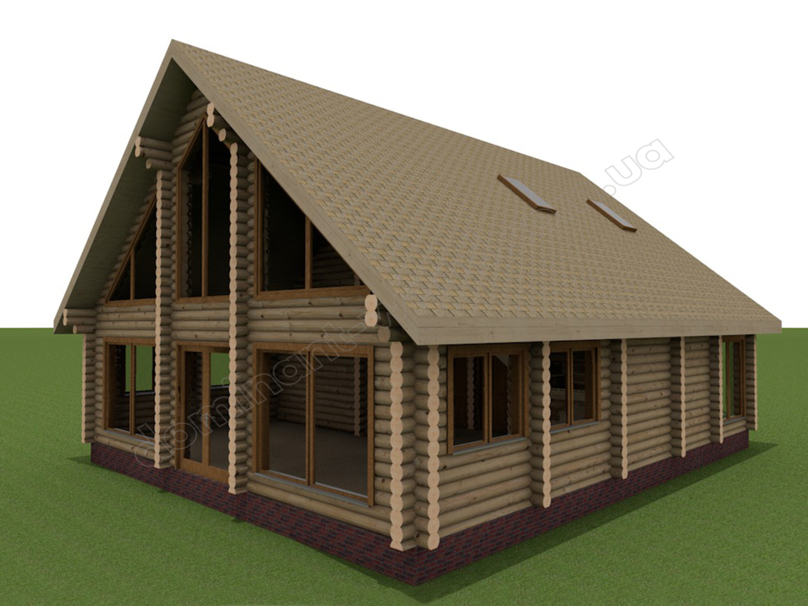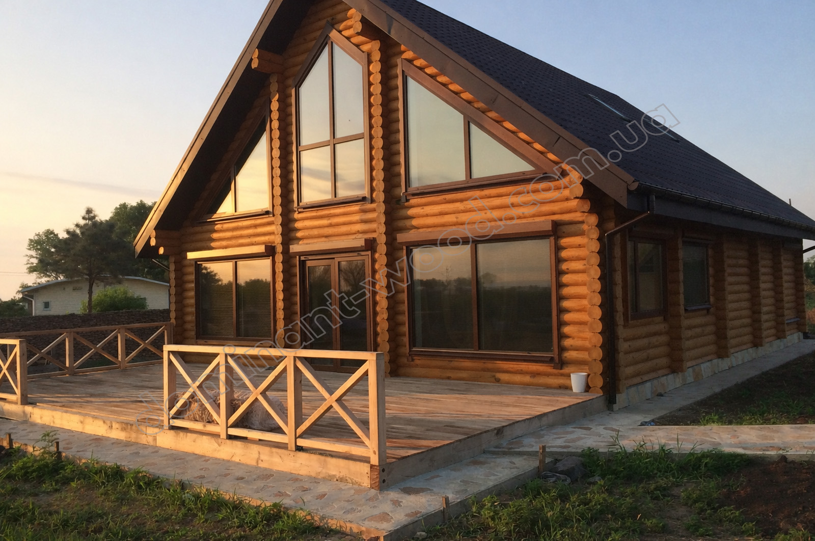 Екстер’єр будинку зачаровує своєю величністю та вишуканістю форм. Тут поєднуються сучасні архітектурні рішення і будівельні прийоми з класикою дерев’яної архітектури. М’якість округлих колод на стінах ошатно контрастує з великими вікнами загостреної форми. Масивний, мансардний дах додає фундаментальності проєкту. Він величний, але легкий водночас та наповнений світлом. Завдяки величезним вікнам та великої кількості світла приміщення всередині здаються безмежними. У такому домі немає місця для буденності й сірості!