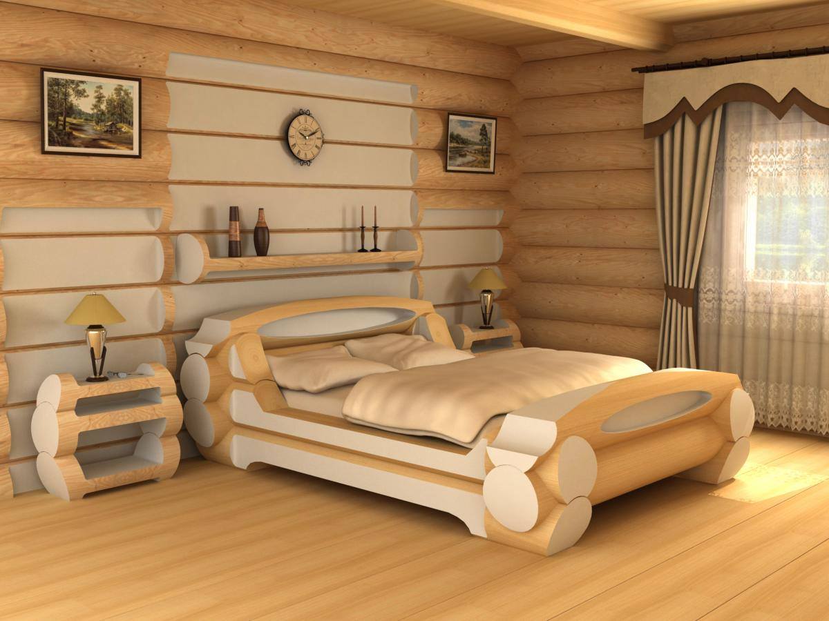 На першому поверсі є велика ванна кімната площею 9,3 м2 та спальня площею 14,6 м2. Для меблювання спальні клієнт замовив у нас ліжко за ексклюзивним проектом. Це гарне, оригінальне ліжко з цільного бруса діаметром 220 мм. Доповнити його клієнт побажав не менш оригінальними тумбами з колод такого ж діаметру і невеликою полицею над ліжком. Завдяки таким деталям, інтер'єр спальні вийшов дуже незвичайним і неймовірно стильним. Гарантувати можемо одне, сон в такому неймовірному ліжку, створеному за індивідуальним замовленням спеціально для господарів, буде максимально глибоким і здоровим.