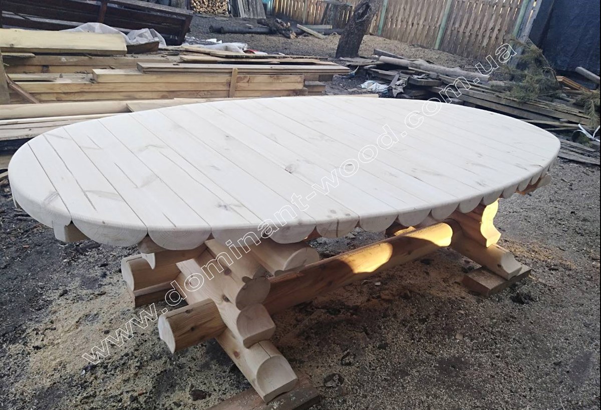 Альтанку ми доповнили гарним, еліпсоподібним столом з оциліндрованих колод, а для застіль виготовили дві масивні, дерев'яні лавки і два стільці. Всі меблі зроблені з колод діаметром 160 мм. Тільки уявіть, наскільки дивовижно будуть виглядати такі дерев'яні меблі в альтанці!