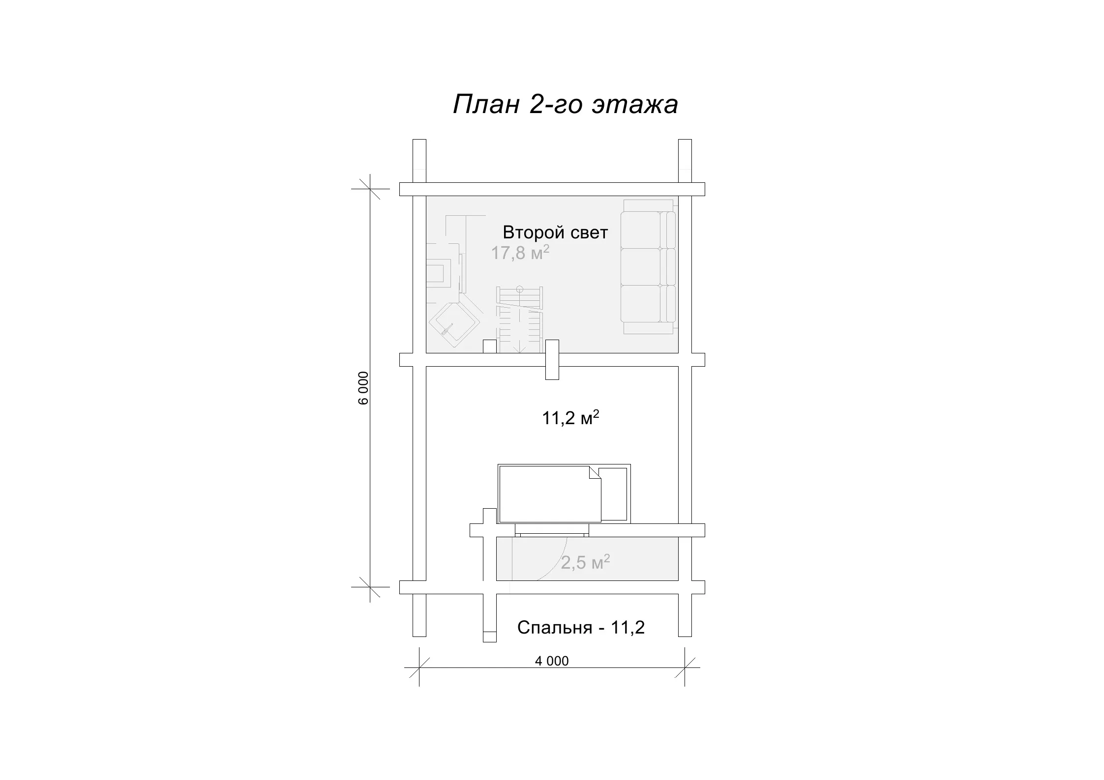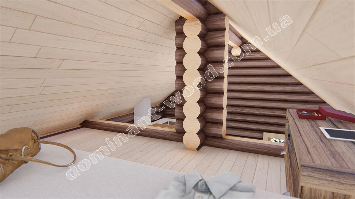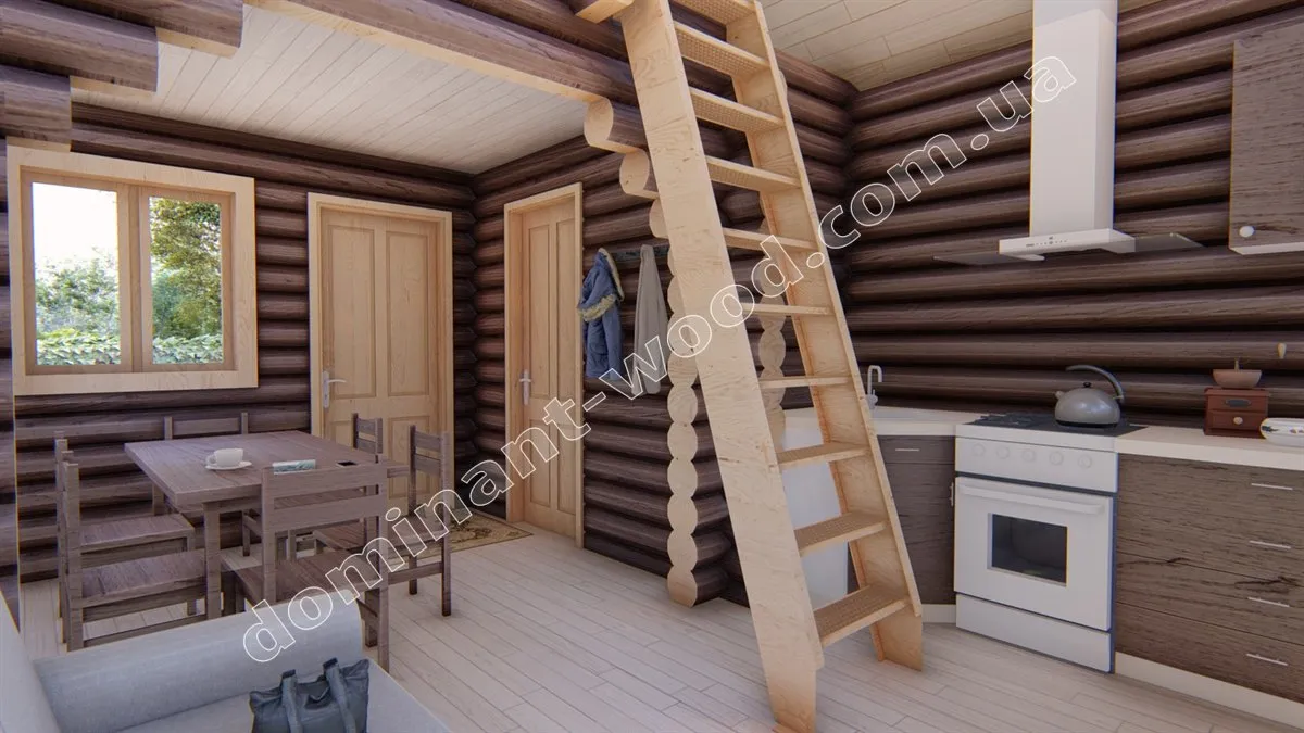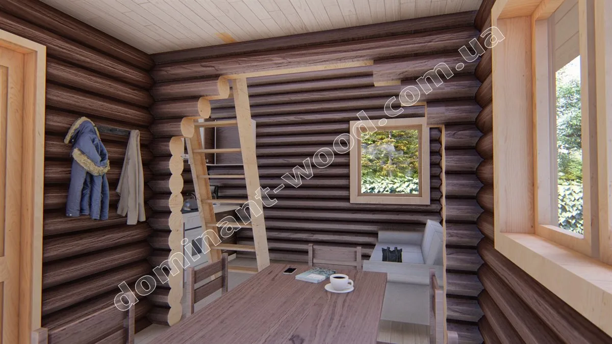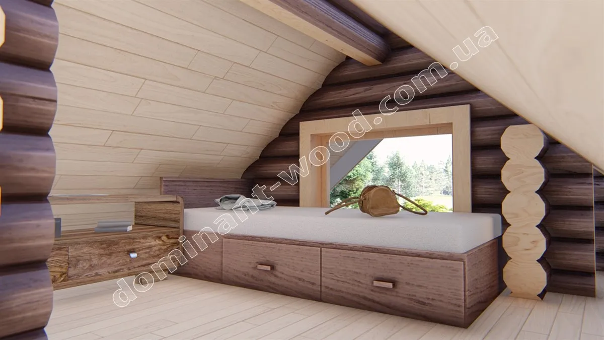 Оциліндрований будиночок є більш доступним варіантом по вартості порівняно з будинком з сухого профільованого бруса, не потребує дорогого оздоблення та має затишне розташування кімнат. Зокрема, розміри забудови складають 6 на 4 метри, загальна площа котеджу, включаючи антресольний поверх, становить 35,1 м2. Це найменший та найбільш економічний варіант серед проектів лінійки «Сільва». На першому поверсі розташовані кухня та санвузол, а на другому - компактна спальня площею 11,2 м2. Антресольний поверх створює додатковий простір, що візуально збільшує приміщення і надає додаткового освітлення кухні-студії. Таке цікаве планування забезпечує всі необхідні зручності для створення комфортного середовища на дачі або базі відпочинку.