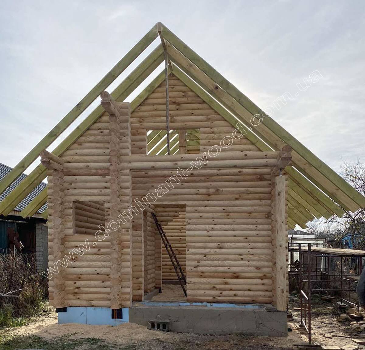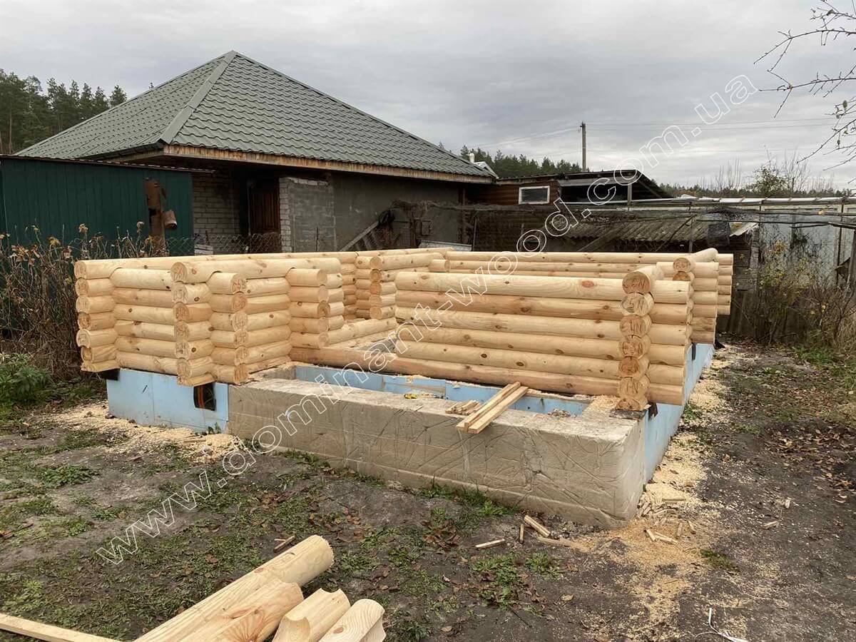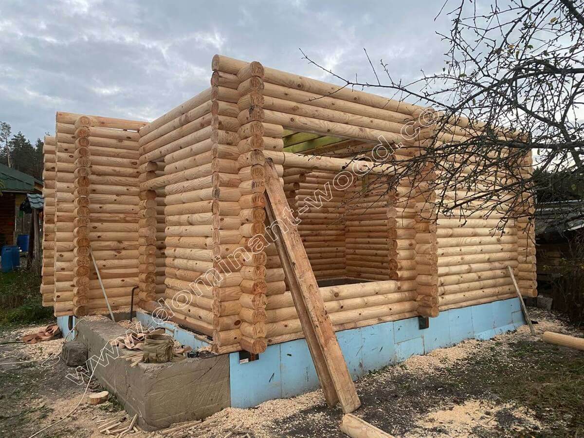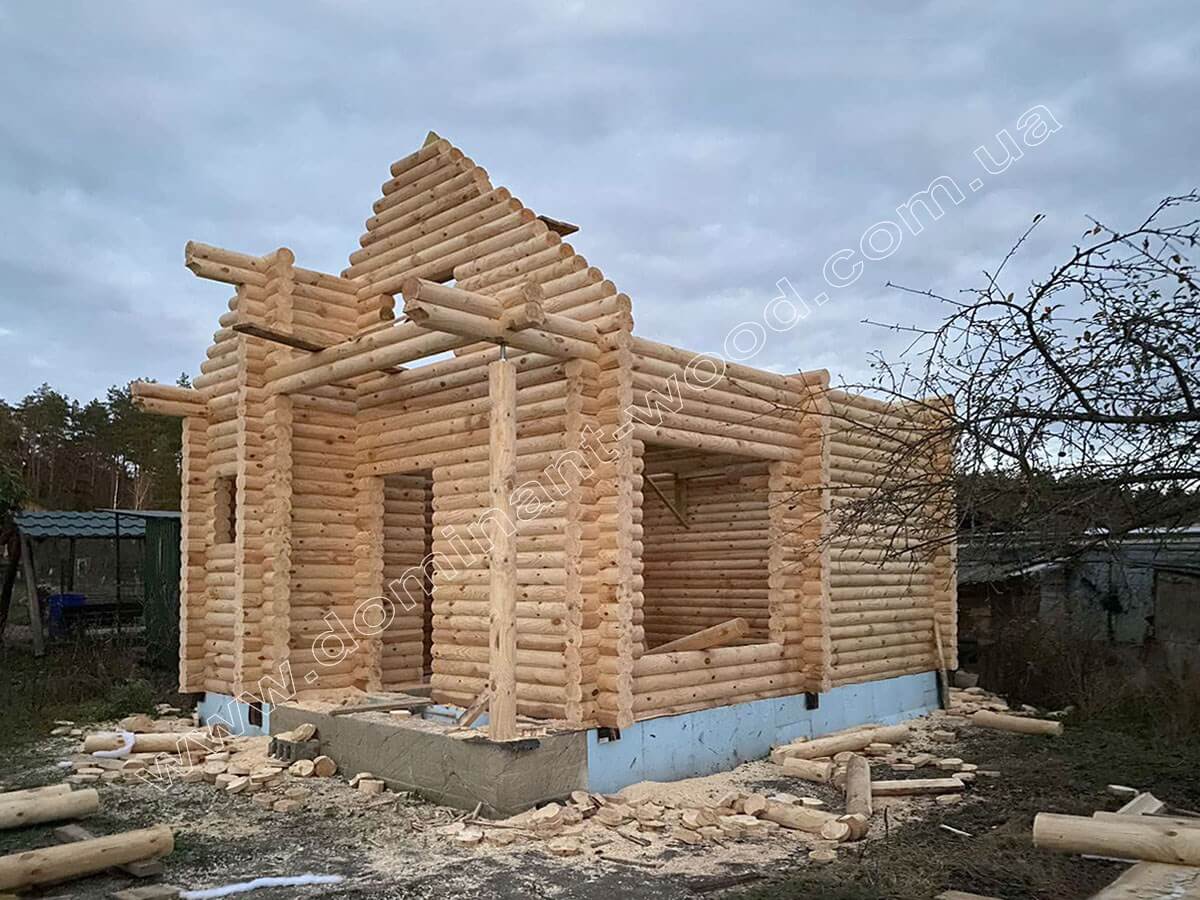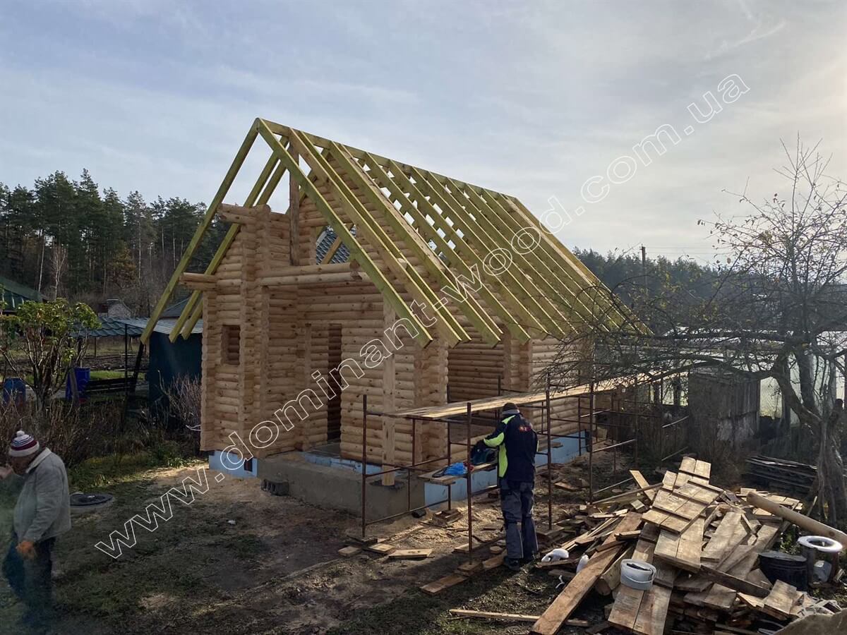 На цей раз замовник з Житомирського району вирішив скористатись нашими послугами монтажу, і як виглядає цей процес, добре видно на фото з майданчика. Клієнт попередньо зробив фундамент за планом архітектора «Домінант». На фундамент клієнта наші будівельники встановили комплект котеджу, який становить собою дерев’яний корпус будови зі стін, перестінків і крокв. Після того, як робота по дереву завершена нами – клієнт має вибір. Або на власний розсуд дороблює споруду під ключ, або звертається за подальшим її облаштуванням до наших оздоблювальних бригад та фарбувальників. Так як деревина тепла, гарна і дихає, то її не потрібно багато прикрашати або чимось облицьовувати. Тому більшість наших клієнтів або купляє домокомплект, як конструктор, або замовляє базову комплектацію разом з монтажем. А всі подальші роботи загалом не складає великих труднощів доробити власними силами. Тому дерев’яні будиночки такі затребувані, бо окрім усіх переваг природного житла, вони швидко складаються, дороблюються і легкі у догляді.