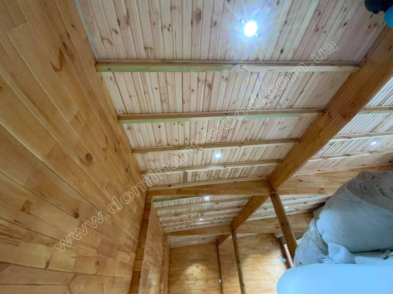 Перш ніж розглядати реалізацію нашого проекту за кордоном варто ще відзначити переваги індивідуального підходу «Домінант» до кожного замовника. Адже вихідний проект «Натас» розроблявся з оциліндрованих колод, а клієнти побажали отримати його з сухого профільованого бруса 60*150 мм. До того ж були дещо збільшені розміри забудови. Давайте порівняємо вихідний проект з нашого каталогу і результат, отриманий в ході перепланування і технології.
