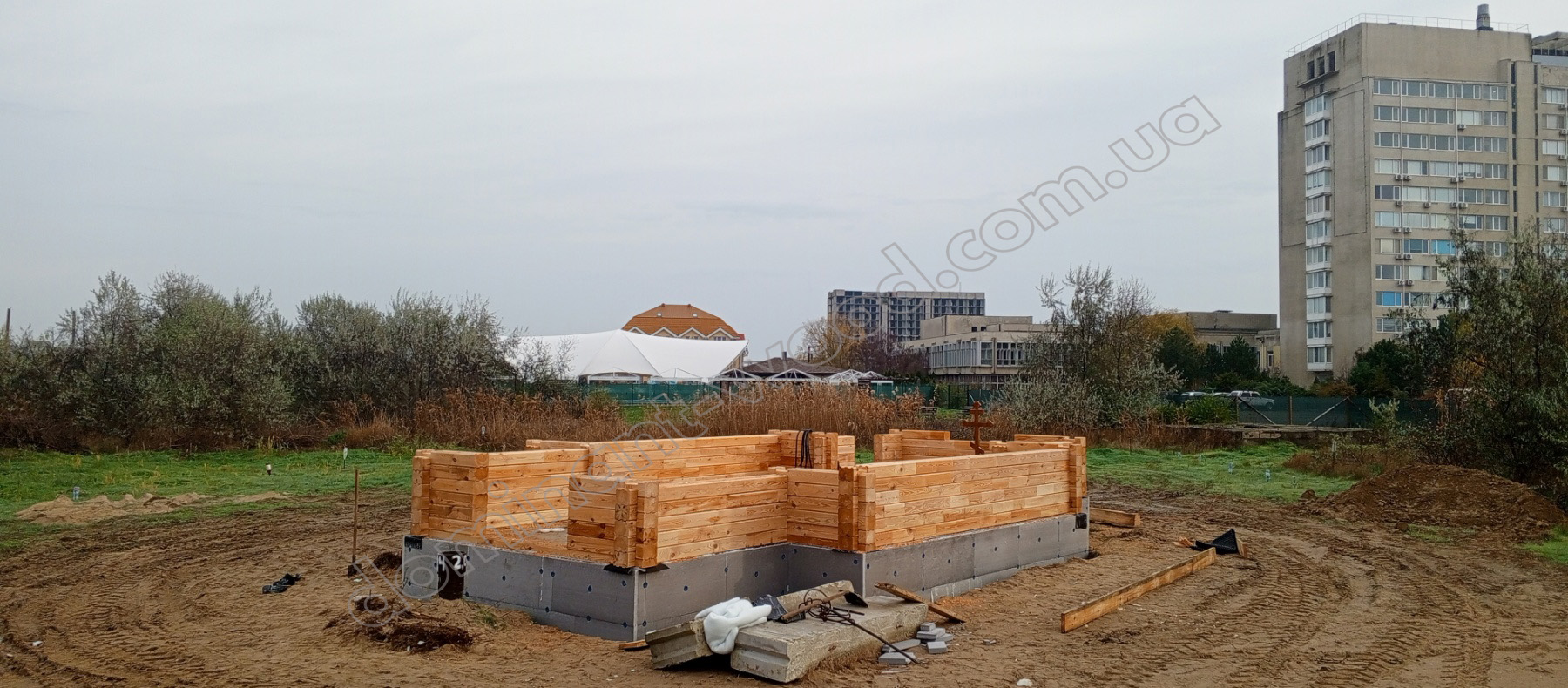 Як можна прокоментувати такий вибір технології будівництва? Справа в тому, що будівля церкви, яка знаходиться поблизу до моря постійно підпадатиме впливу вологості та морського, солоного бризу. В таких умовах просушений до 16% брус працюватиме надійніше і довговічніше, він майже не дасть усадки і не потребуватиме такої уваги до обробки, як оциліндрована колода натуральної вологості біля 40%. До того ж пресс-вакуумний метод сушіння підсилює ефект механічної стабілізації матеріалу, заодно антисептуючи дерево під впливом надзвичайно високої температури 130° C в умовах вакууму. За таких умов відбувається повне і рівномірне просушування бруса будь-якої товщини. Тому багато хто з клієнтів обирає саме таку технологію дерев’яного будівництва, дбаючи заздалегідь про довговічність і міцність будови, її безпроблемну експлуатацію та відсутність необхідності ремонту.