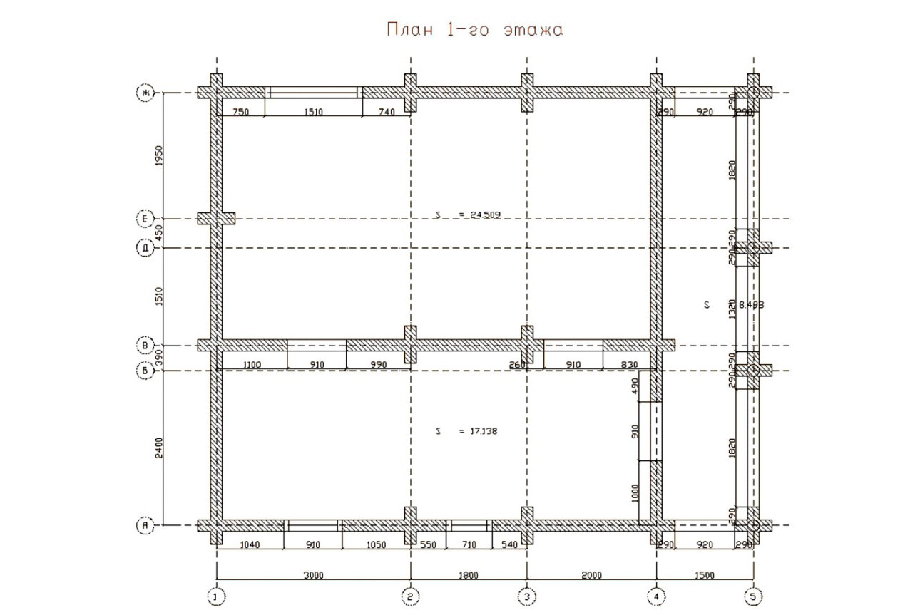 Як ми вже відзначали, замовник самостійно займався складанням зрубу, і перегородки він побажав зробити вже після установки будинку на свій розсуд. Всередині будинку виявилося багато простору для фантазії. І коли з тераси ми заходимо всередину будинку, перший поверх його розділений на дві просторі кімнати. Одну з кімнат площею 17,1 м2 можна зонувати на кілька секцій за допомогою каркасних перестінків або використовувати прийоми декоративного зонування. Тут можна відгородити велику, зручну ванну кімнату і залишити передпокій з коморою для зберігання різного інвентарю. Можна це простір розділити на ванну і спальню, залишивши невеликий тамбур при вході. Друге приміщення першого поверху розраховано на площу 24,5 м2. Ця кімната має містити простору вітальню, суміщену з кухнею в студійному просторі. У вітальні родина зможе проводити вечори за спільним переглядом фільмів і настільними іграми. Тут поміститься великий диван і м'які крісла, вистачить місця і для невеликого робочого столу, а також для книжкових полиць. У кухонній зоні вистачить місця для бару, великого обіднього столу і для зони приготування їжі.