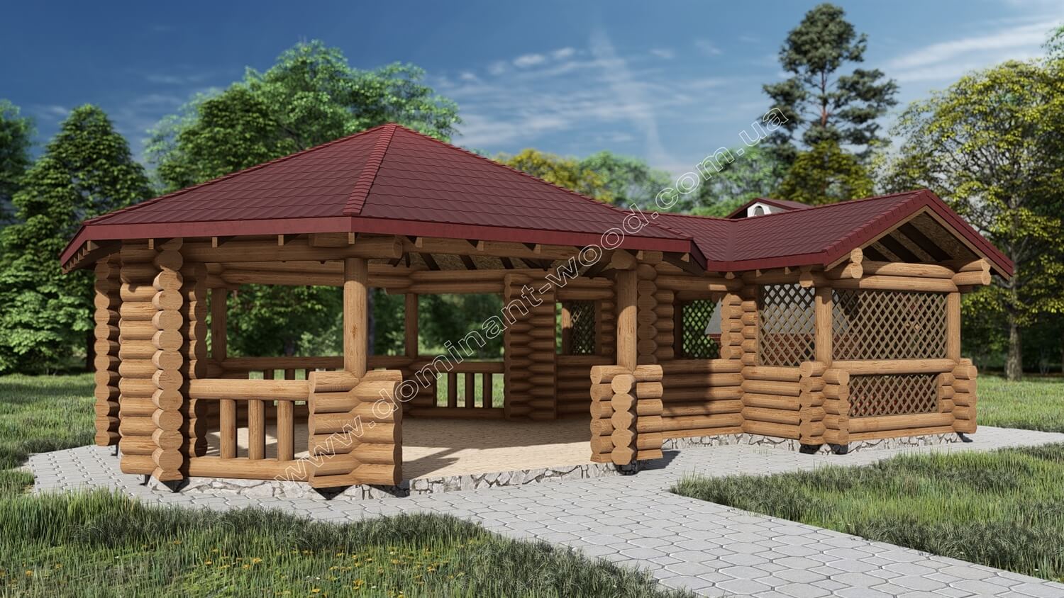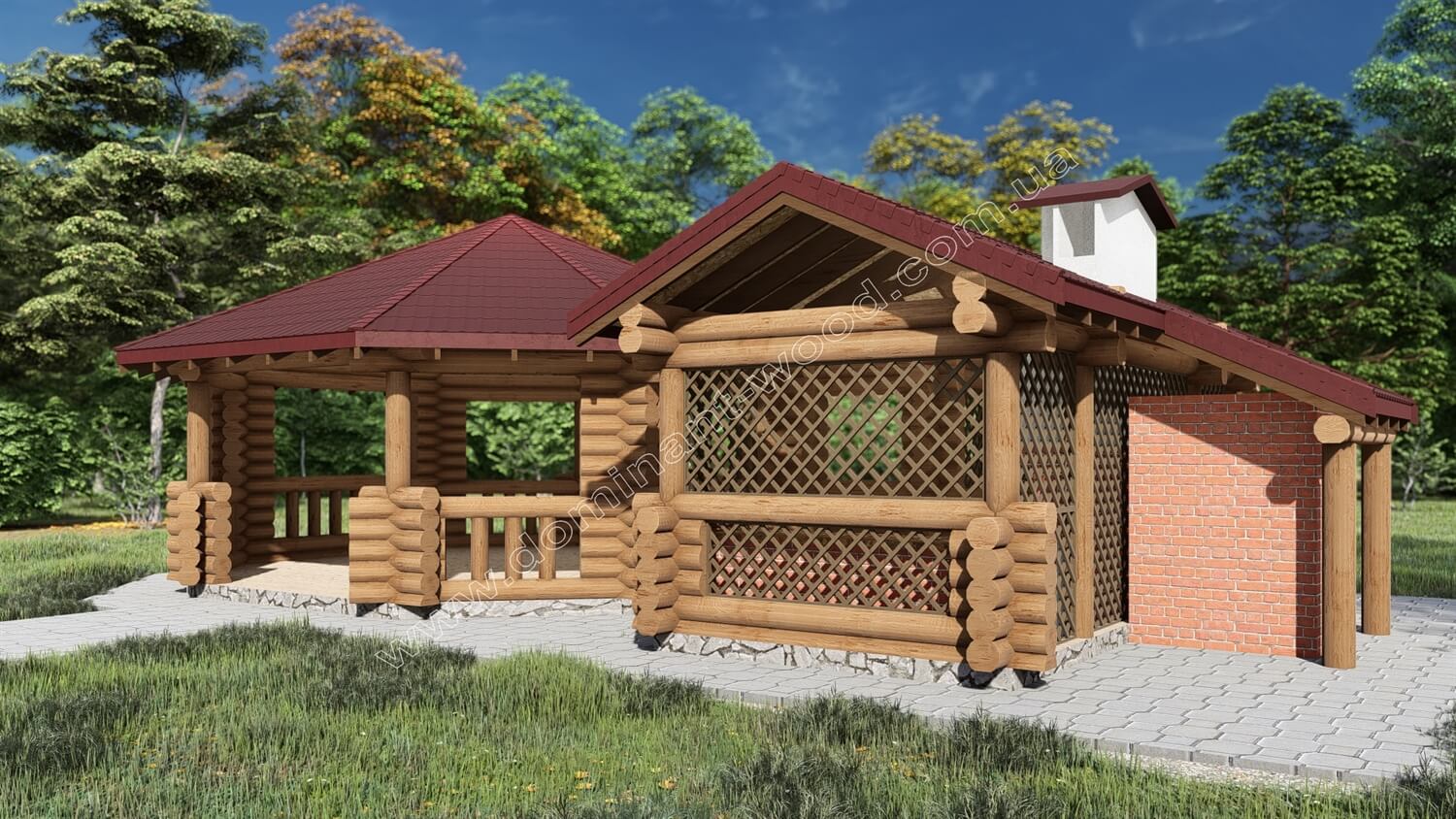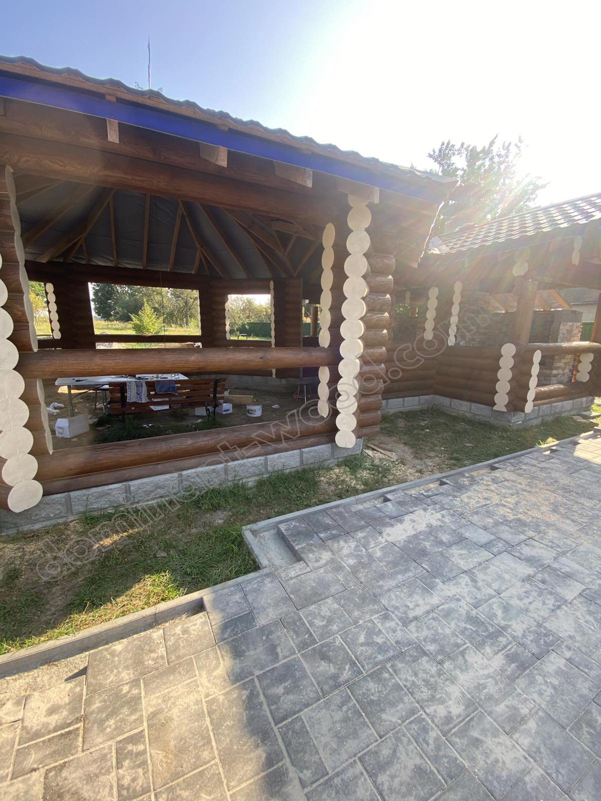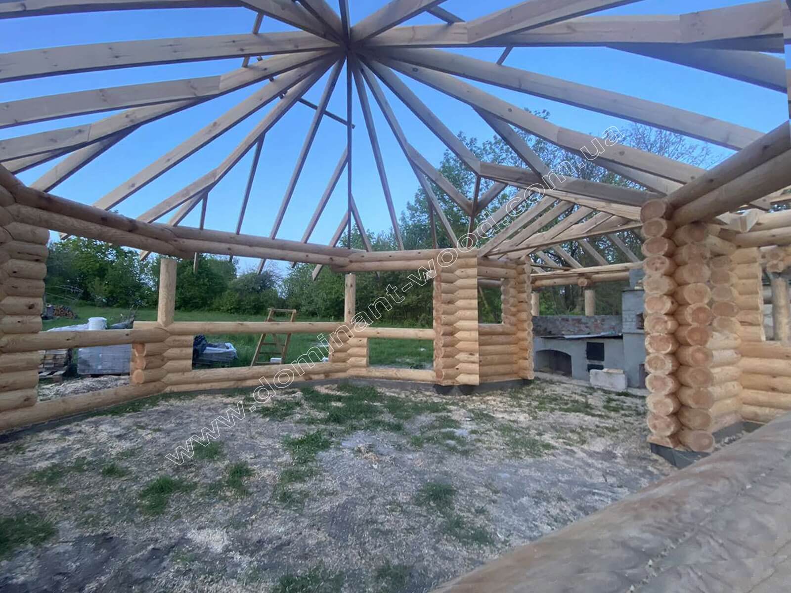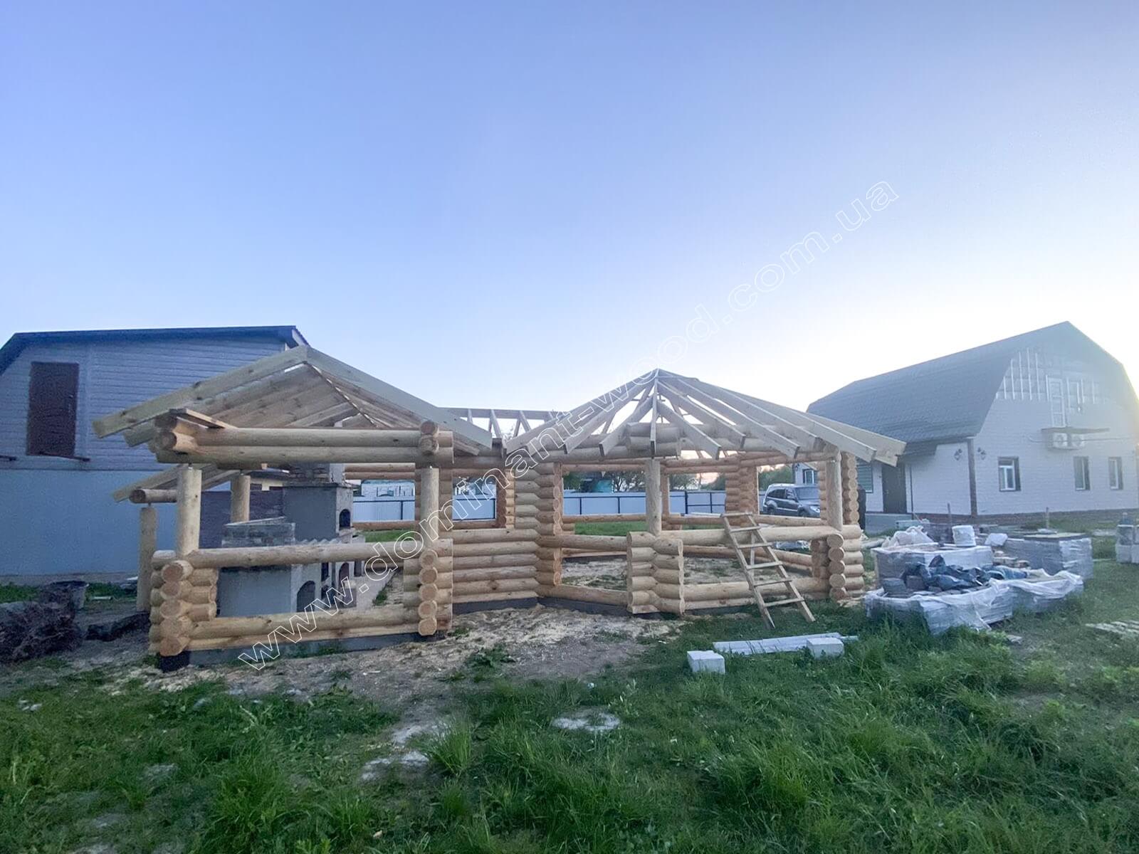 Індивідуальне проєктування - це варіант для тих, хто не тільки мріє про власну будівлю, а у кого вже є чітке бачення, власна ідея та розуміння того, який результат хочеться отримати. А наша задача - втілити це бачення у професійно виконаній конструкції, де кожна деталь буде продумана й реалізована якісно. Тож індивідуальна конструкція завжди володіє цікавими особливостями. Бесідку з кухнею ми зробили з оциліндрованих колод максимально можливого діаметру нашого виробництва 220 мм. Погодьтеся, що масштабні параметри павільйону зумовили вибір наймасивніших колод для його будівництва. Тільки для бортиків деінде застосовуються тонші колоди діаметром 160 мм.