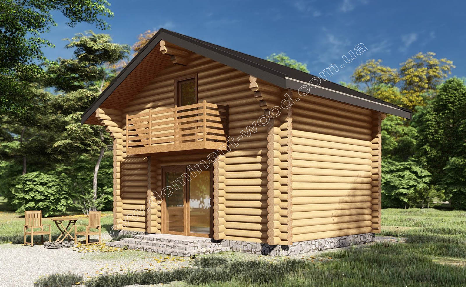 Параметри споруди становлять 4,7 на 6,7 м, а площа двох поверхів 63 м2. Як бачите, другий поверх виконаний у вигляді напівмансарди, де повноцінна висота стель компенсується облаштуванням стелі по висоті скатів даху. Класичні обриси котеджу освіжаються мальовничим балкончиком та фігурно вирізаними торцями колод накшталт проектам «Альвін» або «Альвін2». Такий привабливий дизайн робить будиночок дуже затишним і дійсно схожим на лялькову скриньку. Тож наш клієнт, який вигадав собі цю красу буде насолоджуватись нею щодня разом із неповторною свіжістю соснового лісу та енергією природи, що вирує в соснових стінах будівлі.