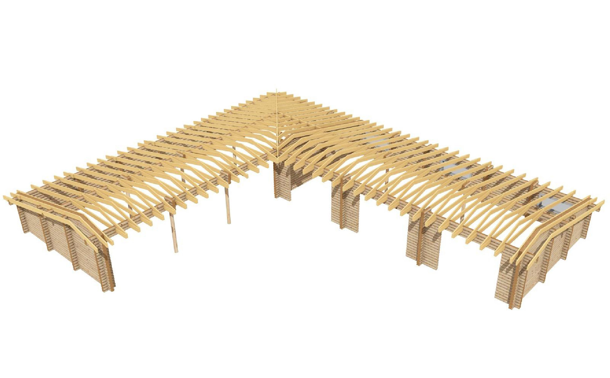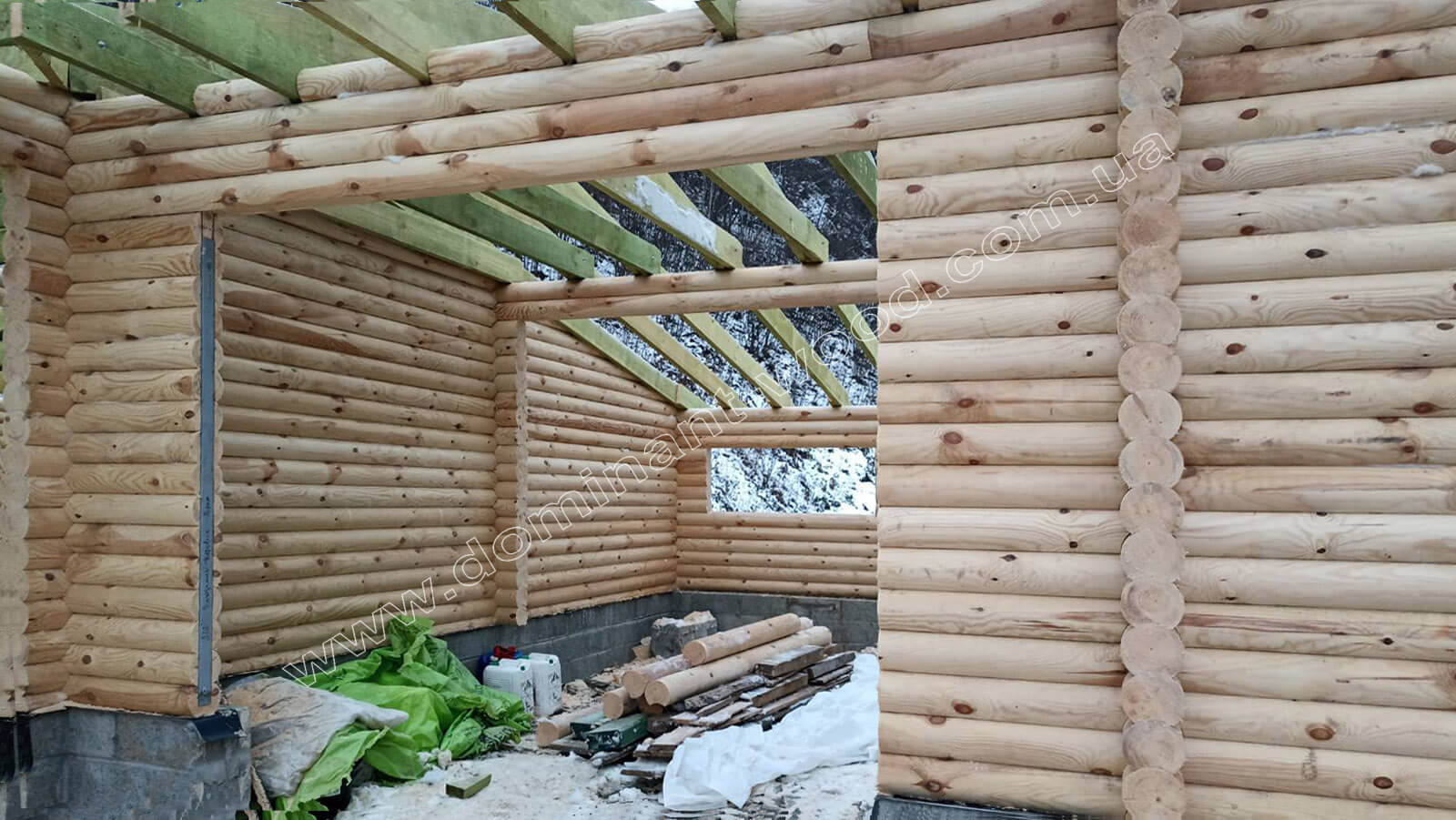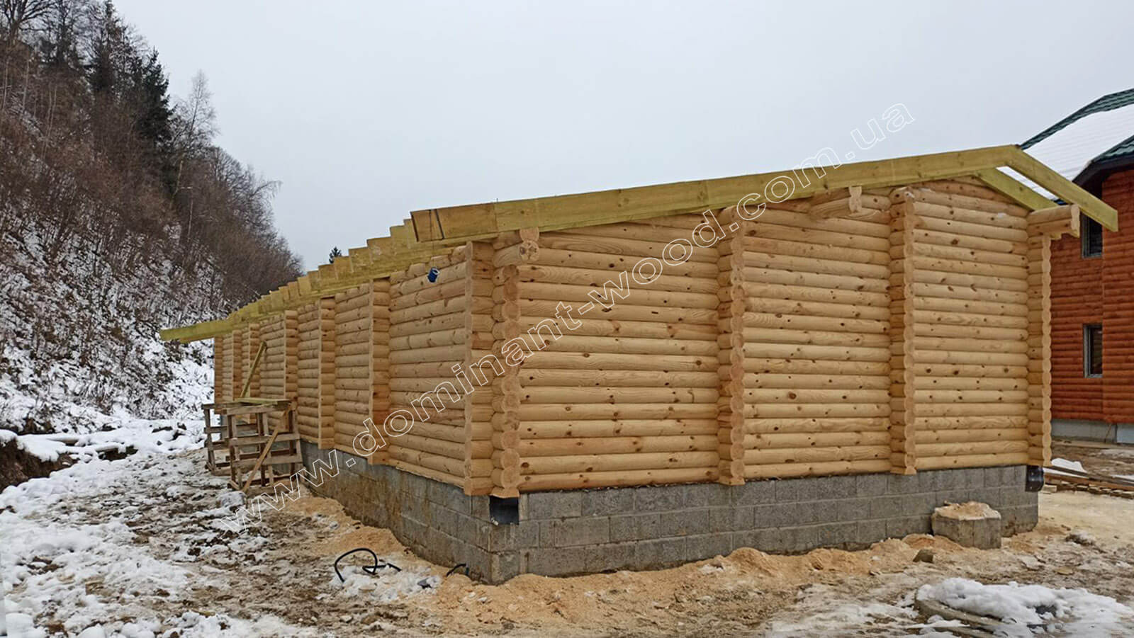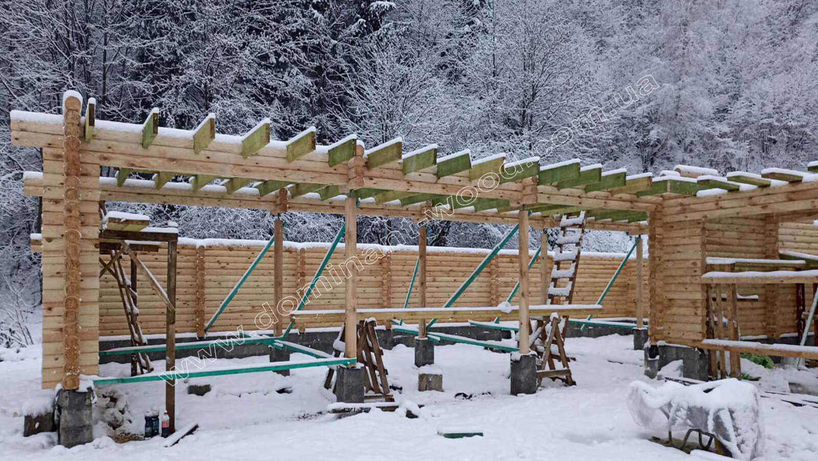 Наша колекція дерев'яних будов постійно поповнюється цікавими, новими проектами. Цього разу ми побудували досить масштабну споруду гаражу на декілька автомобілів. Проект розрахований на три закриті гаражні приміщення і ще відкриті навіси для автомобілів або господарського інвентаря. Загалом площа будови склала 199,5 м2, дерев'яна конструкція виконується з соснових колод Ø 160 мм. Такий проект може бути реалізований як для приватного використання, так і, наприклад, в готельному комплексі під комерцію. Майстри «Домінант» встановили будівлю в с. Микуличин Івано-Франківської області. Пропонуємо вам цікаві фото і особливості проекту у нашій новій публікації.