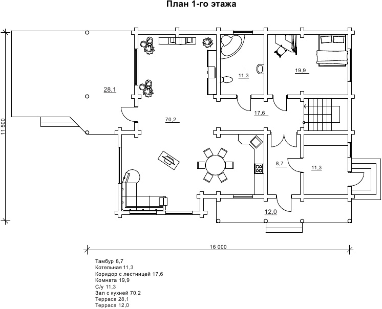 Планування першого поверху починається з терас по обидва боки фасадів. На великій терасі площею 28 м2 можна вдосталь відпочити, насолоджуючись природою біля будинку. Тут можна обладнати мангал або м'який куточок. Місця вистачить під всі ідеї організації відпочинку. Близько другого входу є невелика тераса на 12 м2 під балконом аналогічної площі. Незважаючи на невеликі розміри тераси, на фото видно, що вона досить містка для столу і лавочки, наприклад. Всередині першого поверху спланована велика вітальня з кухнею на 70,2 м2. Якраз з неї можна вийти на велику терасу. Також перший поверх містить просторий санвузол і спальню, яку зручно використовувати під гостьову кімнату. Ще одне дуже корисне приміщення першого поверху - це котельня. Її площі 11,3 м2 цілком вистачає для всієї необхідної опалювальної техніки. У цьому дерев'яному маєтку господареві не потрібно замислюватись, де розташувати котел і основні вузли комунікацій.