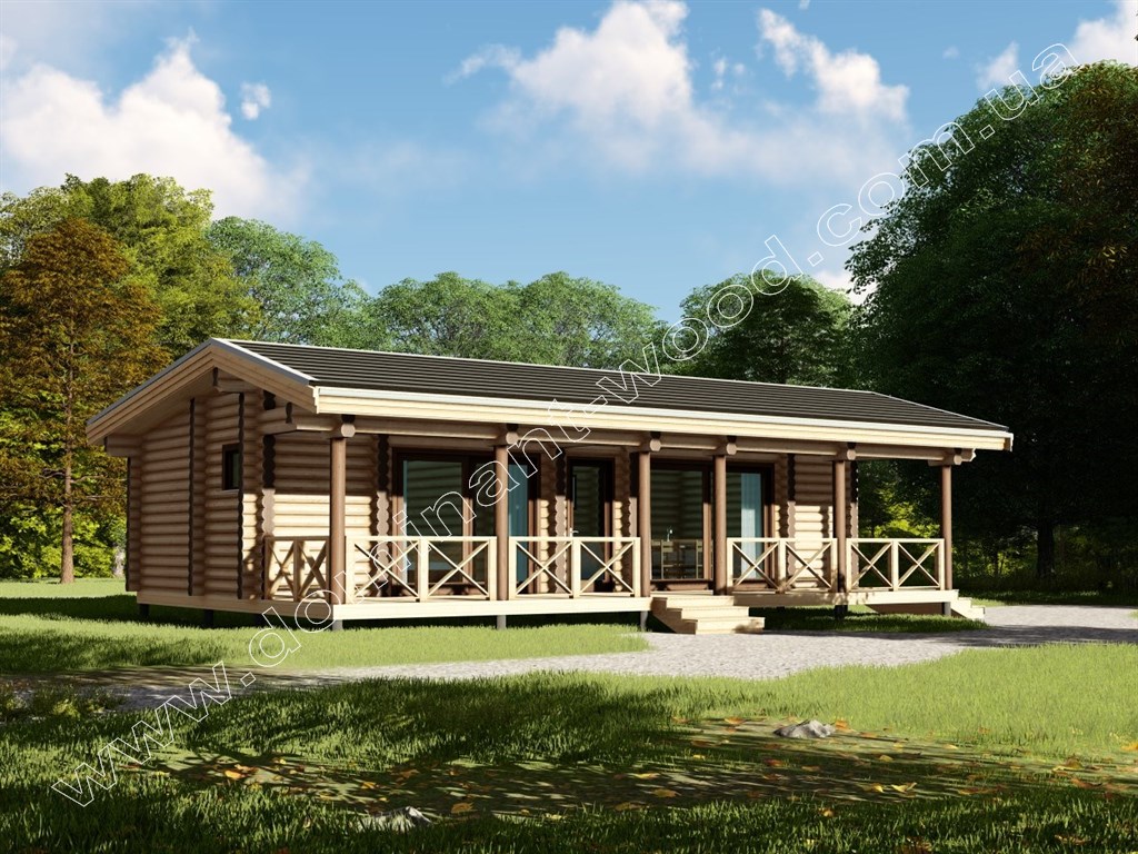 Цей котедж відрізняється особливою легкістю і красою. Світла деревина, великі вікна і простора тераса з декоративними бортиками - все це створює дуже приємний, стильний, вишуканий вигляд. Натуральні соснові колоди, з яких складаються стіни, створюють ідеальний мікроклімат всередині, цілющий для здоров’я і максимально наближений до природи.