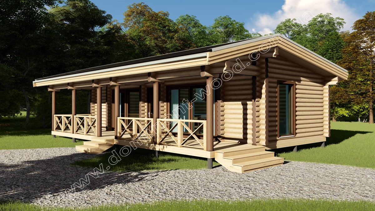 Площа котеджу складає 86,1 м2, це разом із просторою терасою розміром 29,5 м2. Загалом в середині на площі 56,7 м2 розташовані спальня і велика кухня-студія, де вдосталь місця як для приготування їжі, так і відпочинку у просторому м’якому куточку. В такому дерев’яному будинку все передбачено для того, щоб у найкомфортніших умовах насолоджуватися природою, що наповнює приміщення всередині і зовні. Адже у стінах, зроблених із соснових колод зберігається максимально природній мікроклімат з ароматом хвойної свіжості. А от прості архітектурні форми котеджу суттєво мінімізують витрати на його виробництво і будівництво.