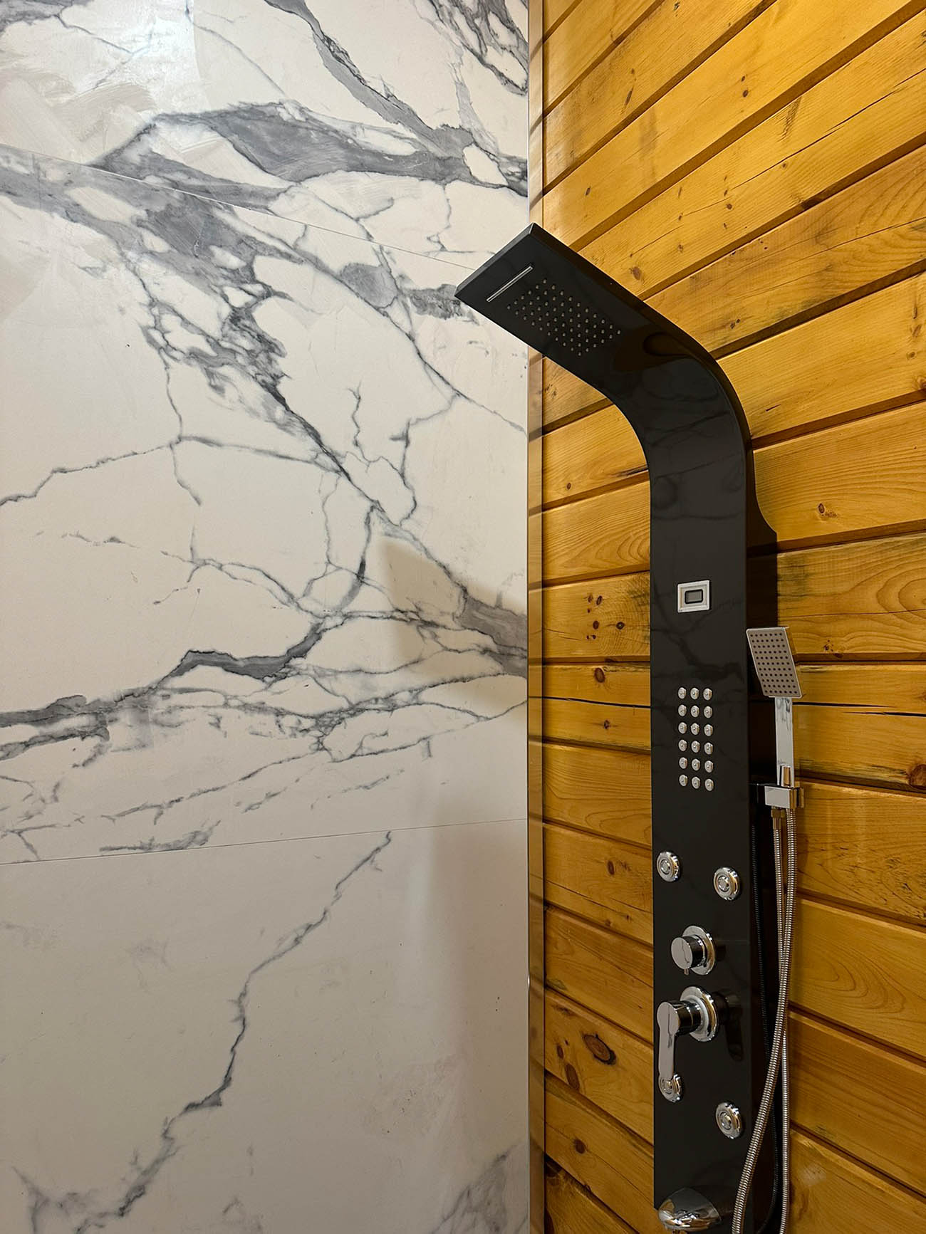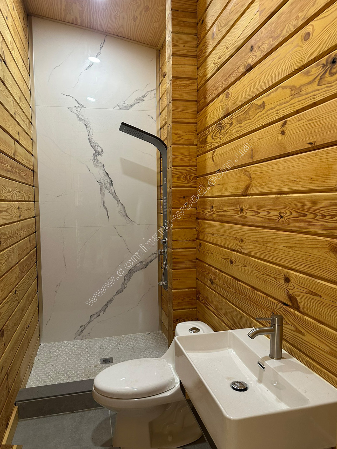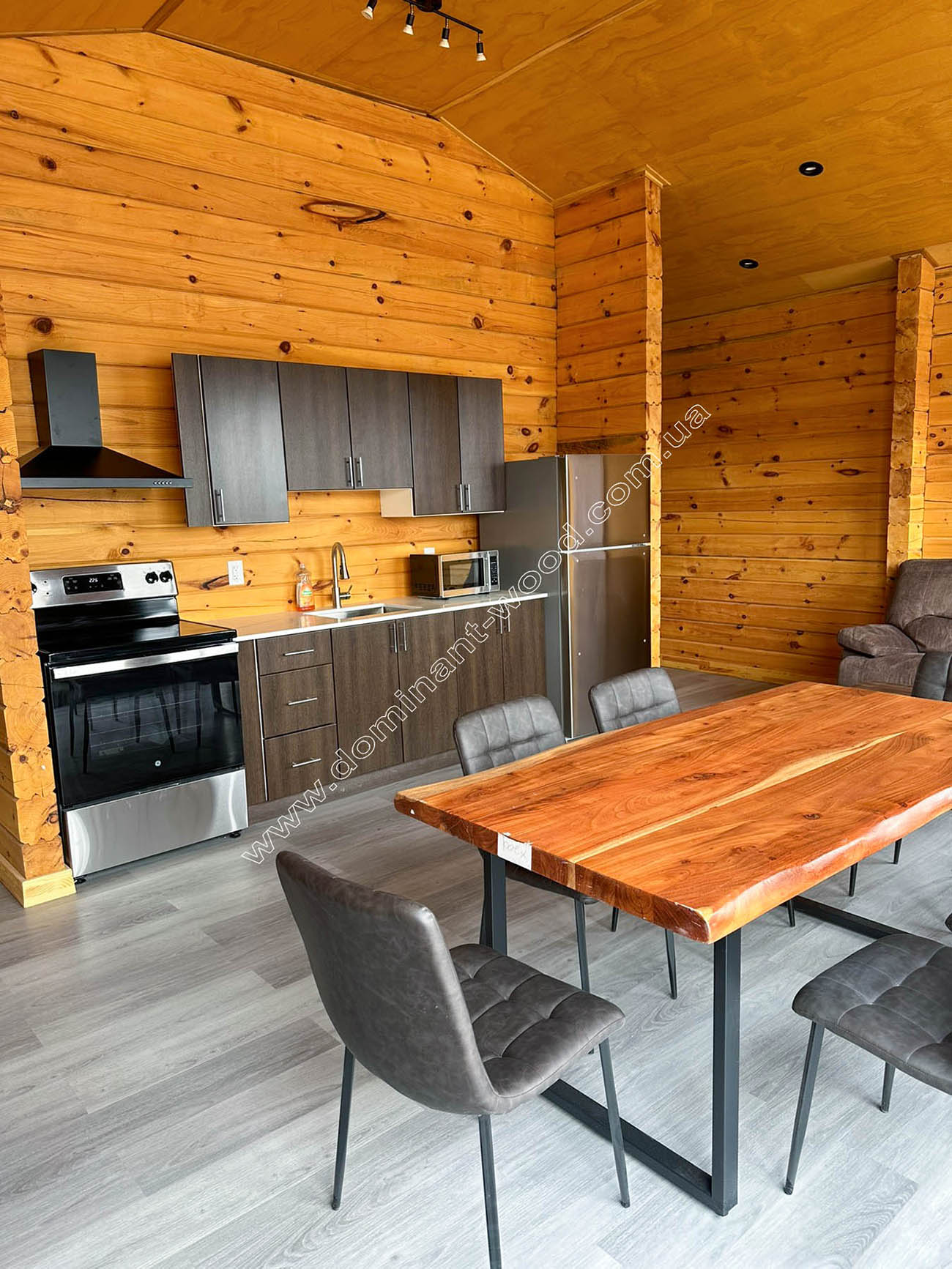 Заходиш до такого будиночку - і відразу опиняєшся у затишку. Все навколо дихає спокоєм і простотою, якої так не вистачає в міських квартирах. Як ми бачимо на фото внутрішніх робіт - соснові стіни залишені майже без покриття - лише легке тонування, щоб зберегти малюнок дерева. Кожен сучок, кожна лінія на брусі – це унікальний автограф природи. Тут не маскують фактуру, навпаки підкреслюють її. Підлога з ламінату теж під дерево, але холоднішого відтінку. Якраз графітовий камінь на поверхні каміна, такий самий колір стільчиків та елементи інших меблів, картина над диваном у відтінках сірого створюють приємні, поступові переходи від холодного відтінку каменю до теплого дерева і навпаки. Гра природних відтінків всередині будиночків продовжує навколишню красу природи, що налаштовує на внутрішній спокій та повне розслаблення. Природа завжди відновлює і сповнює силами.