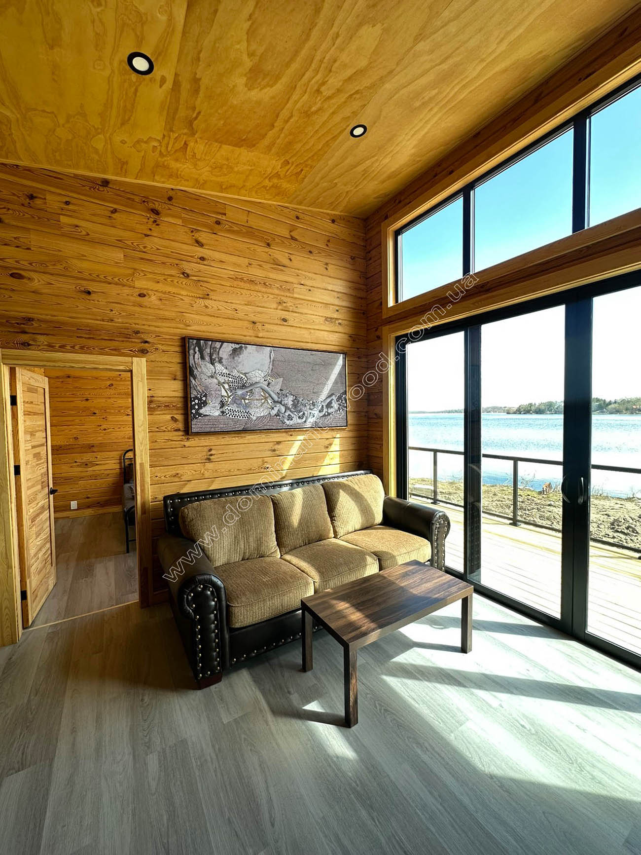 Проекти для Онтаріо ми створювали під індивідуальне замовлення. Тут не підійде шаблон - тільки те, що органічно увіллється в ландшафт. Так з’явилися будинки з високими стелями, великим склінням і простими, вишуканими формами. Найяскравіший акцент - панорамні вікна, які потрібні для того, щоб впустити оточуючу красу до оселі і відчути з нею повне поєднання. Канадські господарі обрали для своїх споруд наш суцільний, сосновий брус, просушений у пресс-вакуумній камері. Ніякого клею, або інших домішок - лише якісно просушена, стабілізована у вакуумі, екологічна деревина, яка витримує час і клімат. Перший будиночок, створений для канадського клієнта, має просту, але ефектну геометрію: 10×9,4 м, одноповерховий, з односхилим дахом і стелею, яка здіймається до 4,3 м у вітальні. Виглядає, динамічно і спрямовано, немов у русі.