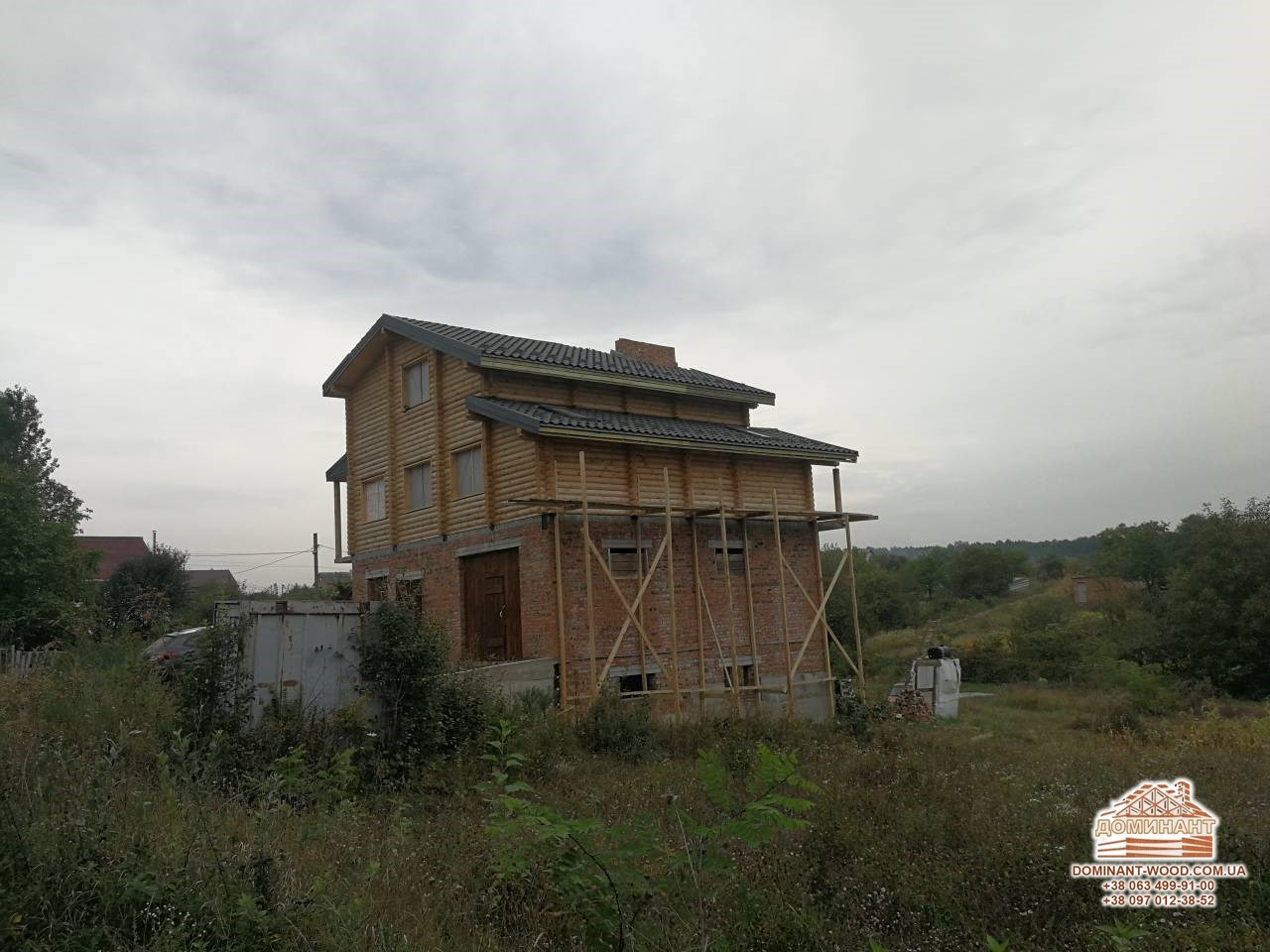 Даний проект побудований в Хмельницькій області з оциліндрованих колод діаметром 180 мм. Загальна площа двох поверхів, по осях зрубу становить 173 м2. Перший поверх з блоків був розподілений під господарську споруду, тут може розташуватися як майстерня, так і можна зробити гараж. Другий і третій поверхи з дерева - житлові. Тут є все необхідне. На другому поверсі знаходиться величезний балкон, де можна влаштувати окрему зону відпочинку. Спальні, ігрові, вітальня, дитячі. Два повноцінних поверхи для проживання сім’ї. У такому будинку знайдеться затишний куточок для кожного. А про комфорт і тепло, які створює дерево, навіть не варто й нагадувати. Замовник отримав свій повноцінний житловий будинок. Йому при цьому не довелося витрачатися на розбирання першого поверху, таким чином клієнт отримав триповерховий особняк за індивідуальним проектом, з оригінальною комбінацією будівельних матеріалів. Перевагою є ще й те, що такий будинок буде дуже теплим і завжди наповнений світлом. Зараз наші фахівці проводять ще додаткові роботи з фарбування і вже зовсім скоро замовник з сім’єю зможуть туди заселитися.