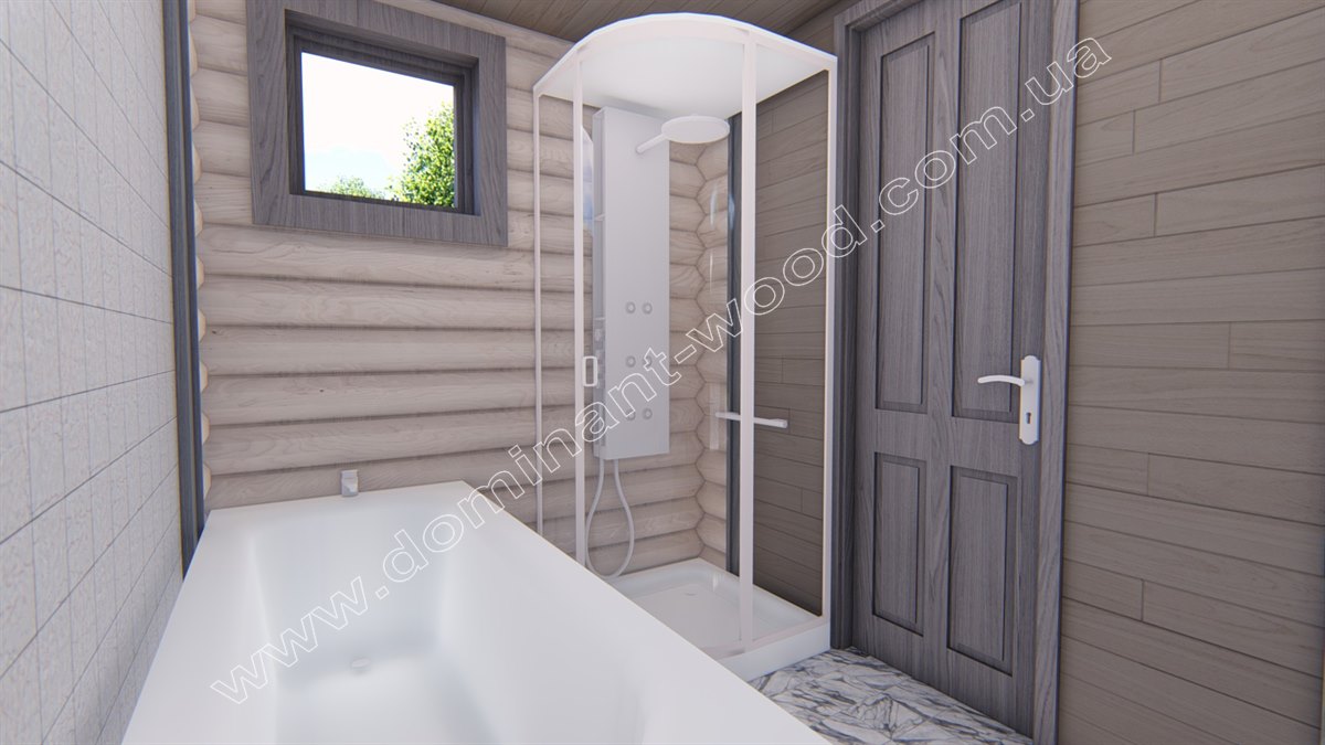 Параметри забудови складають 9 на 6 м, загальна площа приміщень 54 м2. Суттєві розміри належать саме терасі біля входу, вона займає 21,6 м2. Кімната відпочинку всередині лазні теж досить простора, вона спланована на 16,4 квадратів та складається з двох функціональних зон – м’якого куточку відпочинку та кухні. З цієї кімнати можна пройти до мийного приміщення, з якого дверцята ведуть у парилку розміром 5,4 м2. Це зручна площа для одночасного перебування компанії з 6-8 чоловік. До того ж лавки в парилці розміщуються завжди у два яруси, тому парилки на 5 м2 досить для оптимального відпочинку невеличкої компанії. Дуже зручно, що планування лазні «Златана» передбачає наявність відокремленого санвузла (3 м2).