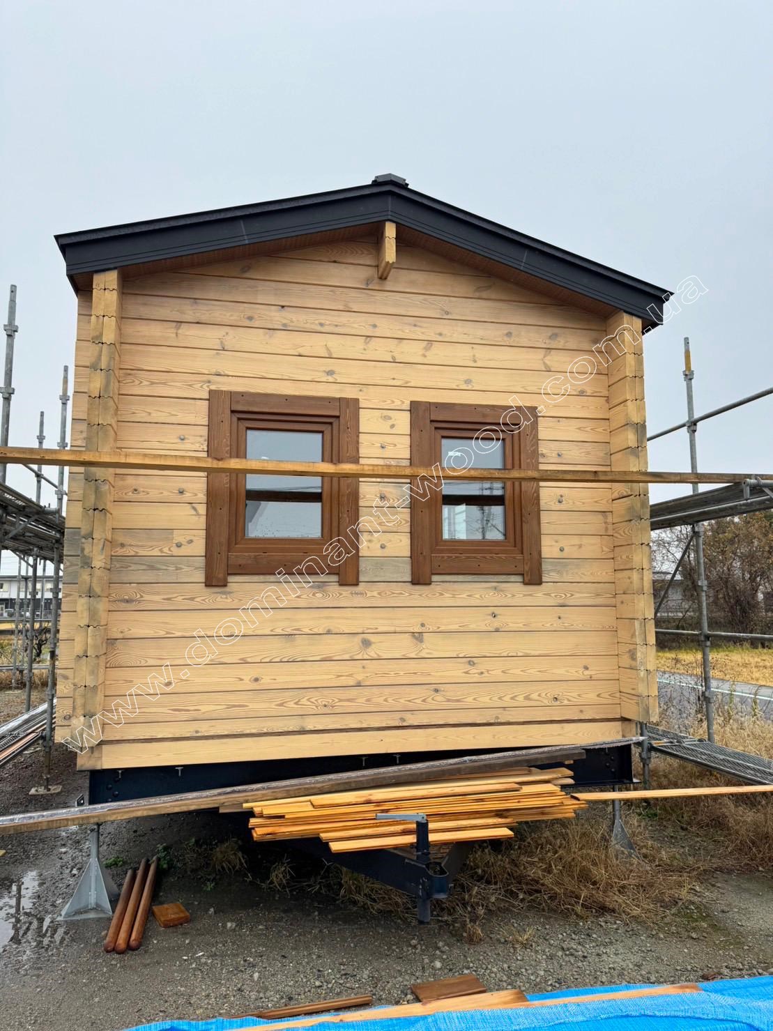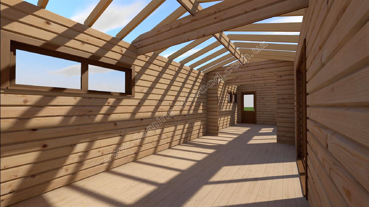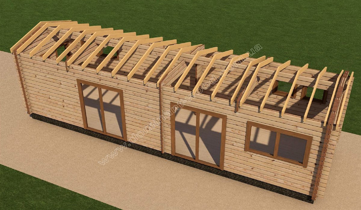 Другий котедж виконується теж з сухого, профільованого брусу, але тоншого за розміром 60*150 мм. Це літній, гостьовий будиночок, дуже схожий на пересувний котедж, який нещодавно ми робили для чеських клієнтів. Габарити забудови цього фургончика складають 3,1 на 10,9 м, він облаштований великими вікнами від підлоги до стелі.