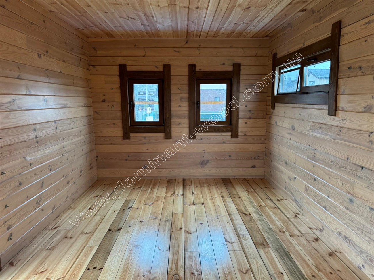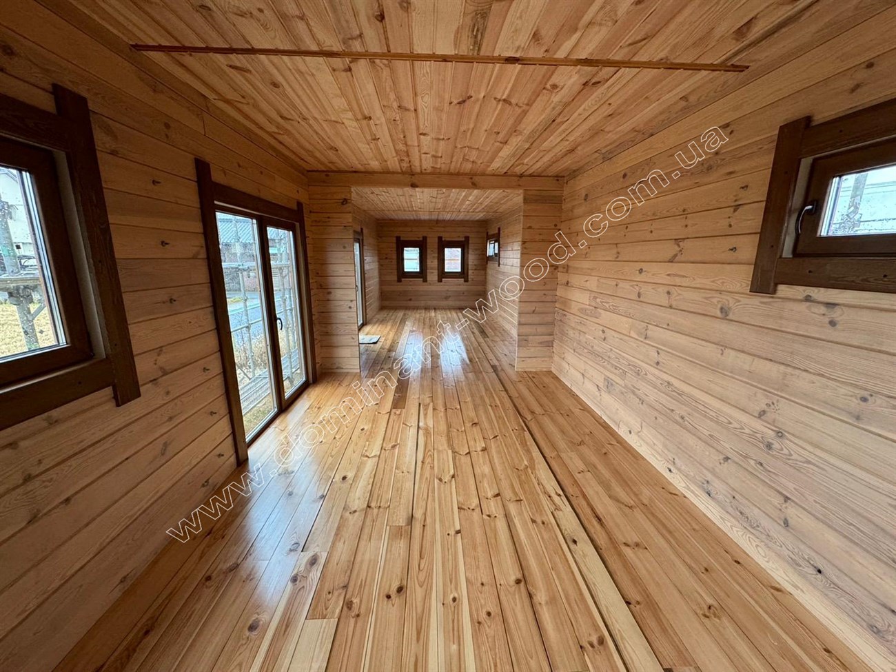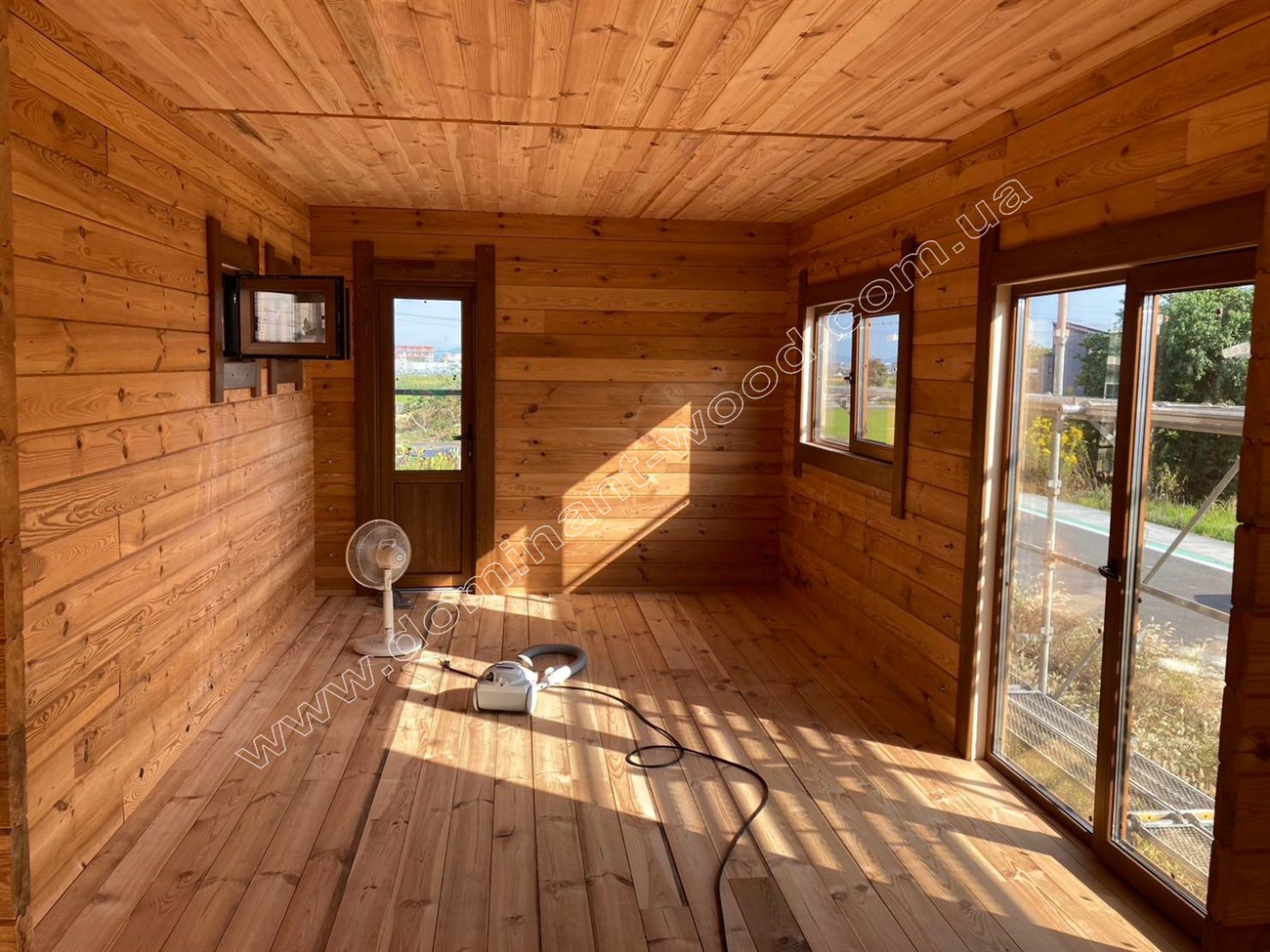 Другий котедж виконується теж з сухого, профільованого брусу, але тоншого за розміром 60*150 мм. Це літній, гостьовий будиночок, дуже схожий на пересувний котедж, який нещодавно ми робили для чеських клієнтів. Габарити забудови цього фургончика складають 3,1 на 10,9 м, він облаштований великими вікнами від підлоги до стелі.