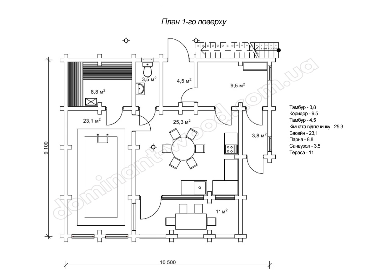 Наш замовник з Одеської області, що будувався неподалік від моря, взагалі вирішив спланувати окрему спа - зону на першому поверсі будинку. За баченням клієнта, в цій зоні має бути парилка і басейн. Враховуючи такі побажання, ми розробили план першого поверху в габаритах забудови 10,5 на 9,1 м. Під парилку виділено 7,55 м², а 20 м² займає простір для басейну. Два ряди вікон під високі стелі візуально збільшують простір та робить дозвілля в будинку з басейном приємнішим. Весь головний фасад першого поверху оформлений подвійними рядами вікон, що додає ще ефектнішого вигляду маєтку, а внутрішній простір при цьому сповнюється природним світлом та затишком. Дуже мальовничо виглядає веранда з великою площею скління. Також на першому поверсі є простора кухня-студія, санвузол, та два окремі входи через теплові тамбури. Таким чином ми гарно подбали про якісне збереження тепла в зоні відпочинку, що дуже актуально під час спа-процедур.