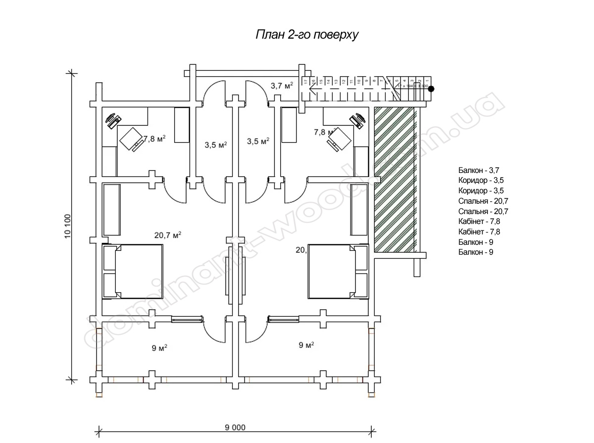 А на другому поверсі розкішний приватний простір - дві спальні з гардеробами, санвузлами і балконами. В принципі на нашому рекомендованому плануванні ви бачите кабінети, але тут, погодьтеся можна зробити гарно облаштовані, просторі ванні кімнати. Цілком ймовірно, що замовник передбачив ще й комерційні можливості такої мальовничої вілли і плани здавання її в оренду. Для цього й служить окремий вхід до другого поверху, оминаючи вітальню на першому поверсі. Як бачите, є свої особливості, якщо ти плануєш простір не просто для життя, але й для комфортабельного дозвілля чи комерційних цілей. Загальна площа споруди склала 175,2 м², і побудували ми цей маєток з колод діаметром 200 мм.