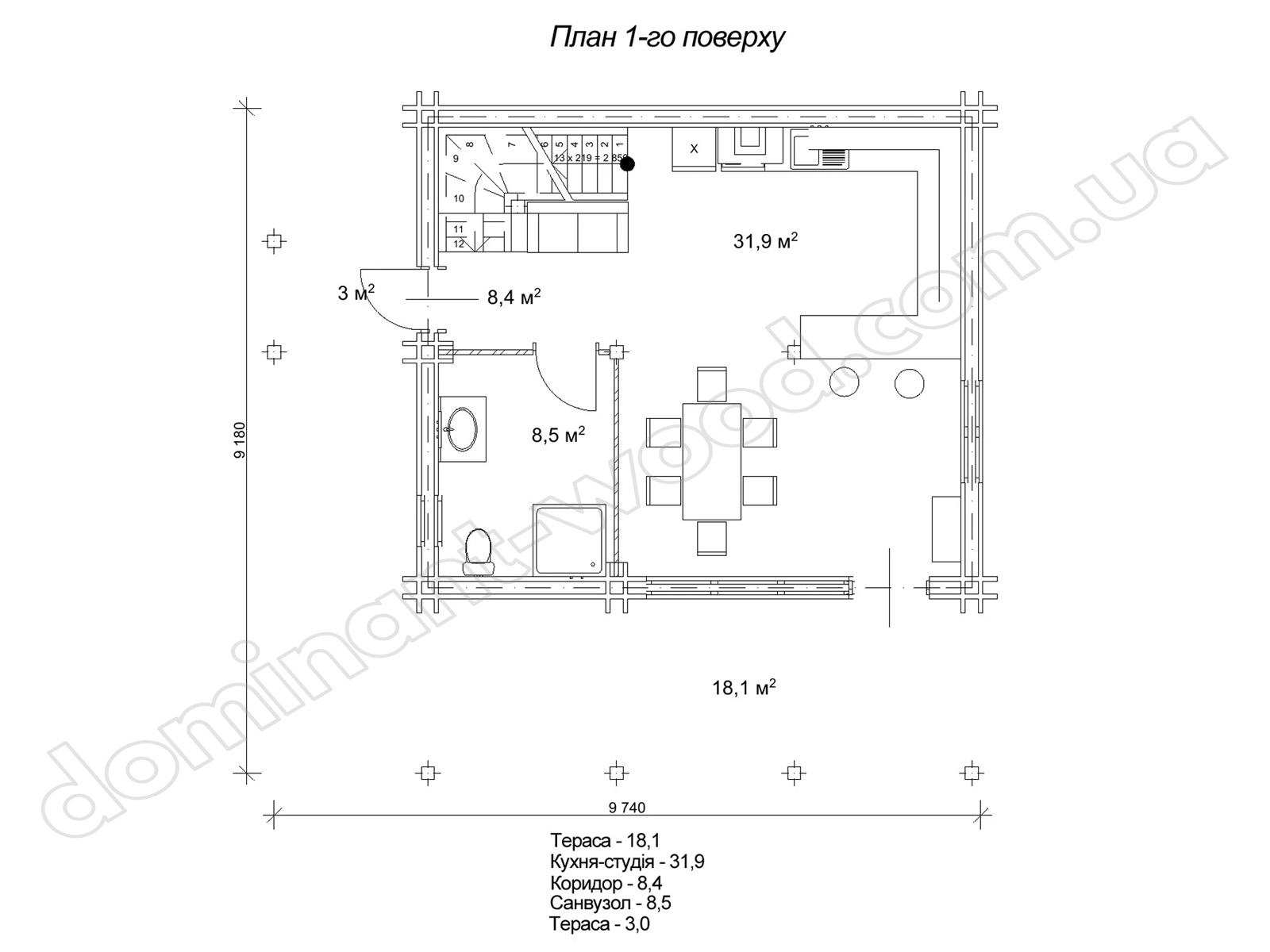Габарити забудови будинку складають 9,1×9,7 м. Перший поверх призначений під простору вітальню площею 31,9 м², де в одному просторі організовані кухонна зона, барна стійка та великий обідній стіл. Санвузол тут справді просторий - 8,5 м², при бажанні тут стає простора ванна з пральною машиною. Сходи зроблені акуратно й компактно, вони стоять у куті й не поглинають корисний простір. Із вітальні через великі розсувні скляні двері є вихід на терасу під балконом другого поверху - зручне місце, щоб посидіти надворі в теплу погоду, попити каву чи просто відпочити.
