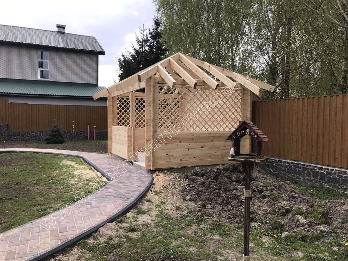 Для зведення каркасу стін було обрано просушений сосновий брус 60*150 мм. Такої маленької товщини брусів вистачить для того, щоб альтанка виконувала свої функції і до того ще й виглядала витончено і стильно. Окремої уваги заслуговують декори у вигляді фігурних планочок на бокових отворах альтанки, які слугують прикрасою споруди та водночас основою під плетючі рослини, троянди або виноград, якими можна оплести бесідку на смак господарів. Така гарна альтанка з дерева стане чарівним куточком подвір’я і посприяє створенню виключного затишку біля житлової оселі. Ця неймовірно гарна споруда ще й напрочуд функціональна, адже вона покликана виконувати безліч ролей.