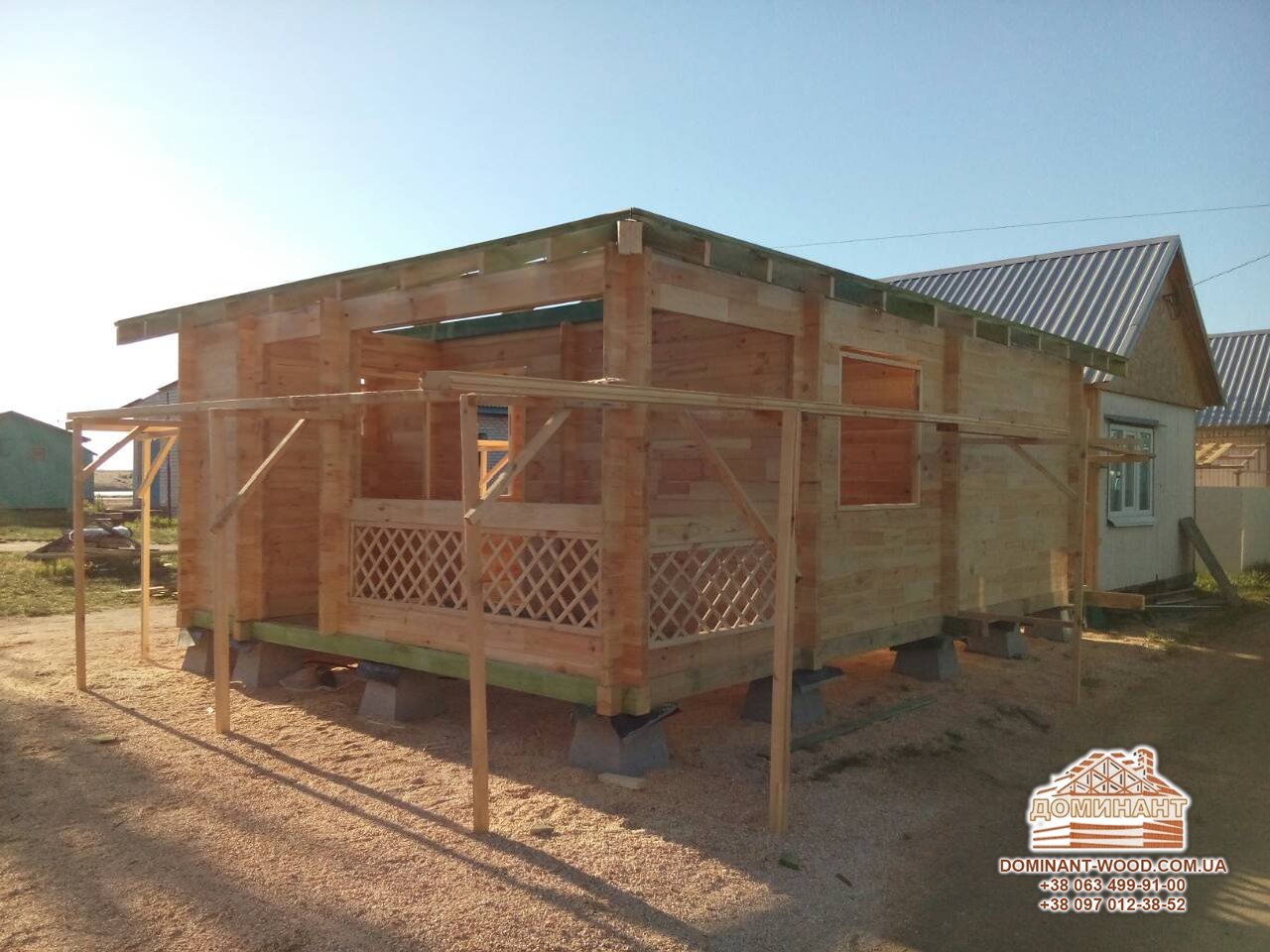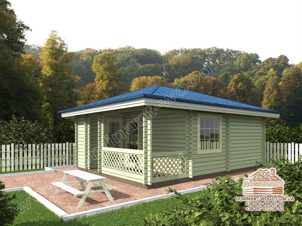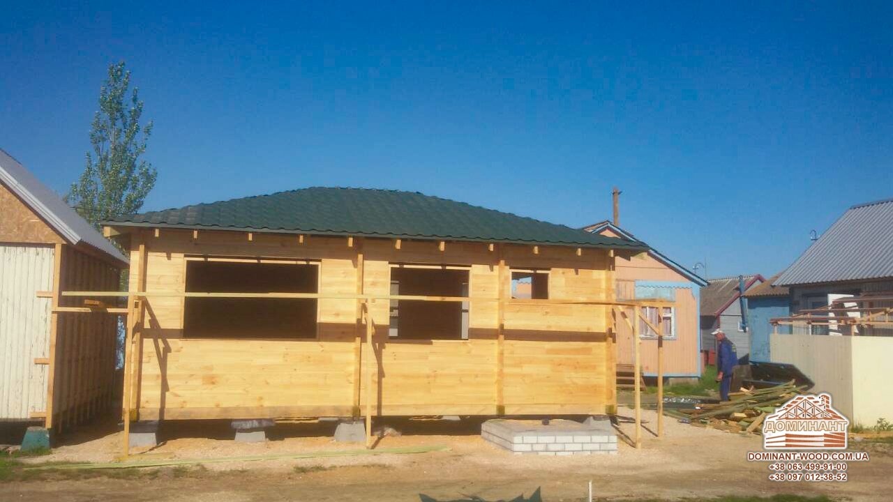 Нещодавно фахівці компанії «Домінант» звели офіс з сухого бруса 5 на 7 м по проекту «Шарлез» в Генічеському районі Херсонської області. Проект був створений з розрахунком на те, що співробітники офісу проводитимуть час на роботі з користю для здоров'я. Головна перевага деревини серед інших будівельних матеріалів в тому, що вона відмінно пропускає кисень, це буде сприяти гарному самопочуттю людей протягом робочого тижня. Крім того, дерево відрізняється прекрасними теплоізоляційними характеристиками, в такому приміщенні буде комфортно як в спекотну пору, так і в люті морози. Обов'язково відзначимо, що наш проект «Шарлез» виконується з бруса товщиною всього 60 мм, так як він розрахований на сезонну роботу. Офіс є адміністративним приміщенням бази відпочинку біля моря і буде працювати тільки в літній час. Якщо розраховувати всесезонне офісне приміщення, необхідно, звичайно, вибирати більшу товщину бруса.