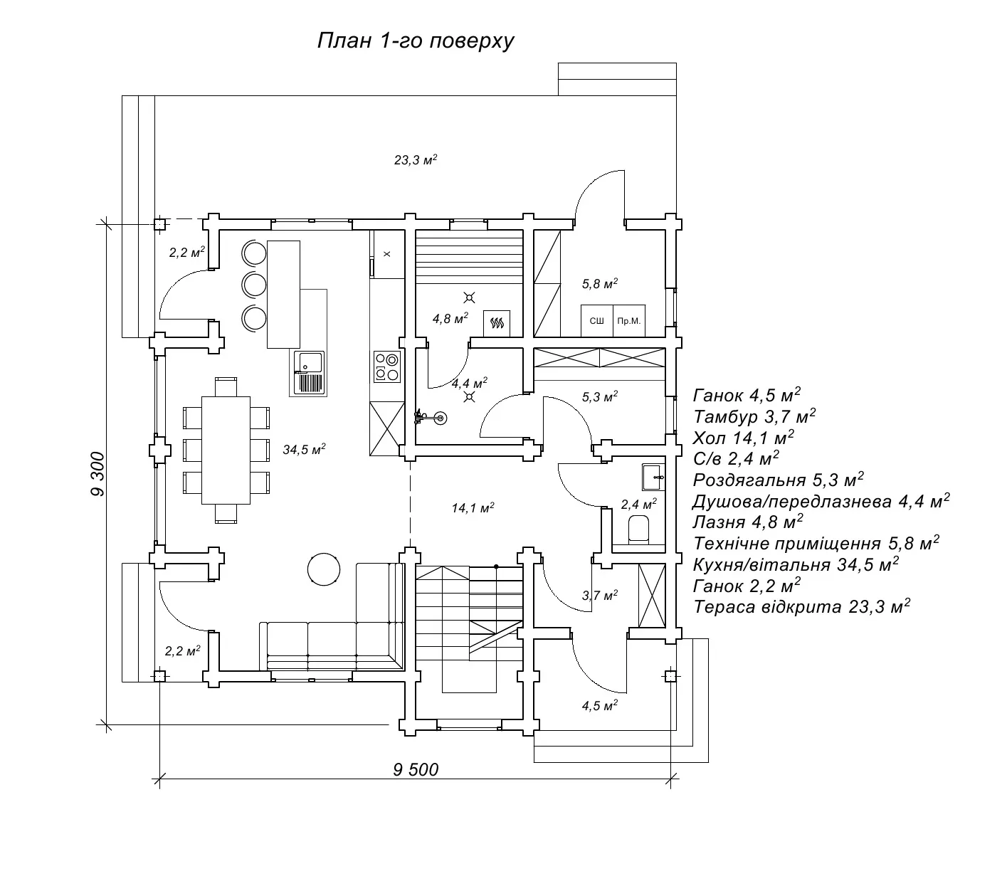 Привабливість «Енотери» не обмежується лише зовнішнім виглядом. Всередині ви виявите простір і комфорт. Перший поверх об'єднує вітальню та кухню-студію у єдиний простір, створюючи 34,5 м2 студійного простору. При вході в будинок вас зустріне тамбур, а за ним розташовані хол і зона лазні, включаючи невеличку парилку, душ та роздягальню. Технічне приміщення забезпечить оптимальну роботу технічного обладнання для обігріву будинку та лазні. Другий поверх складається з чотирьох спалень, три з яких мають балкони, коридору і ванної кімнати. Такий розподіл житлової площі дозволяє кожному мешканцю мати свій особистий простір, а парилка стане відмінним доповненням для оздоровчих процедур. Котедж «Енотера» просто створений, щоб стати оазисом комфорту та естетики природних матеріалів.