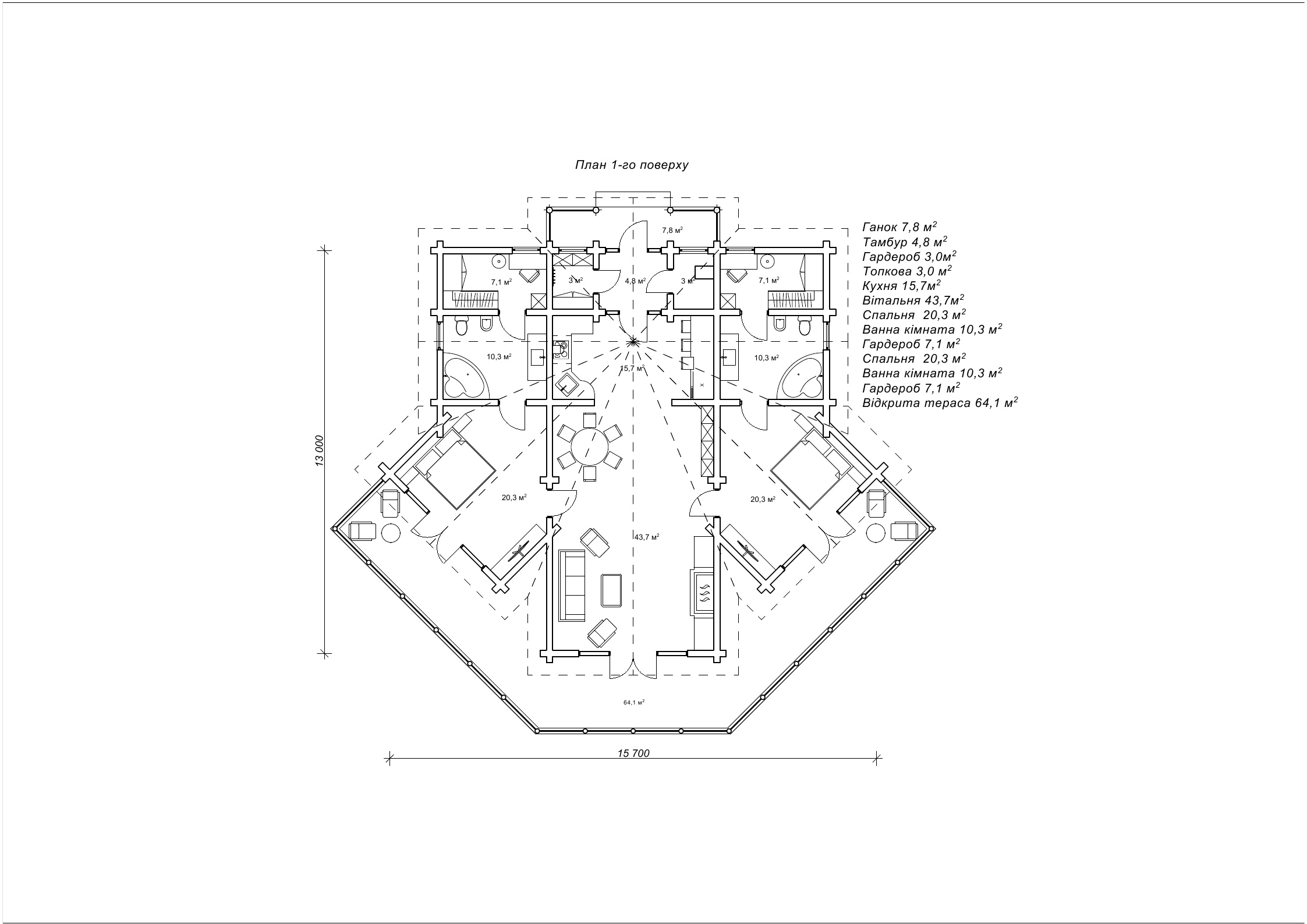 Проект виконаний з оциліндрованих колод. Саме з цього матеріалу можна відтворити нестандартні архітектурні обриси, поєднуючи колоди за допомогою косих чаш, а не тільки прямокутних. Така цікава архітектура створює простір для фантазії при оформленні інтер’єру. Особливо це стосується незвичного розташування спалень, що, ніби промені, виходять з вітальні у цьому котеджі. Особливою відзнакою проекту «Аденор» є просторі розміри кожної кімнати. Площа кожної спальні складає більше 20 м2, тут в кожного мешканця буде безліч особистого простору. Також планом будови передбачено багато вікон, що дозволяють великій кількості денного світла проникати всередину, сповнюючи оселю теплом і затишком.
