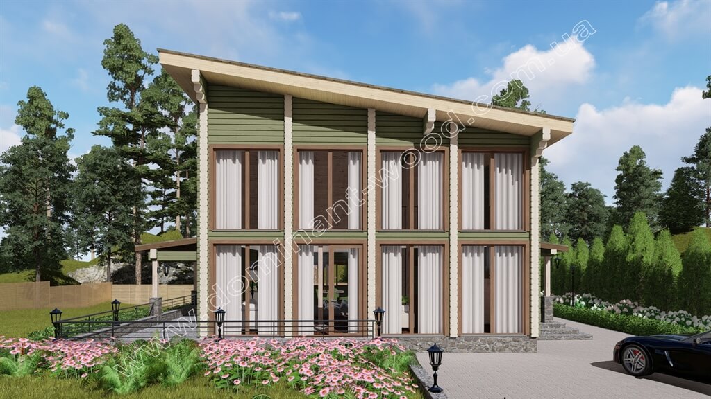 Проект дерев'яного будинку «Ейдіс» - це двоповерховий маєток, розроблений в сучасному стилі з великою кількістю скління та панорамних вікон, що надає можливість насолоджуватись прекрасним видом на природу.