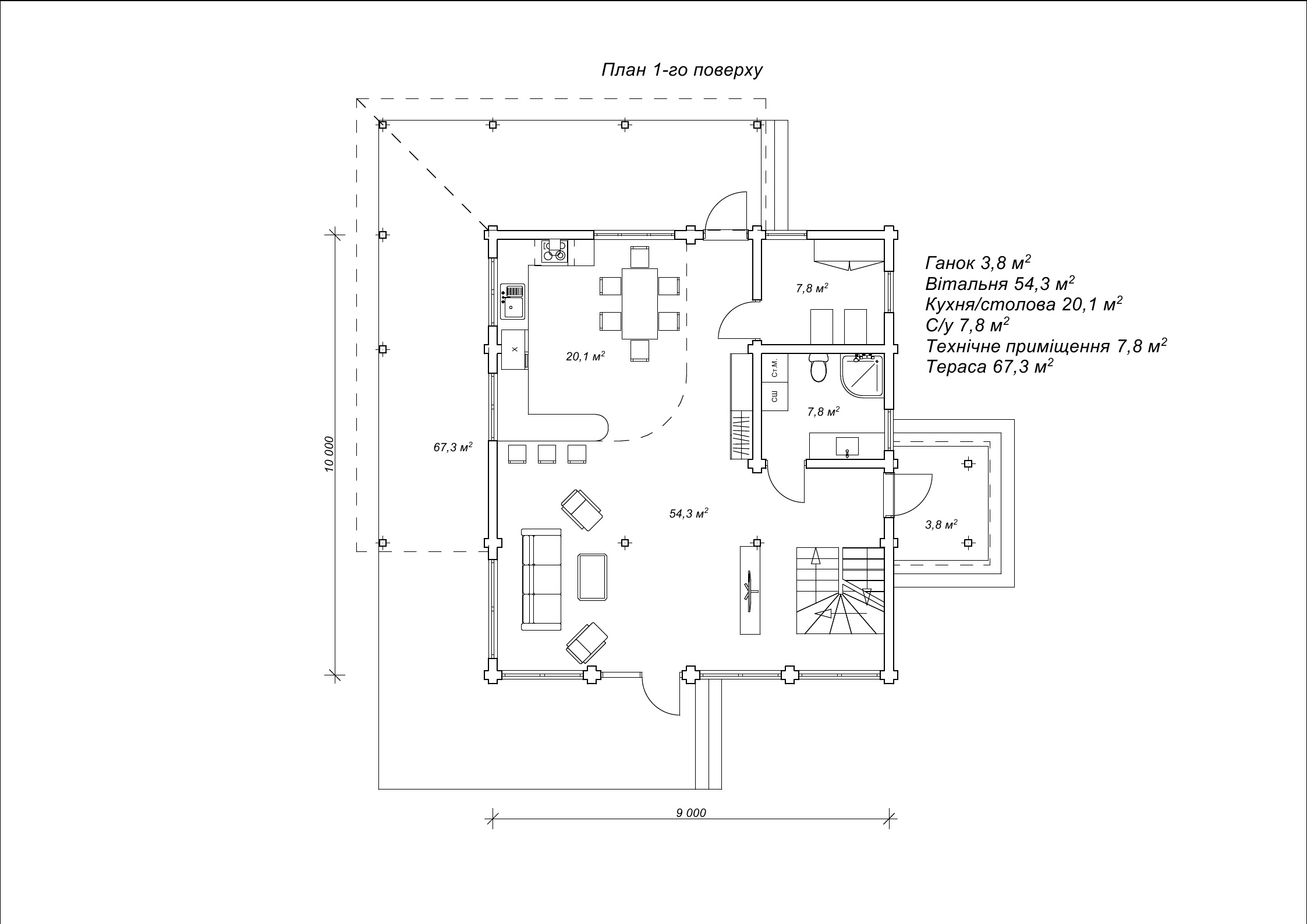 Це чудовий приклад того, як сучасно і цікаво може виглядати дерев’яна споруда. Саме виконання стін зі струганого, профільованого брусу після прес-вакуумного сушіння, надає такого вишуканого та елегантного вигляду проекту «Ейдіс». Цей проект з профільованого брусу має осьові параметри 10х9 м та складається з двох повноцінних поверхів з односкатним дахом та великою терасою. Загальна площа будинку, включаючи терасу, становить 220 м?. На першому поверсі розташовані велика вітальня зі скляними стінами, кухня/їдальня, санвузол, технічна кімната та простора тераса. На другому поверсі знаходяться хол, ванна кімната, гардеробна та дві спальні. Цей проект будинку є ідеальним варіантом для сучасних людей, яких цікавить не лише комфорт але й естетична складова життєвого простору.