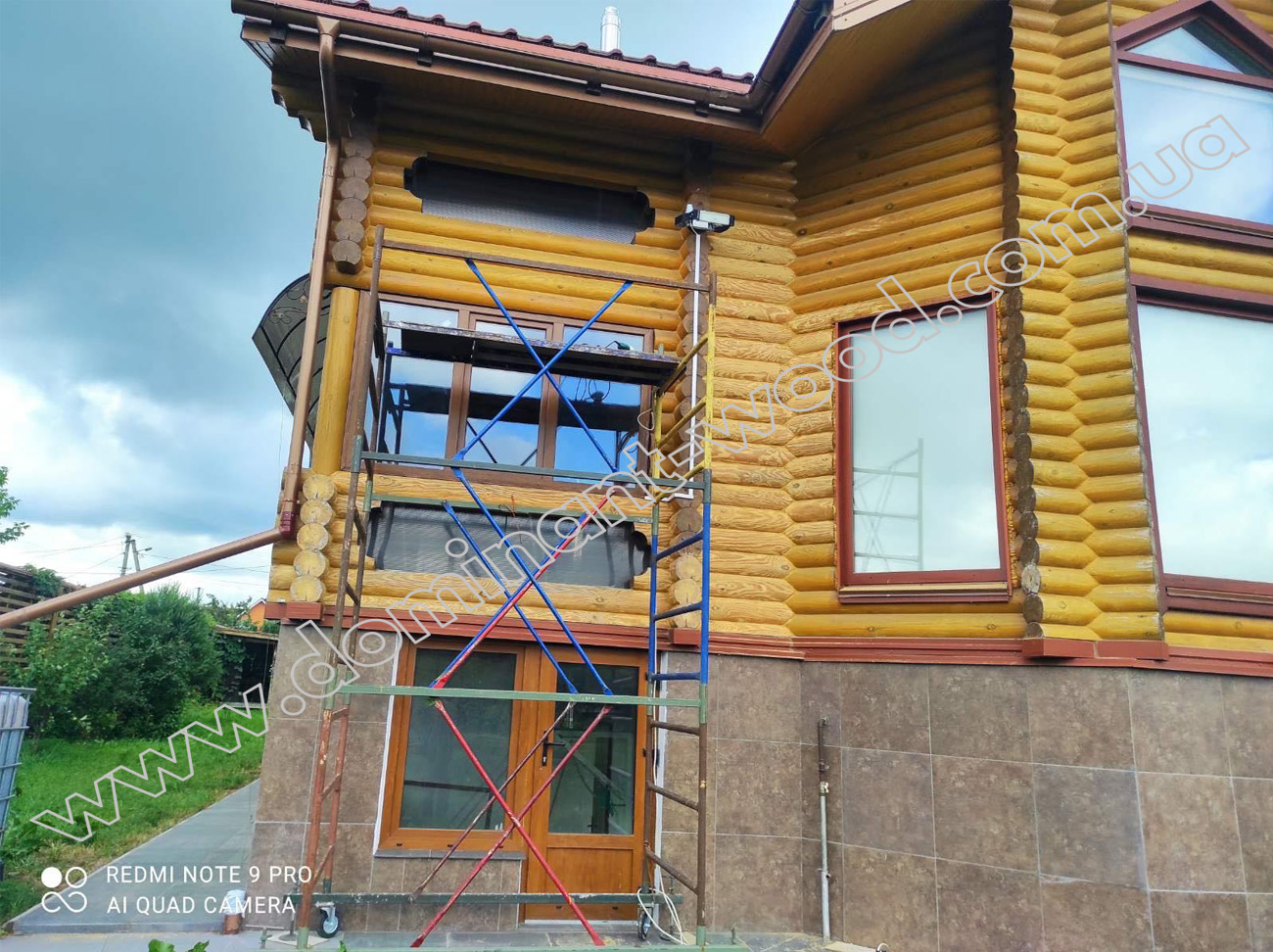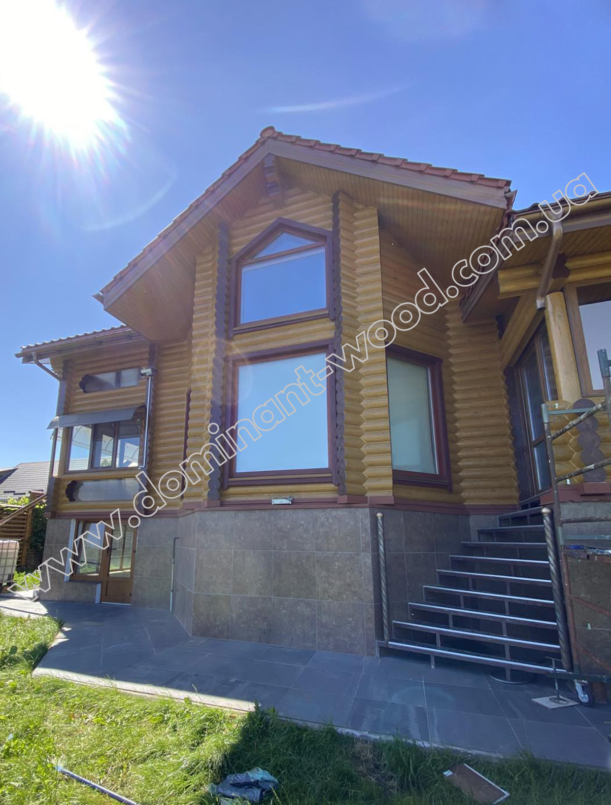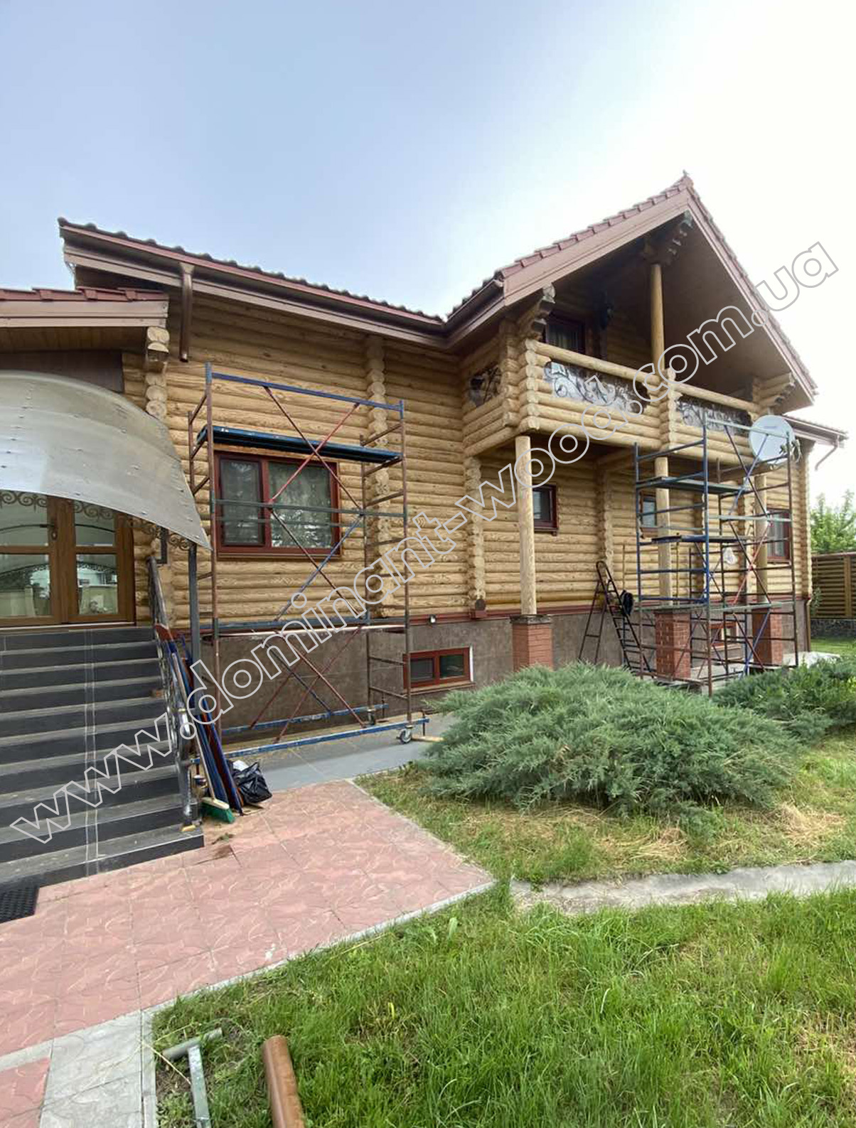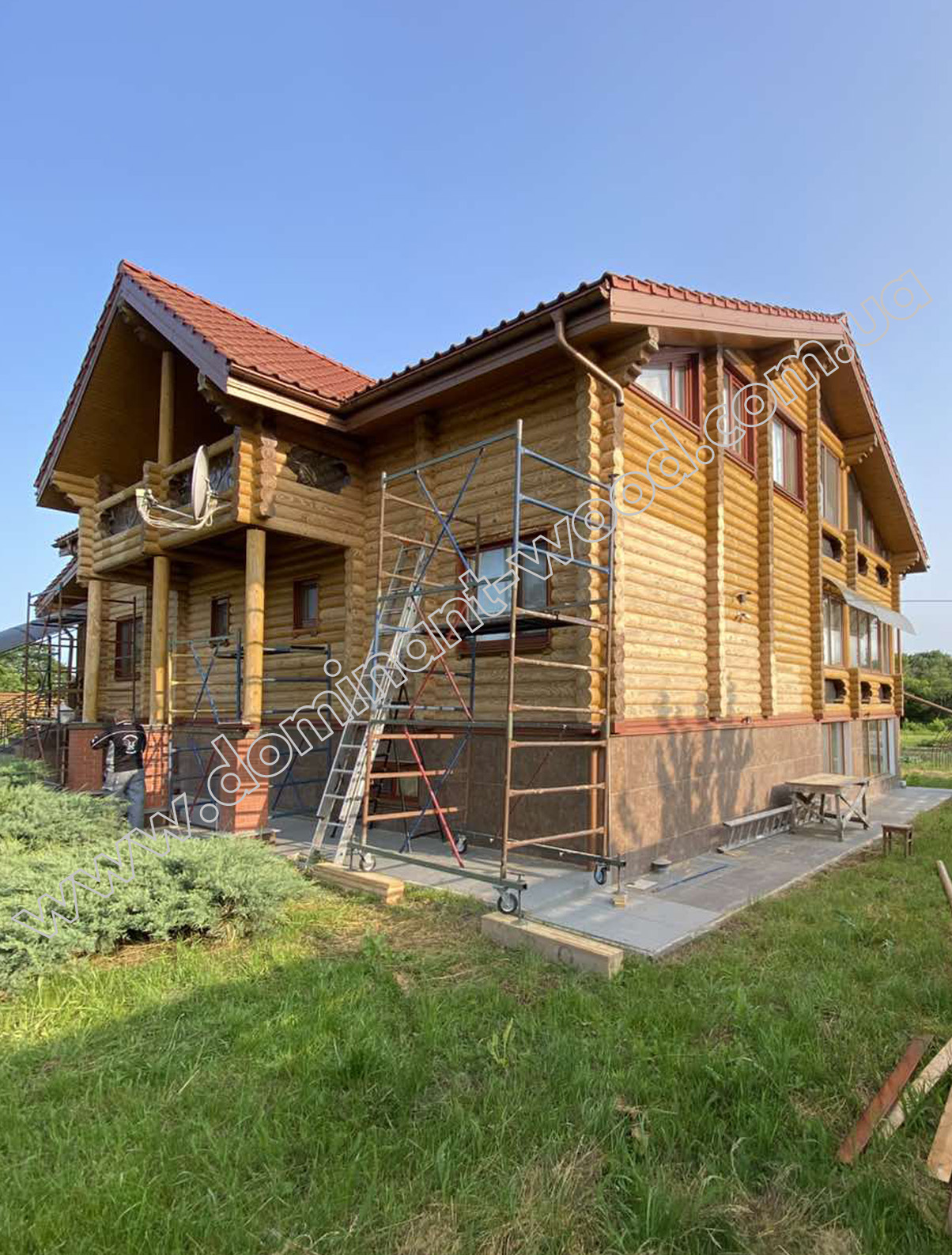 Фасад маєтку, виконаний з ошатного оциліндрованого брусу, виглядає респектабельно. Тож саме щоб освіжити привабливий і багатий вигляд будинку, нещодавно майстрами «Домінант» було оновлено покриття стін. А саме ми пошліфували і перефарбували зруб, тим самим прикрасивши і захистивши його ще на майбутні шість-вісім років.