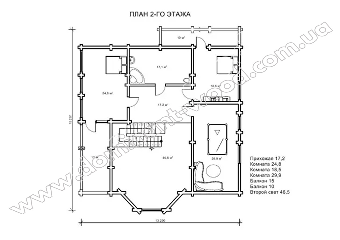 Другий поверх продовжує концепцію зручності та відкритого простору. Тут розташовано дві просторі спальні, дві ванні кімнати й два балкони, з яких відкриваються чудові краєвиди. Особливої уваги заслуговує простір другого світла, завдяки йому вітальня на першому поверсі завжди залита сонячним світлом. Це пожвавлює атмосферу всередині всього будинку! Дуже цікавою родзинкою другого поверху виступає велика кімната площею 29,9 м2, де розташовано більярд. Так як всі наші плани мають суто рекомендаційний характер, то в кімнаті з більярдом можна розмістити щось інше, наприклад, обладнати спортзалу або поставити настільний теніс. Також можна зробити в приміщенні додаткову спальню, кабінет, дитячу ігрову чи гостьову кімнату.