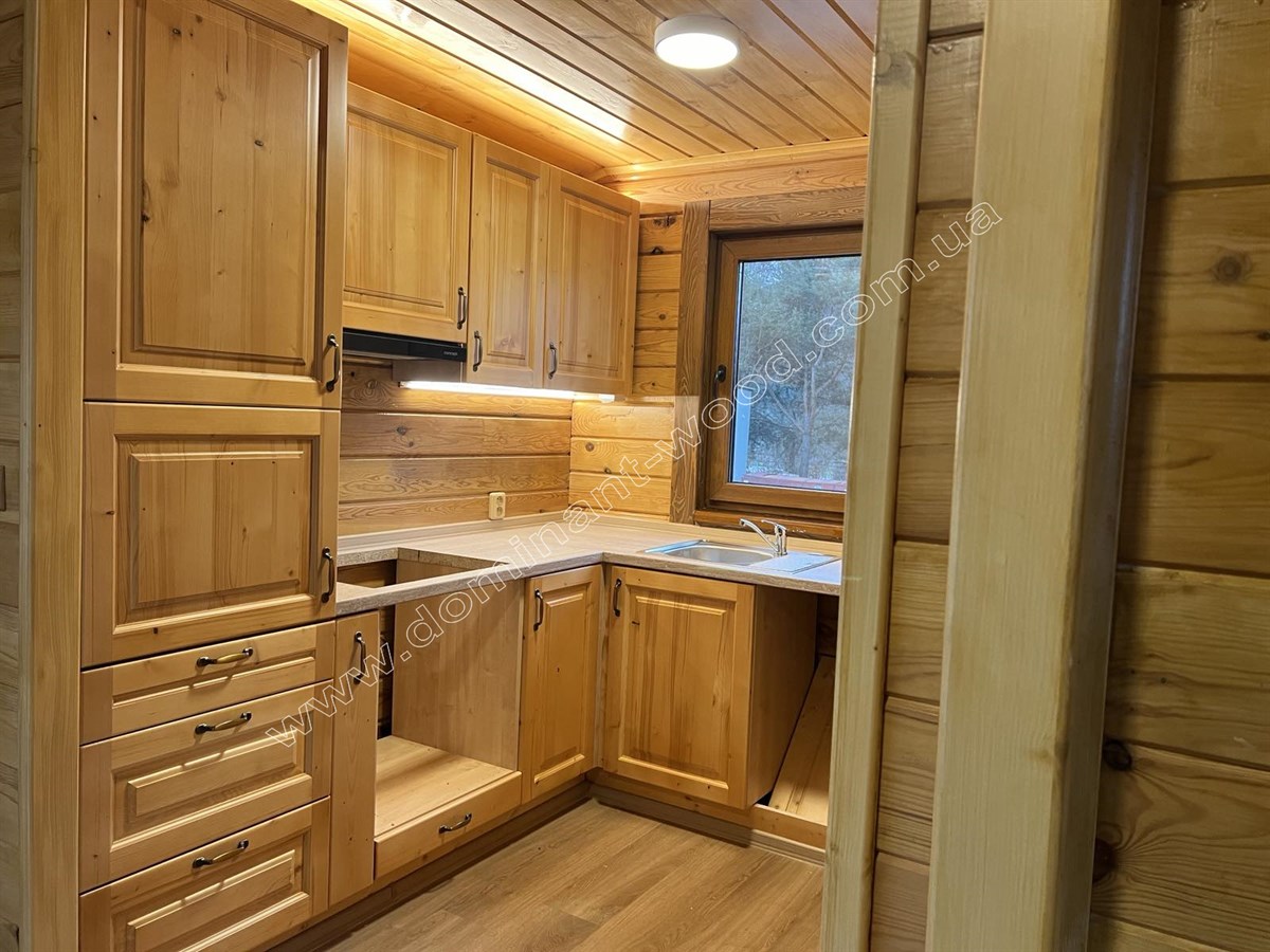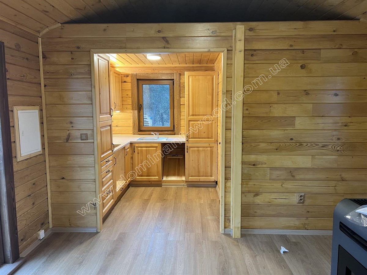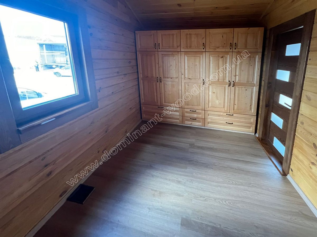 Так само котедж може використовуватись як влітку, так і взимку. Достатня товщина соснових брусів, з яких складені стіни, а саме 200 мм робить будову всесезонною за рахунок гарної теплоізоляції. Такої товщини соснового брусу вистачає для круглорічного проживання з комфортом, адже по показниках теплоізоляції 200 мм сосни еквівалентно 890 мм цегляної стіни. Плюс колоду не потрібно рівняти, обшивати, утеплювати та оздоблювати. Вона сама по собі естетично приваблива і має довершений вигляд. Погодьтеся, що добротний вигляд масиву дерева створює дуже гарне враження від будиночку, і він виглядає набагато ошатнішим і шляхетнішим, ніж металеві, пересувні вагончики. Звичайно, рекомендується пофарбувати будиночок по завершенню усіх робіт зовні і в середині. Але про безпеку конструкції перед загорянням, сирістю, грибками та шкідниками господарю турбуватися не знадобиться, адже ми вже подбали попередньо про захист комплекту будинку на заводі, обробивши його антисептиком ще до відвантаження на експорт.