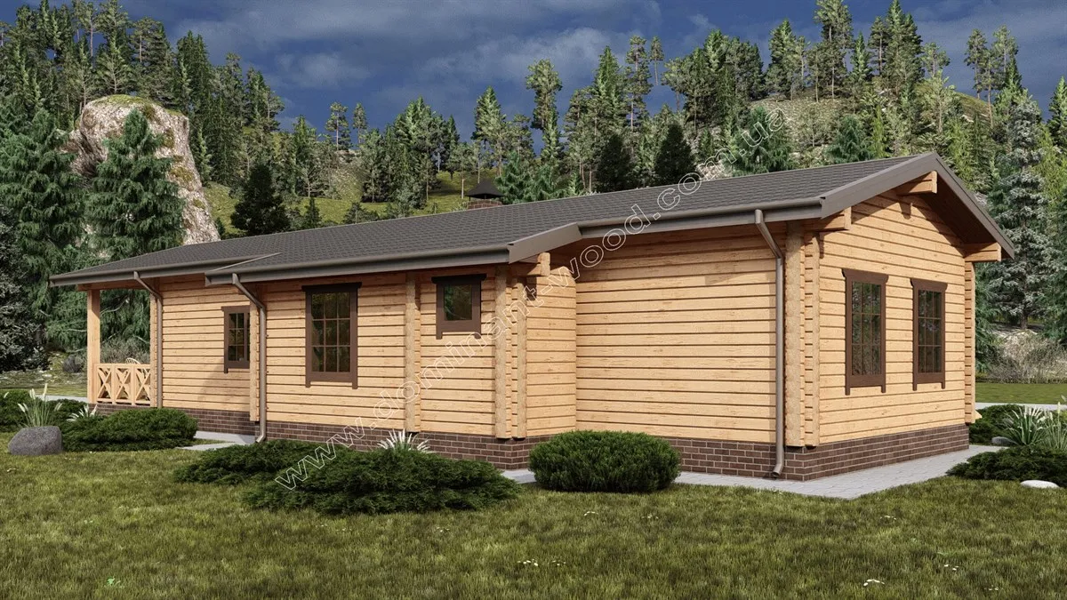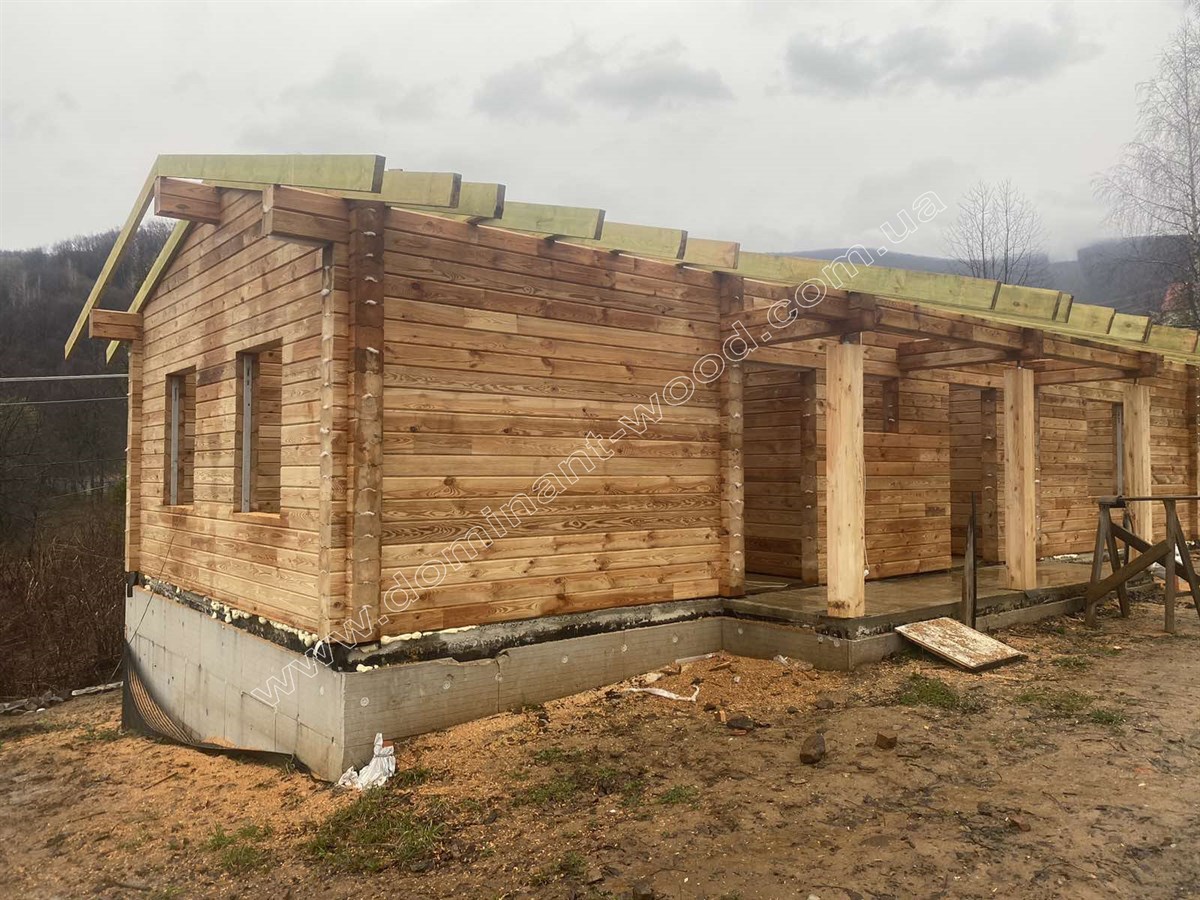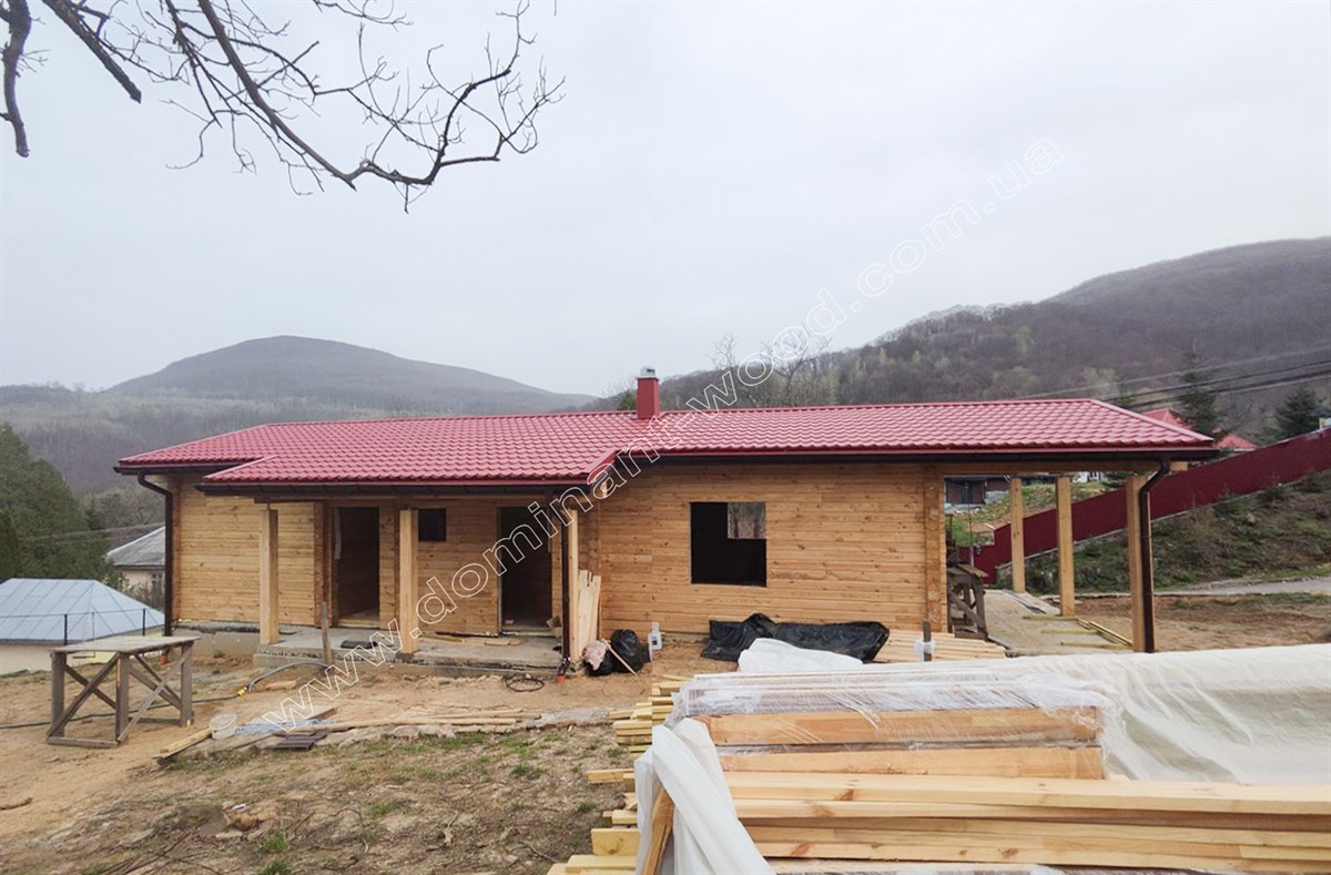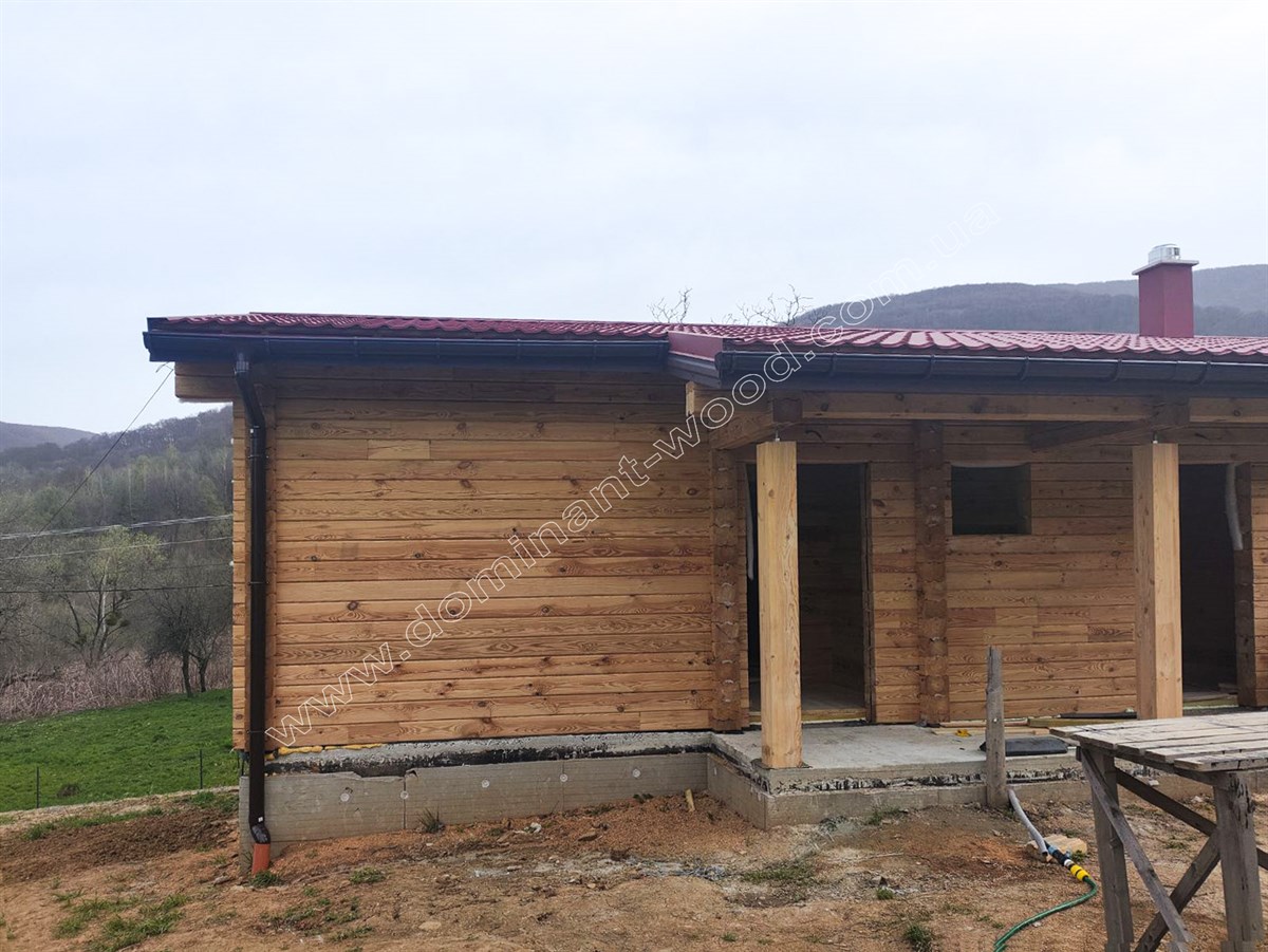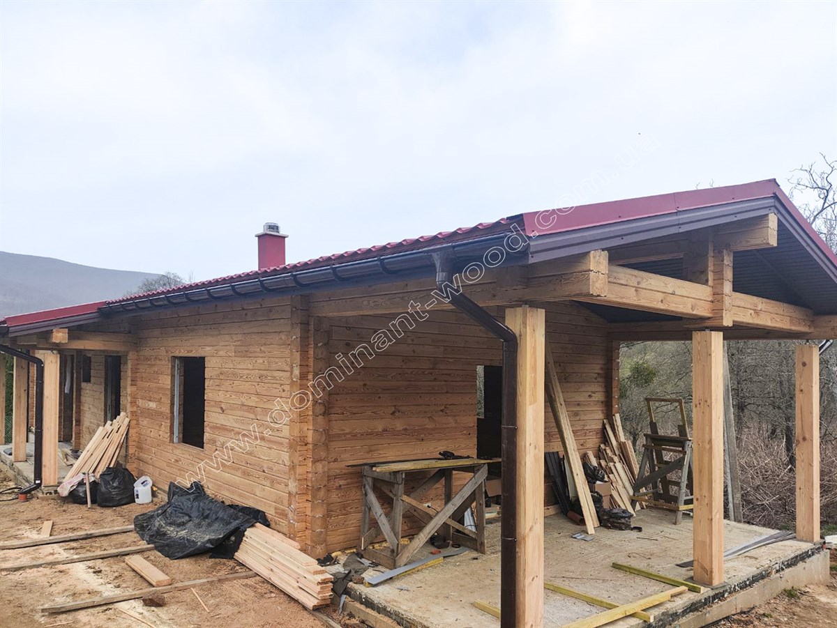 Зовнішня презентабельність струганих, дерев’яних стін не вимагає ніяких додаткових прикрас у вигляді обшивки фасадів, декорування або облицювання. Достатньо лише підкреслити природну естетику шліфуванням та покриттям для захисту і довговічності. Тому котеджі з брусів можна порівняти з готовими конструкторами, які достатньо легко і швидко складаються та не потребують масштабних фінішних робіт. За окрему вартість майстри «Домінант» можуть зібрати такий готовий будинковий комплект на фундамент замовника та доповнити зруб покрівлею, поставити вікна, двері, тощо. Саме таку додаткову комплектацію ми виконали по замовленню на котедж «Олеандра».