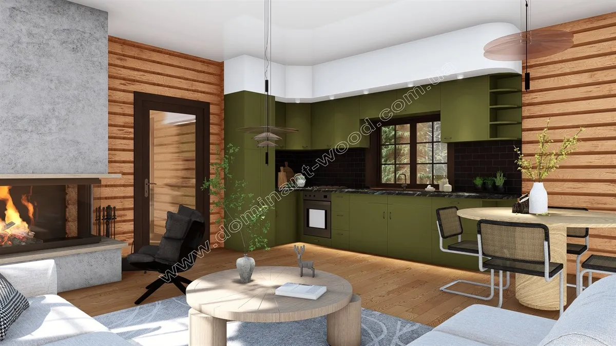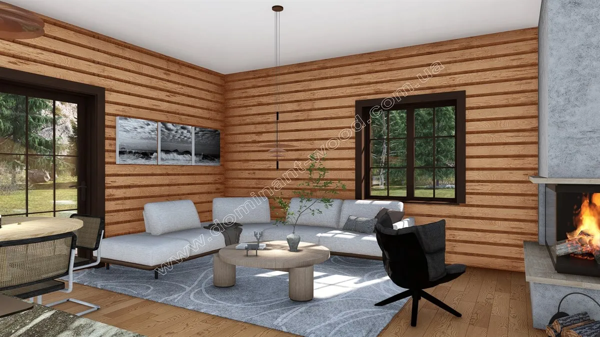 Для конструкцій зі струганого, профільованого брусу, рекомендується покриття внутрішніх стін безкольоровим воском, що підкреслює природну текстуру дерева, тоді як зовнішні стіни розфарбовують з додаванням кольорового відтінку, забезпечуючи захист від погодних умов. Звісно, що можна робити будь-яке колірне рішення та інтер’єр за власним смаком. І у дерев’яному будинку геть не все повинне бути дерев’яним. Дуже ефектно дерево поєднується з іншими природними матеріалами, наприклад камінь, скло, ковані конструкції. Але саме дерево прекрасне, тому його багата текстура вже слугує неабиякою прикрасою простору. Отже нашим замовникам ми завжди радимо необхідний мінімум оздоблення, але узгоджуємо фінішні роботи по будиночкам так само застосовуючи виключно індивідуальний підхід. У кожного своя формула ідеального будинку, і ми надаємо всі можливості отримати бажану будівлю, укомплектовану відповідно до смаків її мешканців. До базового комплекту проекту «Олеандра», що складається з висушених, профільованих брусів 200*150 мм, замовник побажав послугу монтажу у себе на ділянці, а також покрівлю, вікна і двері. Таким чином ми здали роботу на етапі замкнутого контуру, коли будівля повністю закрита і захищена від зовнішніх, атмосферних факторів, і можна переходити до внутрішніх робіт.