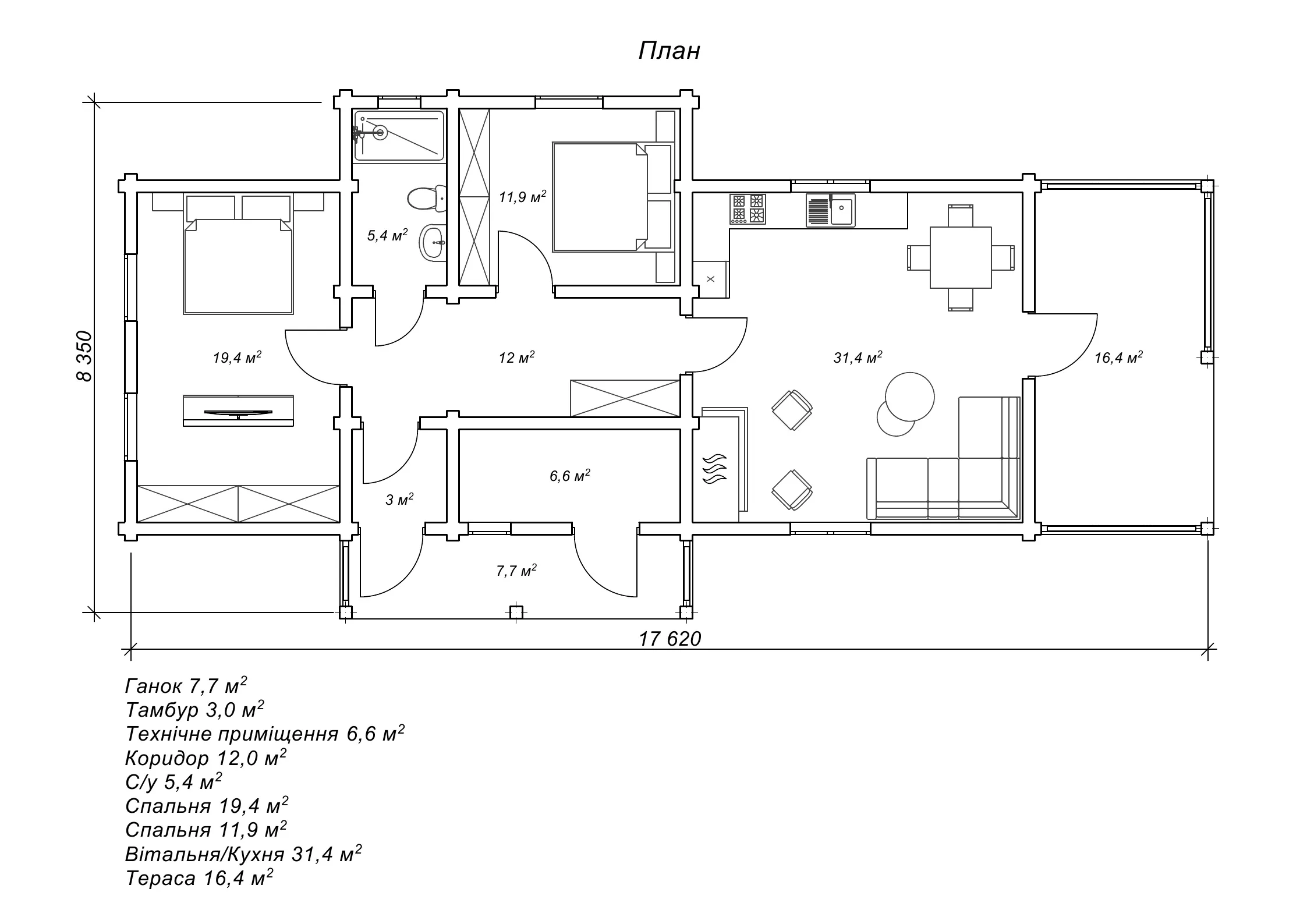 Цей проект включає дві великі спальні, простору вітальню з кухнею, терасу, тепловий тамбур, технічне та інші приміщення. У відповідності до бачення замовника саме такий набір приміщень забезпечить його родині максимальний комфорт і дозволить проводити час біля будинку на свіжому повітрі відкритої тераси, захищеної навісом. Усі приміщення сплановані на одному рівні. Площа котеджу «Олеандра» становить 113,8 м2, враховуючи терасу. Саме за рахунок великої тераси, будинок прийняв видовжену, прямокутну форму і його розміри склали 8,3 на 17,6 метрів. Для спорудження стін було обрано сухий, профільований брус розміром 200*150 мм. Товщина соснового брусу 200 мм і щільне сполучення брусів між собою шип у паз по всій цій площині підходить для круглорічного проживання. Враховуючи низький коефіцієнт теплопровідності соснової деревини, її 200 мм еквівалентні 890 мм цегляної стіни. Тому сосновий будиночок «Олеандра» буде теплим всередині взимку і прохолодним у спекотні дні, адже внутрішній мікроклімат буде підтримуватись природним чином завдяки виконанню будови зі справжнього, теплого і дихаючого дерева.