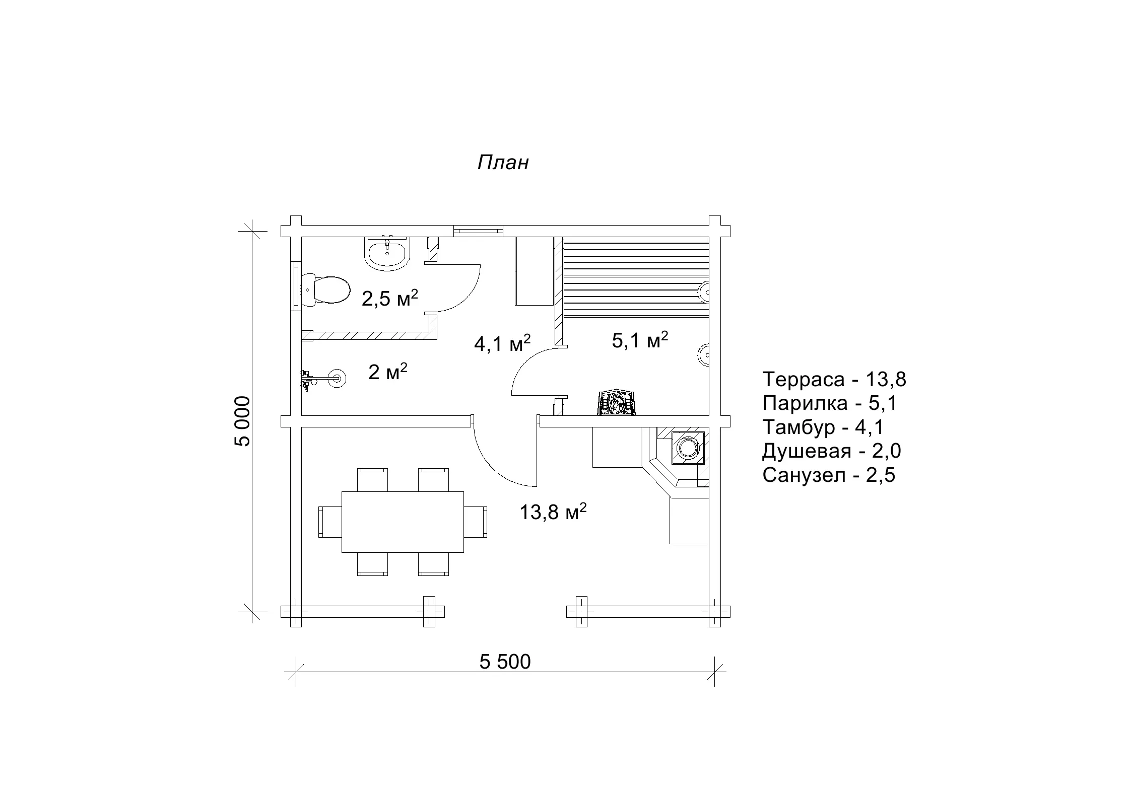 Загальна площа лазні «Карой» становить лише 27,5 м². Ця мініатюрна будівля розміром 5х5 м легко розміститься поруч з основним житловим приміщенням навіть на невеликій ділянці. Незважаючи на компактні розміри, проект «Карой» порадує всіх, хто любить оздоровлюватися в гарній лазні, а також тих, хто цінує свіже повітря та застілля зі стравами, приготованими на мангалі. Лазня «Карой» поєднує в собі два приміщення - парилку та альтанку на свіжому повітрі з мангалом. Це означає, що власнику такої лазні не потрібно буде думати про придбання окремої дерев'яної альтанки. Проект «Карой» вже містить все необхідне для найкращої організації заміського відпочинку.