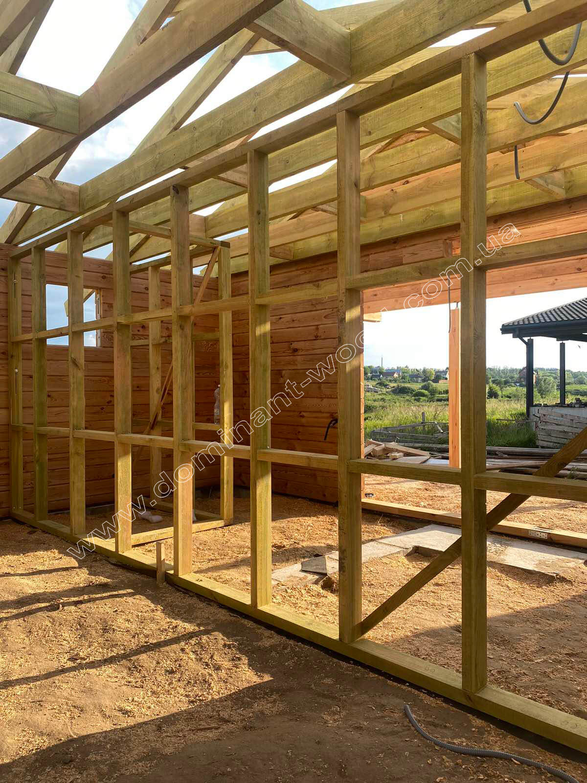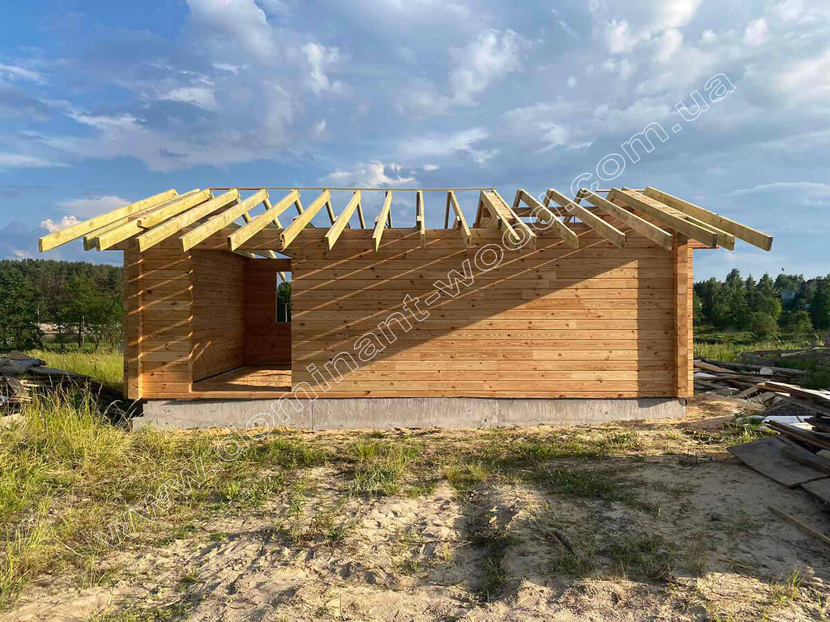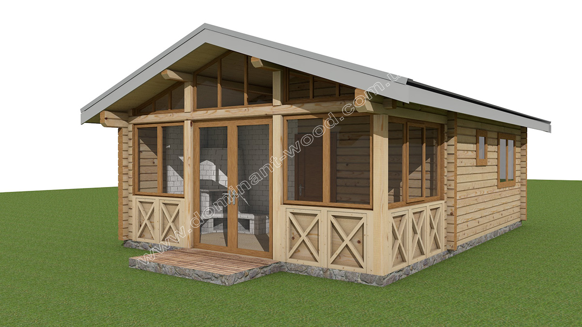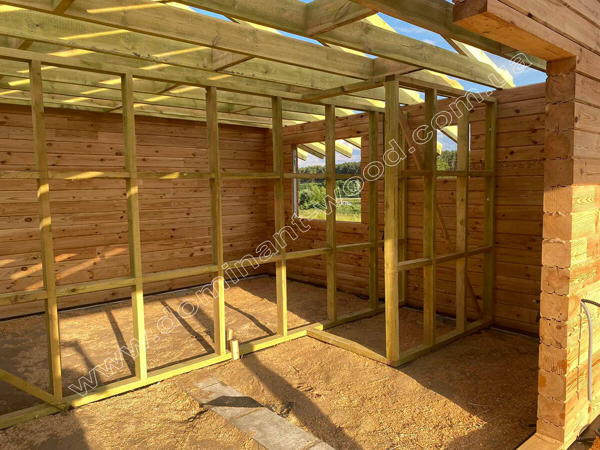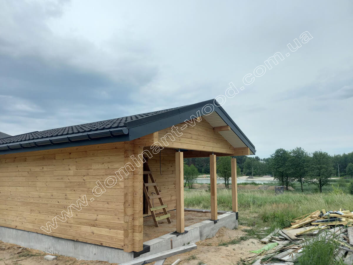 Перше, що захотів клієнт, так це зробити в лазні закриту веранду замість відкритого ґанку. Таким чином він отримав більше функціональності та затишку на веранді, що стала захищеною від непогоди у будь-яку пору року. Але тим самим замовник підвищив вартість споруди, адже до базового комплекту додалось чимало матеріалів. Враховуючи фінансові можливості і побажання клієнта, ми внесли відповідні зміни у технічний проект по збірці дерев’яної конструкції.