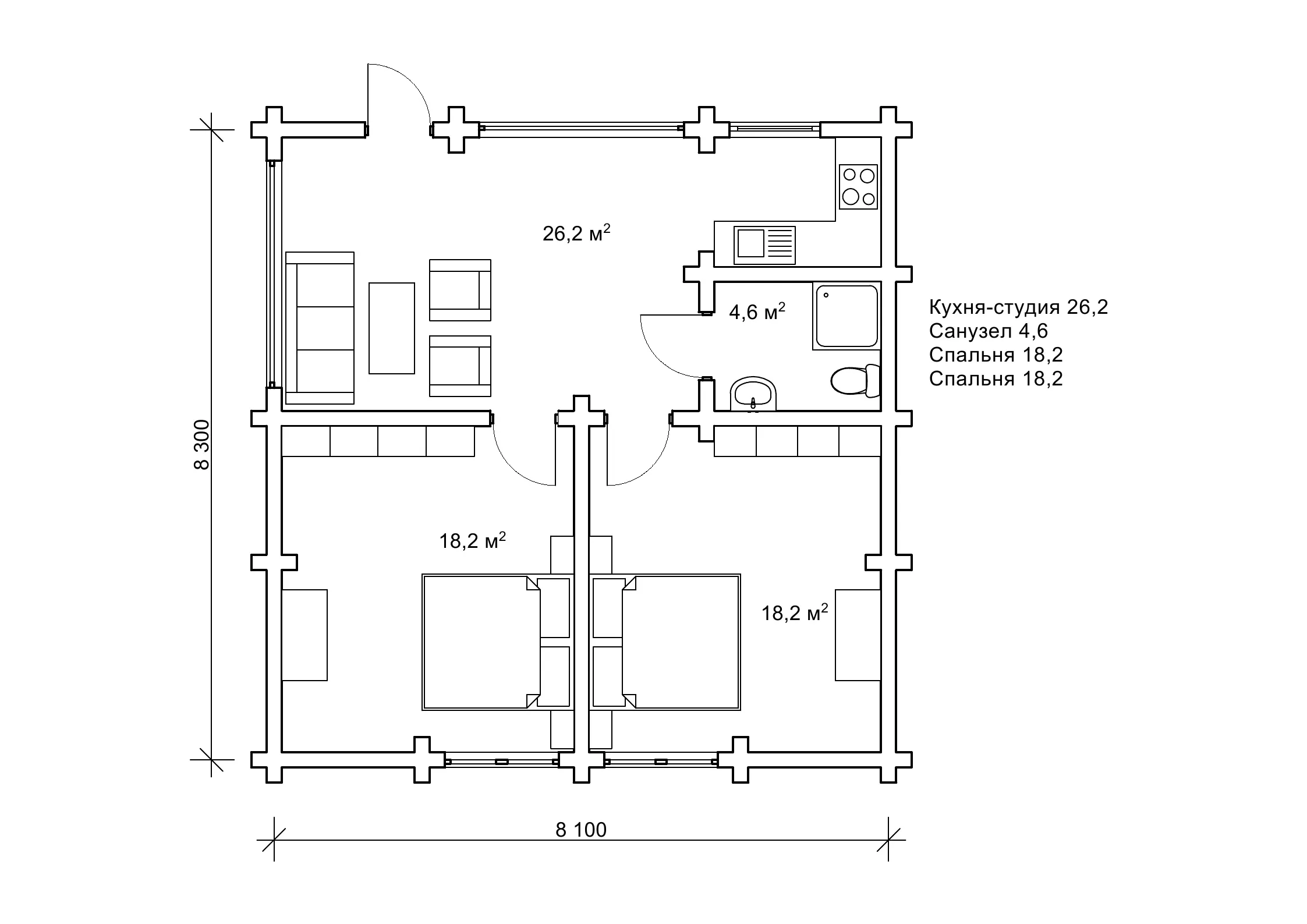 «Діната» - це компактний будиночок, розміри якого 8х8 м дозволяють легко розмістити його на невеликій ділянці. Такий котедж буде зручним для сімейної пари з дитиною або двома дітьми, бо планування кімнат передбачає дві спальні. Загальна площа будівлі - 67,23 м2, включаючи простору кухню-студію (26,2 м2) та санвузол (4,6 м2). Такий план дерев'яного будинку є досить типовим і його можна знайти також в інших проектах «Домінант», наприклад, «Алекс2», «Лекід2» «Дафна», «Флейта» та інших двокімнатних котеджах, які ми багато разів будували нашим замовникам. Так само й в індивідуальному проекті гостьового котеджу з утепленими стінами, який ви можете розглянути в деталях в нещодавній новині на нашому сайті.