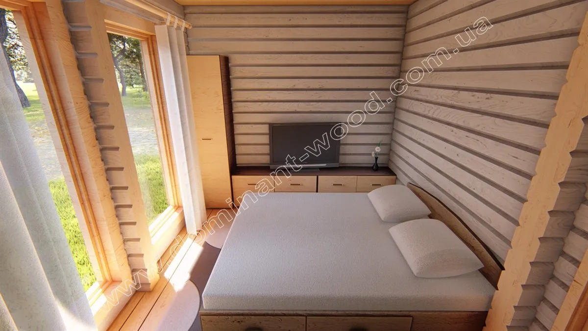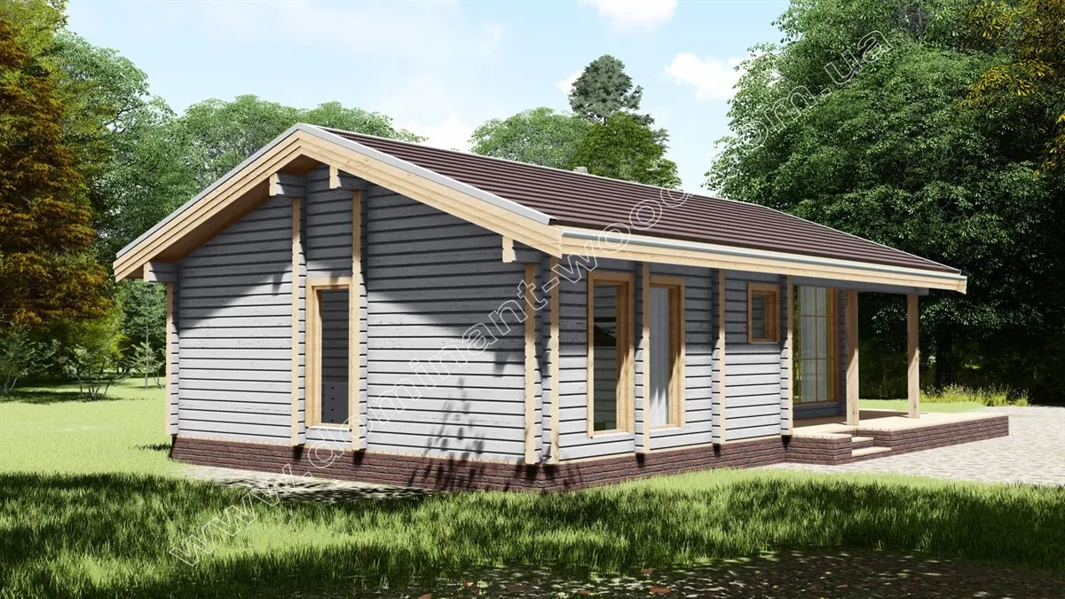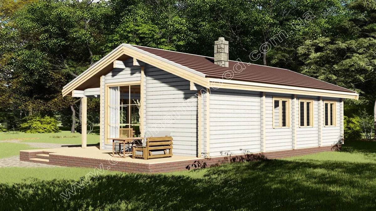Економічна вартість будівництва та фінішної обробки. Просте, але функціональне планування котеджу «Флама» разом із вибором прогресивної технології будівництва з просушених у пресс-вакуумній камері колод забезпечує помірну вартість базової комплектації і велику економію на фінішному оздобленні. Цей будиночок не потребує утеплення або обшивки чи облицювання стін. Його достатньо пошліфувати і пофарбувати на свій смак. Великий бонус від нашої компанії-виробника кожному клієнту - обробка вогнебіозахисним засобом першого ступеню ефективності включається у базову комплектацію, і це знімає з замовника турботу про безпечність та стійкість дерев’яного зрубу перед біологічними факторами або перед пошкодженням вогнем.