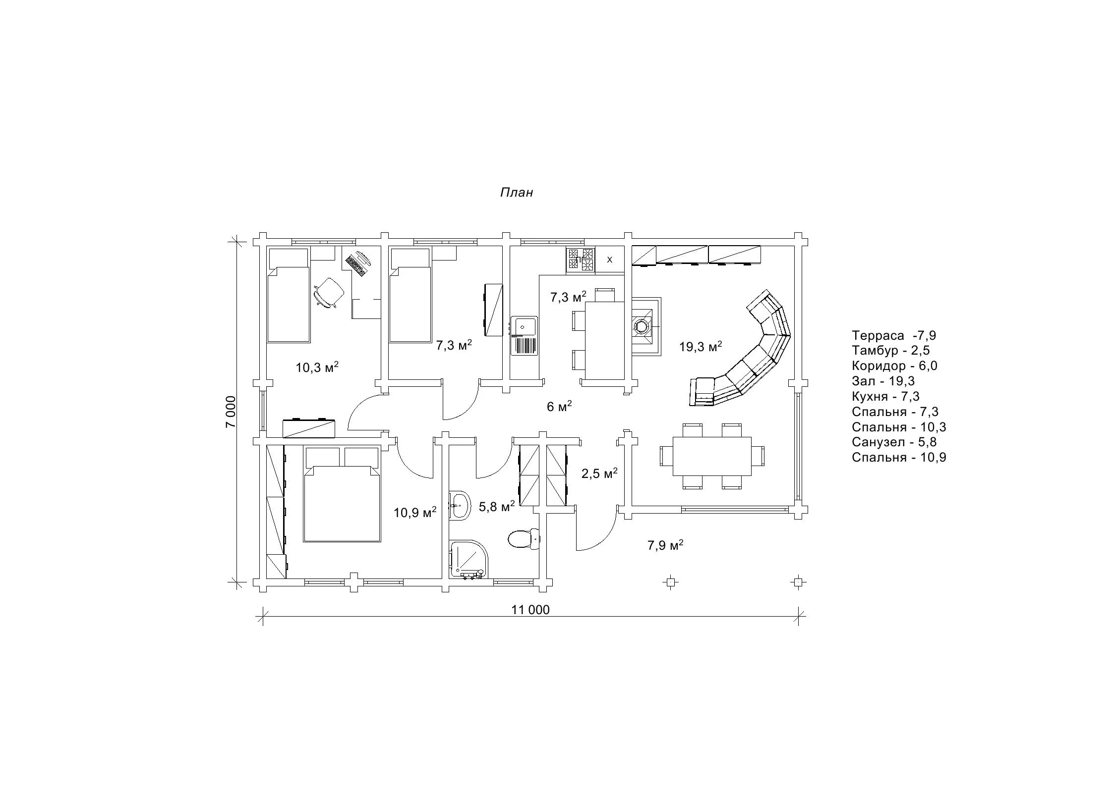 Планування з трьома спальнями. Планування котеджу «Флама» розташоване на одному поверсі, забезпечуючи максимальну функціональність та економічність на одному рівні, без необхідності переміщення по сходах. Габарити будинку складають 7 на 11 м, його проста, прямокутна форма і загальна площа 77 м2 роблять котедж ідеальним для будь-якої ділянки. Окремою перевагою планування зазначимо наявність трьох зручних спалень розміром від 7 до 11 м2, які забезпечують комфорт і приватність для кожного мешканця будиночку «Флама».