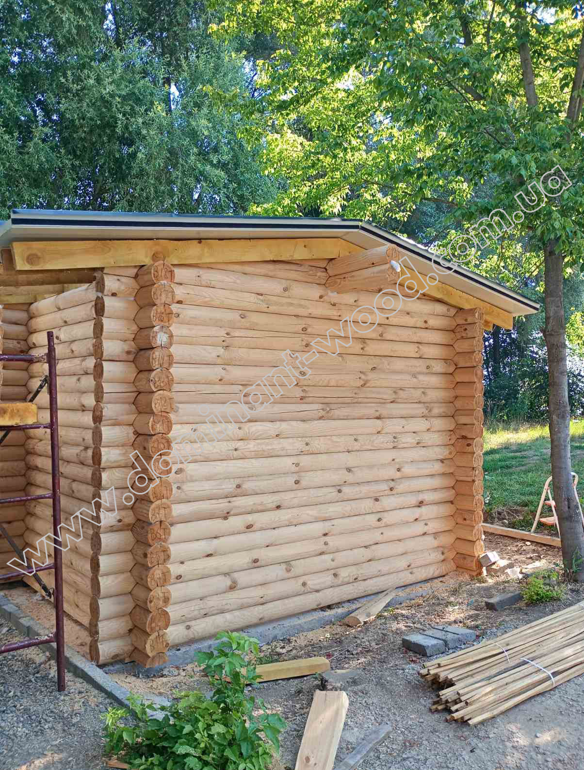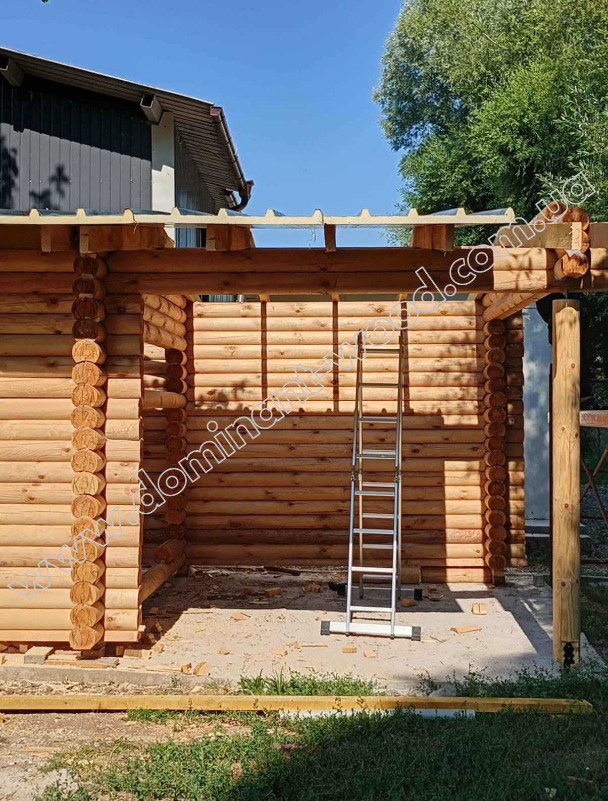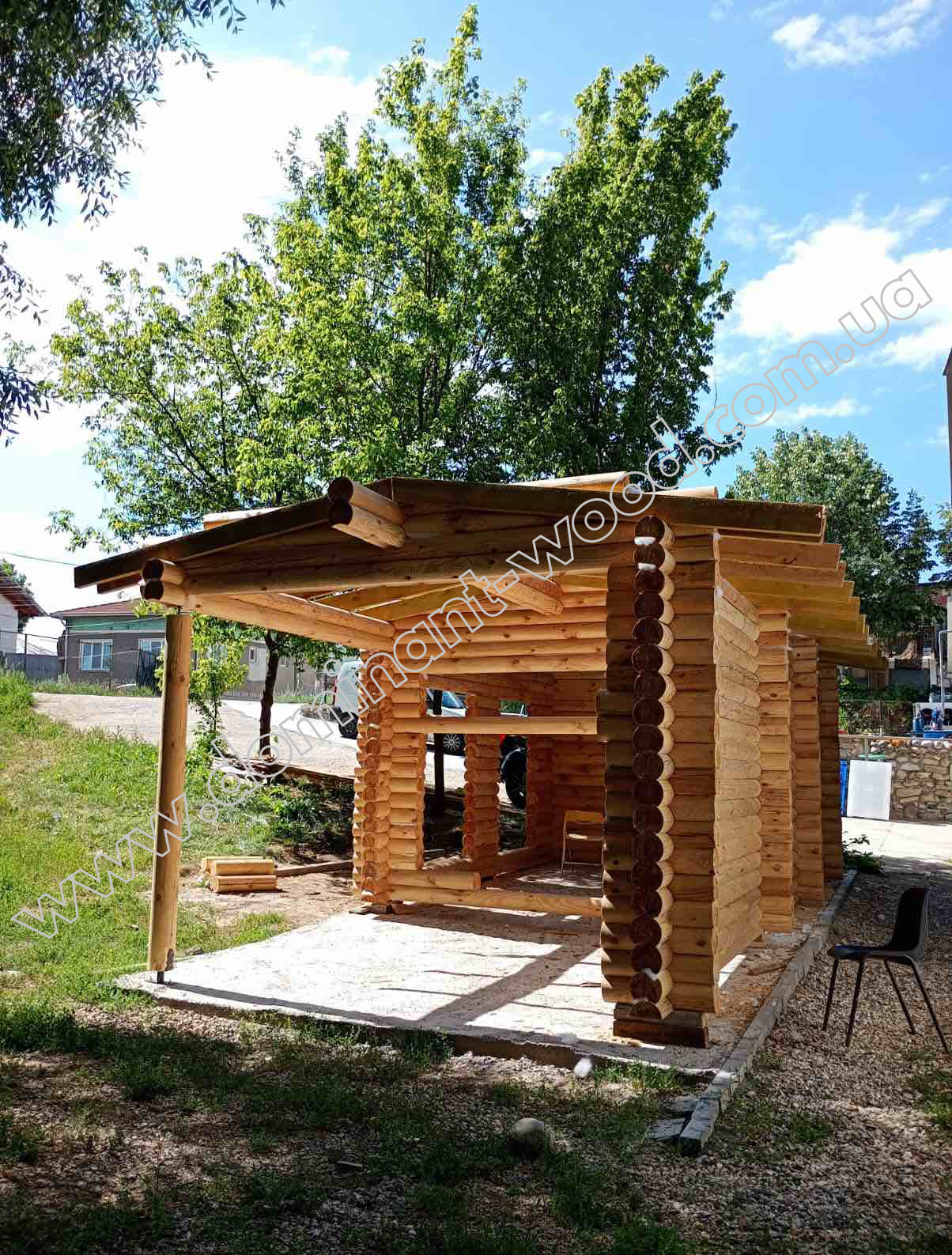Комплект проекту «Грімм» на експорт в Болгарію ми виконали з колод діаметром 160 мм - цілком достатнім для садової споруди, яка не призначена для постійного проживання, а слугує місцем для відпочинку на природі. Будинок-студія з колод не вимагає масивного фундаменту, і взагалі, для його будівництва потрібно мінімум ресурсів, проте рівень затишку, який вона створює, легко конкурує з великими спорудами. Це очевидно зі світлин будиночку, зібраного в Разлозі.