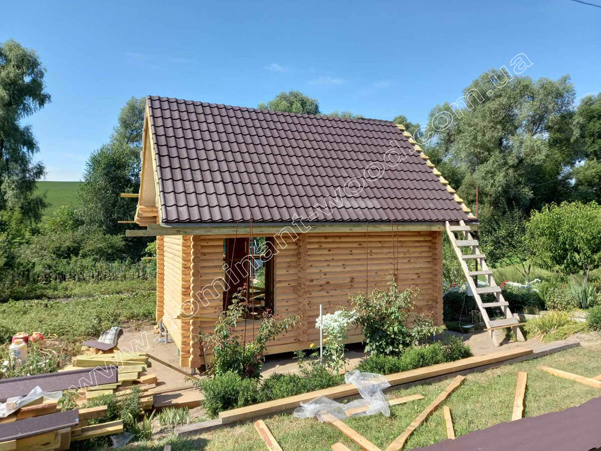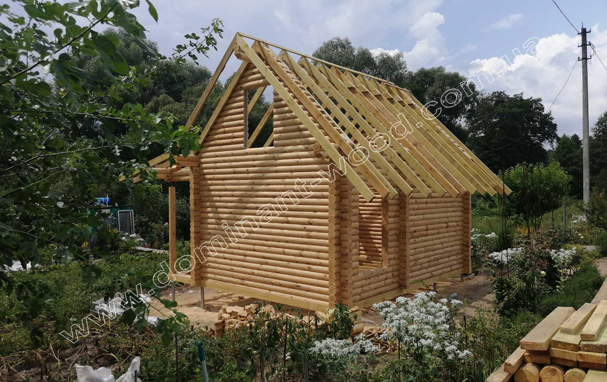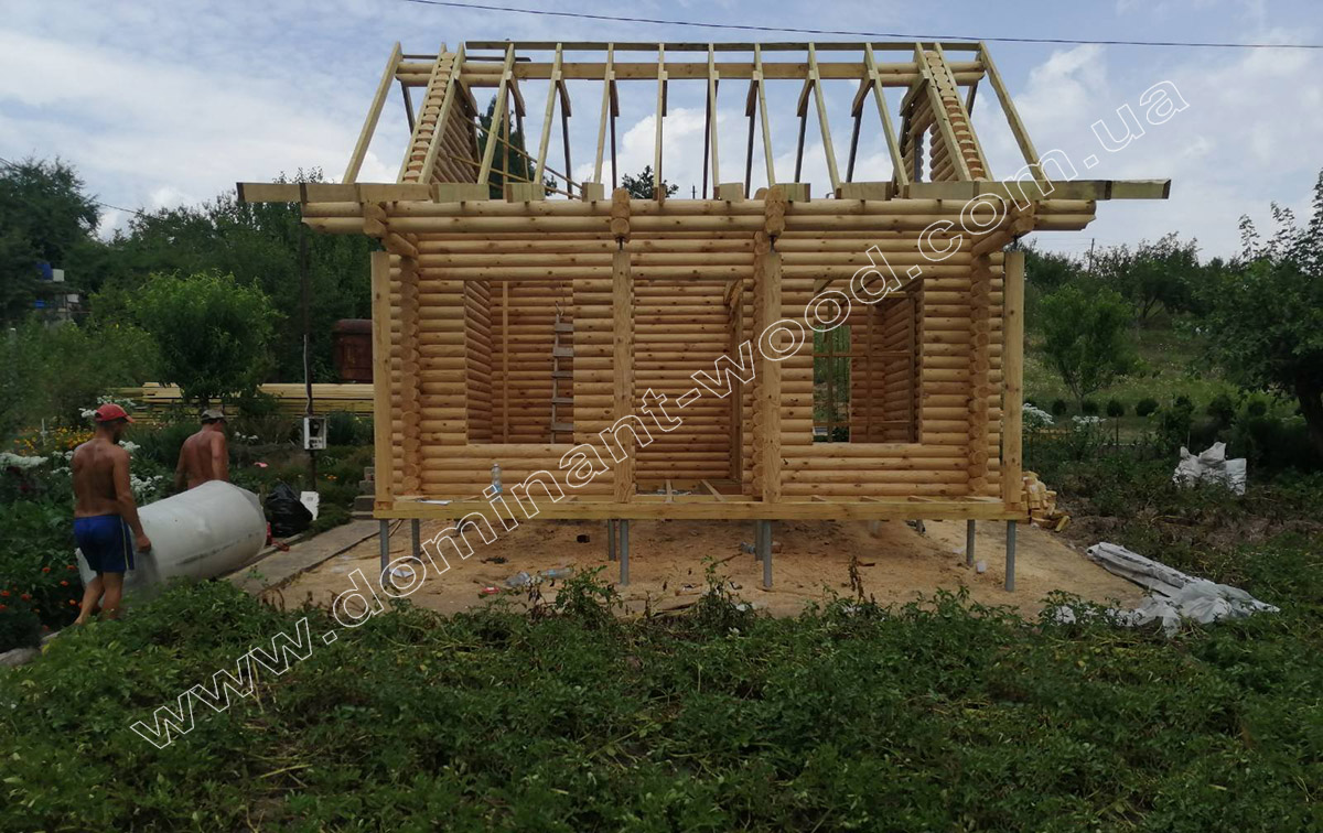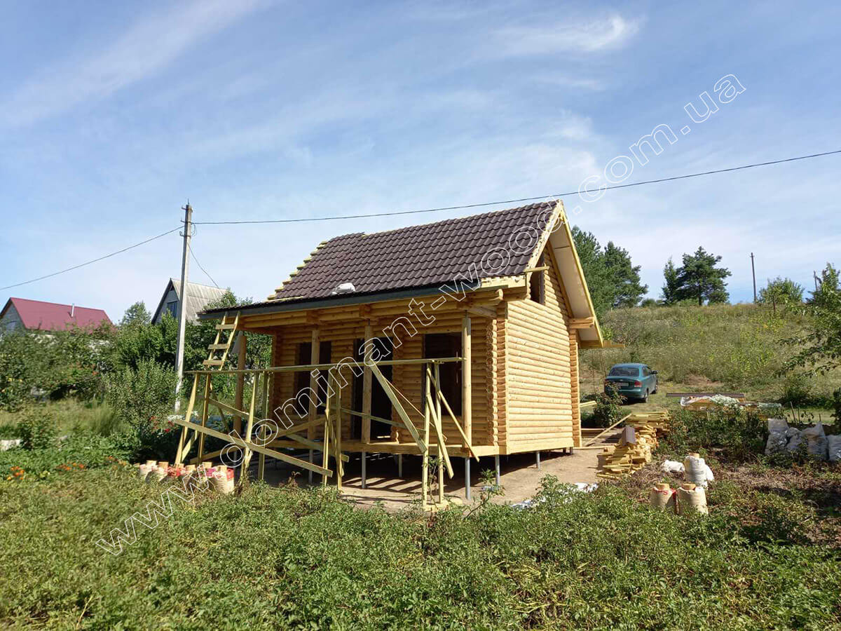 Побудований за проектом «Інфант2», котедж виглядає акуратно і компактно. Як бачимо по фото робіт, будували ми котедж в базовій комплектації, тобто у вигляді коробки під обробку. Плюс за індивідуальним бажанням господарів будиночка, ми доповнили коробку покрівельним покриттям. Інше оснащення господарі залишили на свій розсуд. Для зведення стін був підібраний оциліндрований брус діаметром 160 мм, так як господарі планують використовувати будиночок тільки влітку. Але в такій затишній обстановці обов'язково захочеться перебувати частіше і довше, і тоді краще будувати будинок з колод діаметром 200-220 мм, щоб перетворити котедж в тепле, цілорічне житло.